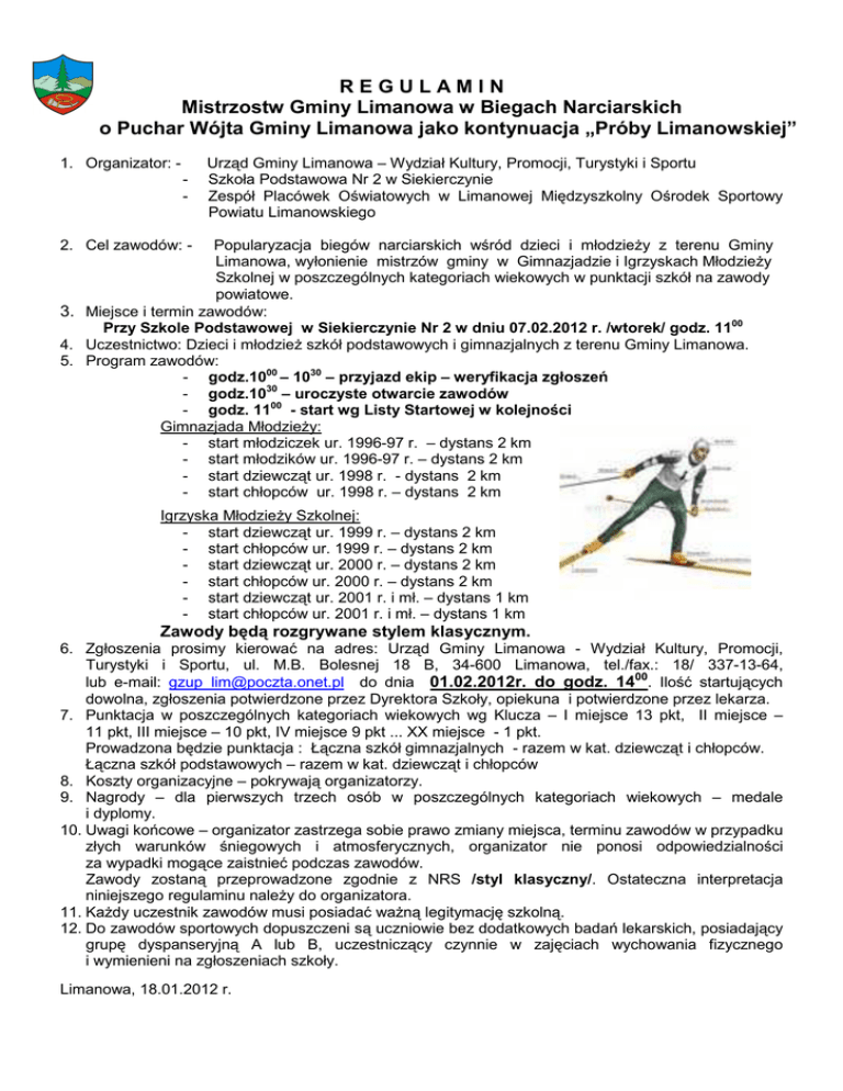 REGULAMIN Mistrzostw Gminy Limanowa w Biegach Narciarskich o Puchar Wójta Gminy Limanowa jako kontynuacja „Próby Limanowskiej” 1. Organizator: - Urząd Gminy Limanowa – Wydział Kultury, Promocji, Turystyki i Sportu Szkoła Podstawowa Nr 2 w Siekierczynie Zespół Placówek Oświatowych w Limanowej Międzyszkolny Ośrodek Sportowy Powiatu Limanowskiego 2. Cel zawodów: - Popularyzacja biegów narciarskich wśród dzieci i młodzieży z terenu Gminy Limanowa, wyłonienie mistrzów gminy w Gimnazjadzie i Igrzyskach Młodzieży Szkolnej w poszczególnych kategoriach wiekowych w punktacji szkół na zawody powiatowe. 3. Miejsce i termin zawodów: Przy Szkole Podstawowej w Siekierczynie Nr 2 w dniu 07.02.2012 r. /wtorek/ godz. 1100 4. Uczestnictwo: Dzieci i młodzież szkół podstawowych i gimnazjalnych z terenu Gminy Limanowa. 5. Program zawodów: - godz.1000 – 1030 – przyjazd ekip – weryfikacja zgłoszeń - godz.1030 – uroczyste otwarcie zawodów - godz. 1100 - start wg Listy Startowej w kolejności Gimnazjada Młodzieży: - start młodziczek ur. 1996-97 r. – dystans 2 km - start młodzików ur. 1996-97 r. – dystans 2 km - start dziewcząt ur. 1998 r. - dystans 2 km - start chłopców ur. 1998 r. – dystans 2 km Igrzyska Młodzieży Szkolnej: - start dziewcząt ur. 1999 r. – dystans 2 km - start chłopców ur. 1999 r. – dystans 2 km - start dziewcząt ur. 2000 r. – dystans 2 km - start chłopców ur. 2000 r. – dystans 2 km - start dziewcząt ur. 2001 r. i mł. – dystans 1 km - start chłopców ur. 2001 r. i mł. – dystans 1 km Zawody będą rozgrywane stylem klasycznym. 6. Zgłoszenia prosimy kierować na adres: Urząd Gminy Limanowa - Wydział Kultury, Promocji, Turystyki i Sportu, ul. M.B. Bolesnej 18 B, 34-600 Limanowa, tel./fax.: 18/ 337-13-64, lub e-mail: [email protected] do dnia 01.02.2012r. do godz. 1400. Ilość startujących dowolna, zgłoszenia potwierdzone przez Dyrektora Szkoły, opiekuna i potwierdzone przez lekarza. 7. Punktacja w poszczególnych kategoriach wiekowych wg Klucza – I miejsce 13 pkt, II miejsce – 11 pkt, III miejsce – 10 pkt, IV miejsce 9 pkt ... XX miejsce - 1 pkt. Prowadzona będzie punktacja : Łączna szkół gimnazjalnych - razem w kat. dziewcząt i chłopców. Łączna szkół podstawowych – razem w kat. dziewcząt i chłopców 8. Koszty organizacyjne – pokrywają organizatorzy. 9. Nagrody – dla pierwszych trzech osób w poszczególnych kategoriach wiekowych – medale i dyplomy. 10. Uwagi końcowe – organizator zastrzega sobie prawo zmiany miejsca, terminu zawodów w przypadku złych warunków śniegowych i atmosferycznych, organizator nie ponosi odpowiedzialności za wypadki mogące zaistnieć podczas zawodów. Zawody zostaną przeprowadzone zgodnie z NRS /styl klasyczny/. Ostateczna interpretacja niniejszego regulaminu należy do organizatora. 11. Każdy uczestnik zawodów musi posiadać ważną legitymację szkolną. 12. Do zawodów sportowych dopuszczeni są uczniowie bez dodatkowych badań lekarskich, posiadający grupę dyspanseryjną A lub B, uczestniczący czynnie w zajęciach wychowania fizycznego i wymienieni na zgłoszeniach szkoły. Limanowa, 18.01.2012 r.
