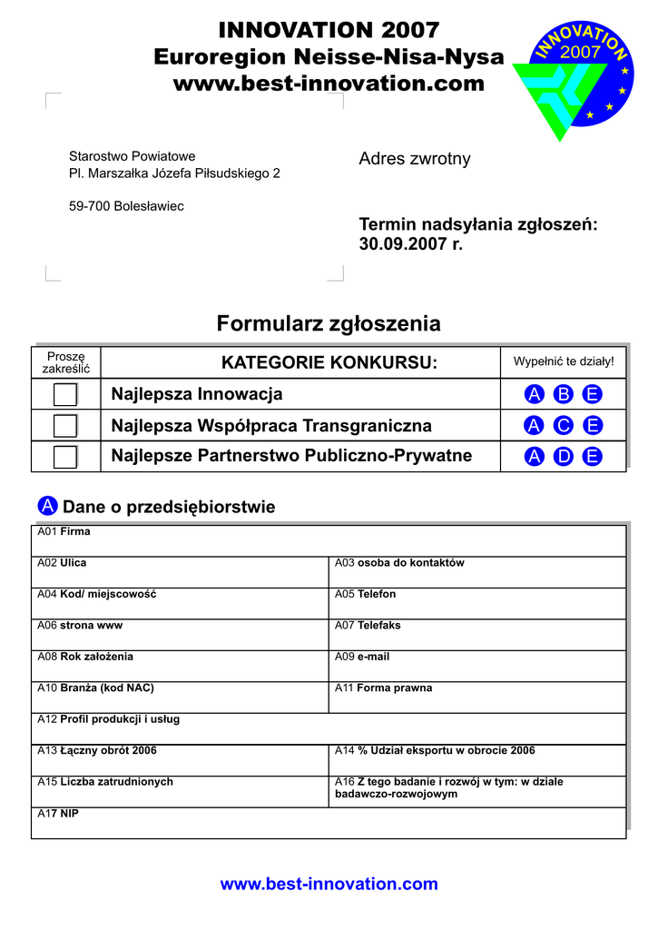 INNOVATION 2007 Euroregion Neisse-Nisa-Nysa www.best-innovation.com Starostwo Powiatowe Pl. Marszałka Józefa Piłsudskiego 2 2007 Adres zwrotny 59-700 Bolesławiec Termin nadsyłania zgłoszeń: 30.09.2007 r. Formularz zgłoszenia Proszę zakreślić KATEGORIE KONKURSU: Wypełnić te działy! Najlepsza Innowacja A B E Najlepsza Współpraca Transgraniczna A C E Najlepsze Partnerstwo Publiczno-Prywatne A D E A Dane o przedsiębiorstwie A01 Firma A02 Ulica A03 osoba do kontaktów A04 Kod/ miejscowość A05 Telefon A06 strona www A07 Telefaks A08 Rok założenia A09 e-mail A10 Branża (kod NAC) A11 Forma prawna A12 Profil produkcji i usług A13 Łączny obrót 2006 A14 % Udział eksportu w obrocie 2006 A15 Liczba zatrudnionych A16 Z tego badanie i rozwój w tym: w dziale badawczo-rozwojowym A17 NIP www.best-innovation.com B Kategoria BEST INNOVATION (Najlepsza Innowacja) B01 Przedmiot zgłoszenia B02 Opis przedmiotu zgłoszenia dołączyć w formie załącznika. Należy przedstawić stan techniczny, opis innowacji w produkcie / technologii w porównaniu z aktualnym stanem techniki oraz różnice produktu/ technologii w porównaniu z konkurencją Obrót osiągnięty dzięki przedmiotowi zgłoszenia (produkt/ technologia) B03 w 2006 r. B04 w 2005 r. B05 Jeżeli nie zostały zrealizowane żadne obroty, należy załączyć dokumenty poświadczające złożone zamówienia w 2007 roku. B06 Nakłady na rozwój (w tys. €) B07 Czas trwania prac rozwojowych B08 Prawa ochronne (np. zrealizowane zgłoszenia patentowe) B09 Liczba utrzymanych miejsc pracy w przedsiębiorstwie dzięki wprowadzeniu nowego produktu/ nowej technologii B10 Liczba nowoutworzonych miejsc pracy/miejsc nauki zawodu w przedsiębiorstwie na terenie Euroregionu B11 Stosowanie standardów europejskich przy produkcie/technologii. C Kategoria BEST PARTNERSHIP (Najlepsza Współpraca Transgraniczna) I. Dane o Kooperancie: C01 Firma C02 Ulica C03 Osoba do kontaktu C04 Kod/ miejscowość C05 Telefon C06 strona www C07 Telefaks C08 Rok założenia C09 e-mail C10 Branża (kod NAC) C11 Forma prawna C12 Profil produkcji i usług C13 Łączny obrót 2006 C14 % Udział eksportu w obrocie 2006 C15 Liczba zatrudnionych C16 W tym w dziale badawczo-rozwojowym C17 NIP Dane o innych kooperantach należy podać w formie załącznika! Struktura danych powinna odpowiadać strukturze danych dotyczących pierwszego kooperanta. II. Dane dotyczące współpracy: C18 Przedmiot współpracy C19 Czas trwania współpracy (w miesiącach) C20 Udział kooperacji w całości obrotów (%) C Kategoria BEST PARTNERSHIP (Najlepsza Współpraca Transgraniczna) II. Dane dotyczące współpracy: C21 Synergie współpracy (opis współpracy w formie załącznika) C22 Liczba zapewnionych miejsc pracy u kooperantów dzięki współpracy C23 Liczba nowo-ew. dodatkowo utworzonych miejsc pracy u kooperantów C24 Wartość współpracy (w tys €) Rozwój obrotów od początku współpracy C25 w roku 2006 C27 Wspólne innowacje (produkty/ technologie) C26 w roku 2005 D Kategoria BEST PRIVATE PUBLIC PARTNERSHIP (Najlepsze Partnerstwo Publiczno-Prywatne) I. Dane o instytucji publicznej: D01 Firma/ nazwa D02 Ulica D03 Osoba do kontaktów D04 Kod/ miejscowość D05 Telefon D06 strona www D07 Telefaks D08 Rok założenia D09 e-mail D10 Branża (kod NAC) D11 Forma prawna D12 Profil produkcji i usług D13 Łączny obrót 2006 D14 Liczba zatrudnionych D15 NIP II. Dane o partnerstwie: D16 Forma partnerstwa D17 Cel partnerstwa D18 Forma udziału partnerów (finanse, personel, know-how) D19 Osiągnięte wyniki (korzyści dla obu partnerów) D20 Czas trwania partnerstwa (w miesiącach) D21 Umowne regulacje partnerstwa E Dane końcowe Do zgłoszenia należy załączyć następujące informacje (właściwe proszę zakreślić): Opis przedmiotu zgłoszenia (B02) Potwierdzenia zamówień (B05) Kooperanci (C01-C17) Opis kooperacji (C18) Opis partnerstwa (D16) Zdjęcia przedmiotu zgłoszenia (2 szt.) w formie elektronicznej Krótki opis przedmiotu zgłoszenia w celu publikacji (maks. ½ strony formatu A4) Niniejszym potwierdzam rzetelność prawidłowość powyższych informacji i wyrażam zgodę na publikację materiałów związanych z moim uczestnictwem w Konkursie. Pieczęć, podpis Miejscowość, data Partnerami w realizacji projektu: Nagroda INNOVATION 2006 BEST INNOVATION Marketing-Gesellschaft Oberlausitz-Niederschlesien mbH Euroregion Neisse-Nisa-Nysa 1. Miejsce GALAXY HIGH TECHNOLOGY s.r.o., Liberec 2. Miejsce Kret i S-ka, Chojnów 3. Miejsce Hess Lichttechnik GmbH, Löbau BEST PARTNERSHIP Fundacja Paul-Weiland-Stiftung -pomoc w rozwoju gospodarkiIzba Przemysłowo-Handlowa IHK Dresden - Oddział w Zittau (żytawie) ETB - Eurotransfer- und Beratungsring Neisse e.V. Powiatowa Izba Gospodarcza w Libercu Powiat Bolesławiecki 1. Miejsce Fahrradpool Lausitz und Nisa o. p. s., REGIO Máchova kraje, a.s. 2. Miejsce Miejski Ośrodek Sportu i Rekreacji,Bolesławiec und Landratsamt Bautzen 3. Miejsce POBOZAM s.r.o., Jablonec nad Nisou und SSL Maschinenbau GmbH, Eibau BEST PRIVATE PUBLIC PARTNERSHIP 1. Miejsce Střední průmyslová škola stavební, Liberec und Berufsförderwerk Bau Sachsen e.V., Bautzen 2. Miejsce BVMW Oberlausitz und Städte und Gemeinden der Oberlausitz 3. Miejsce Kulturlichtung Honigbrunnen e.V., Löbau und MBE - Maschinenbau GmbH, Eibau Bolesławieckie Towarzystwo Gospodarcze, Bolesławiec www.best-innovation.com