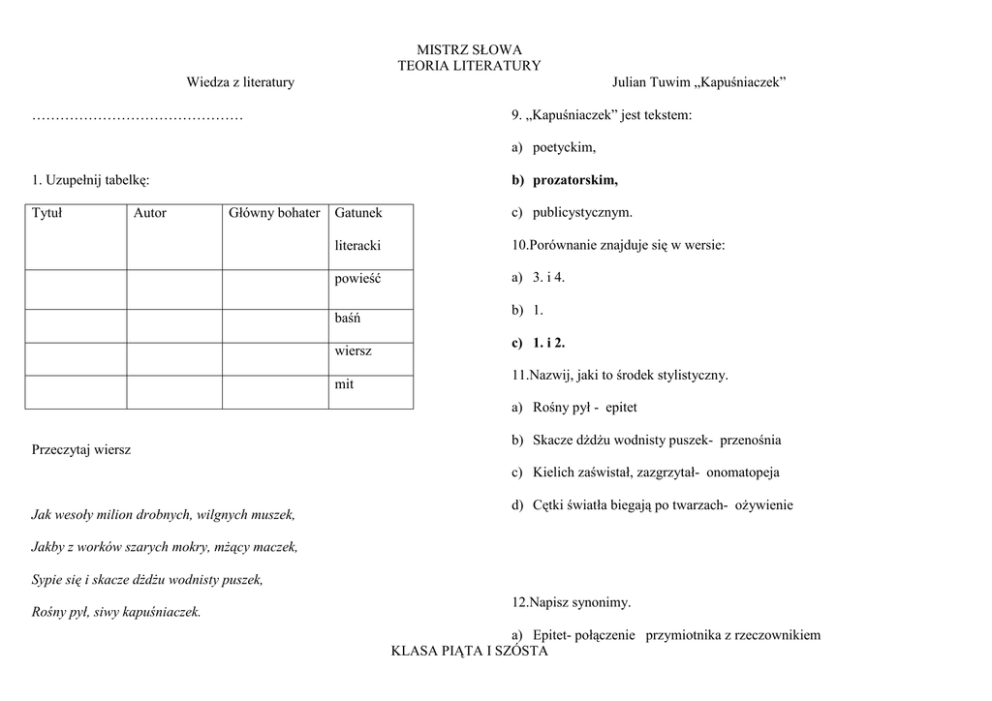 MISTRZ SŁOWA TEORIA LITERATURY Julian Tuwim „Kapuśniaczek” Wiedza z literatury ……………………………………… 9. „Kapuśniaczek” jest tekstem: a) poetyckim, 1. Uzupełnij tabelkę: Tytuł Autor b) prozatorskim, Główny bohater Gatunek c) publicystycznym. literacki 10.Porównanie znajduje się w wersie: powieść a) 3. i 4. baśń wiersz mit b) 1. c) 1. i 2. 11.Nazwij, jaki to środek stylistyczny. a) Rośny pył - epitet Przeczytaj wiersz b) Skacze dżdżu wodnisty puszek- przenośnia c) Kielich zaświstał, zazgrzytał- onomatopeja Jak wesoły milion drobnych, wilgnych muszek, d) Cętki światła biegają po twarzach- ożywienie Jakby z worków szarych mokry, mżący maczek, Sypie się i skacze dżdżu wodnisty puszek, Rośny pył, siwy kapuśniaczek. 12.Napisz synonimy. a) Epitet- połączenie przymiotnika z rzeczownikiem KLASA PIĄTA I SZÓSTA MISTRZ SŁOWA TEORIA LITERATURY b) Przenośnia- nazwanie czegoś w inny sposób niż się nazywa np. Ludzie je pełnią i cienie, Ja jestem grze ich przytomny. wodospad splywa mu z twarzy a b okalający, sąsiadujący c) Onomatopeja- wyraz dźwięko naśladowczy 14. Wyjaśnij pojęcia: d) Strofa- zwrotka a) sufler- osoba podpowiadająca aktorom tekst e) Wers- jedna linijka wiersza b) rekwizyt-przedmiot potrzebny w sztuce f) Osoba mówiąca w wierszu- narrator c) scenografia- dekorację g) Uosobienie- nadanie rzeczą, rośliną, zwierzętom cech ludzkich 13. Nazwij rodzaje rymów. e) afisz- światło a) Szlachetne zdrowie, a Nikt się nie dowie, d) kurtyna- zasłona ( szmata ) f) didaskalia - ……………………………………………….. a Jako smakujesz, b Aż się zepsujesz. b 15. Dokończ porównania: sąsiadujący, parzysty a) silny jak lew b) biały jak śnieg b) Na ziarnku maku stoi dom, a Pieski szczekają na księżyc makowy b I nigdy jeszcze tym makowym psom, a Że jest świat większy nie przyszło do głowy. b c) piękny jak kwiat 16. Podkreśl dwa elementy konieczne, aby zaistniało przedstawienie krzyżowy, przeplatany teatralne. c) Teatr mój widzę ogromny, a Wielkie powietrzne przestrzenie, b KLASA PIĄTA I SZÓSTA MISTRZ SŁOWA TEORIA LITERATURY Aktor, partytura, słowo, podmiot liryczny, dekoracja, świat przedstawiony, scena, widz, światło, muzyka. 18. Podaj imię i nazwisko znanego ci: a) Bajkopisarza - Ignacy Krasicki 17. Wpisz we właściwe miejsce w tabeli poniższe pojęcia: b) Powieściopisarza - Henryk Sienkiewicz Czas akcji, podmiot liryczny, didaskalia, akt, scena, miejsce akcji, c) Poety - Jan Brzechwa bohater główny, fabuła, wątek, epizod, podział na role, metafora, d) Baśniopisarza – Hans Christian Andersen sytuacja liryczna, rym, rytm, poeta, dramaturg, pisarz, komedia, e) Dramaturga - Jan Paradowski sonet, mit 19. Wyjaśnij, czym jest: Epika Liryka a) Legenda – to opowieść która zawiera trochę prawdy Dramat Czas akcji podmiot liryczny didaskalia b) Mit – to opowieści o bogach i herosach greckich miejsce akcji metafora akt c) Baśń - jest to zmyślone opowiadanie bohater główny sytuacja liryczna scena d) Powieść – ma jeden wątek fabuła rym podział na role e) Dramat – ma wiele wątków wątek rytm dramaturg epizod poeta komedia a) Skrzydlaty koń 1, Charon pisarz sonet mit b) Król ukarany za plotki 2. Pegaz c) Bożek śmierci 3.Syzyf 20. Jaka to postać?: d) Przewoźnik po rzece Styks KLASA PIĄTA I SZÓSTA 4. Tanatos MISTRZ SŁOWA TEORIA LITERATURY A2 B3 C4 D1 KLASA PIĄTA I SZÓSTA MISTRZ SŁOWA TEORIA LITERATURY KLASA PIĄTA I SZÓSTA