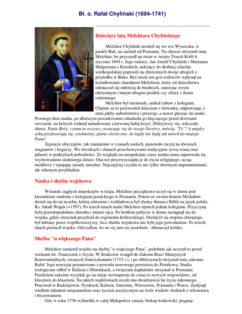 Bł. o. Rafał Chyliński (1694-1741) Dziecięce lata Melchiora Chylińskiego Melchior Chyliński urodził się we wsi Wysoczka, w parafii Buk, na zachód od Poznania. Na chrzcie otrzymał imię Melchior, bo przyszedł na świat w święto Trzech Króli 6 stycznia 1694 r. Jego rodzice, Jan Arnolf Chyliński i Marianna Małgorzata z Kierskich, należący do drobnej szlachty wielkopolskiej poprosili na chrzestnych dwoje ubogich z przytułku w Buku. Być może ten gest rodziców wpłynął na kształtowanie charakteru Melchiora, który od dzieciństwa odznaczał się miłością do biednych, zanosząc swym chrzestnym i innym ubogim posiłek czy ofiary z domu rodzinnego. Melchior był nieśmiały, unikał zabaw z kolegami. Chętnie za to przewodził dzieciom z folwarku, odprawiając z nimi jakby nabożeństwa i procesje, a nawet głosząc im nauki. Pewnego dnia matka, po dłuższym poszukiwaniu odnalazła go klęczącego przed drzwiami owczarni, na których widniał namalowany czerwoną farbą krzyż. Zbliżywszy się, usłyszała słowa: Panie Boże, czemu to wszyscy zwracając się do swego Stwórcy, mówią: "Ty"? A między sobą pozdrawiają się: wielmożny, jaśnie oświecony. Ja nigdy nie będę tak mówił do mojego Pana! Zepsucie obyczajów, tak znamienne w czasach saskich, panowało raczej na dworach magnatów i bogaczy. We dworkach i chatach przechowywano tradycyjnie żywą wiarę oraz pilność w praktykach pobożności. Ze względu na niespokojne czasy matka sama zajmowała się wychowaniem siedmiorga dzieci. Ona też przyzwyczajała je do życia religijnego, ucząc modlitwy i wpajając zasady moralne. Najczęściej czyniła to nie tylko słownymi napomnieniami, ale własnym przykładem. Nauka i służba wojskowa Wskutek ciągłych niepokojów w kraju, Melchior początkowo uczył się w domu pod kierunkiem studenta z kolegium jezuickiego w Poznaniu. Potem ze swoim bratem Michałem dostał się do tej uczelni, której rektorem i wykładowcą był słynny tłumacz Biblii na język polski, Ks. Jakub Wujek (+1597). Po trzech latach nauki Melchior opuścił jednak kolegium. Przyczyną była prawdopodobnie choroba i śmierć ojca. Po krótkim pobycie w domu zaciągnął się do wojska, gdzie otrzymał przydział do regimentu królewskiego. Dosłużył się stopnia chorążego, był lubiany przez współtowarzyszy, lecz służba wojskowa nie była jego powołaniem. Po trzech latach porzucił wojsko. Odszedłem, bo mi się tam nie podobało - tłumaczył krótko. Służba "u większego Pana" Melchior zamienił wojsko na służbę "u większego Pana", podobnie jak uczynił to przed wiekami św. Franciszek z Asyżu. W Krakowie wstąpił do Zakonu Braci Mniejszych Konwentualnych, zwanych franciszkanami (1715 r.), i po obłóczynach otrzymał imię zakonne Rafał. Jego nowicjat przeniesiono z powodu morowego powietrza do Piotrkowa. Studia teologiczne odbył w Kaliszu i Obornikach, a święcenia kapłańskie otrzymał w Poznaniu. Przełożeni zakonni wysyłali go na misje wewnętrzne do coraz to nowych województw, od klasztoru do klasztoru. Na takich wędrówkach zeszło mu dwadzieścia lat życia zakonnego. Pracował w Radziejowie, Pyzdrach, Kaliszu, Gnieźnie, Warszawie, Poznaniu i Warce. Zasłynął wielkim talentem misjonarskim oraz życiem ascetycznym na wzór wieków średnich z włosienicą i biczowaniem. Gdy w roku 1736 wybuchła w całej Małopolsce zaraza, biskup krakowski, pragnąc zabezpieczyć duchową opiekę nad chorymi, rozporządził, aby zakony oddelegowały odpowiednich kapłanów. O. Rafał zgłosił się do Krakowa na kapelana i pielęgniarza. Prosił, by mu wyznaczano stałe dyżury w szpitalu. Warunki były tam okropne. Bogaci mieszkańcy miasta oraz lekarze w obawie przed epidemią wyjechali w inne okolice. Pozostała tylko biedota bez żadnych lekarstw i bez zorganizowanej pomocy sanitarnej. Według zeznań świadków o. Rafał przystępował bez obrzydzenia do ludzi leżących w barłogach, z których wydzielał się niesamowity smród. Posilał ich czym mógł, pokrzepiał rozdając chleb, pocieszając, słuchając spowiedzi, a zmarłych grzebał. To był inny rodzaj żołnierki niż ten, który uprawiał w wojsku, z codziennym narażeniem własnego życia. Ale w tej służbie wiedział przynajmniej, że nie wojuje o złą sprawę. Najdłużej o. Chyliński przebywał w Łagiewnikach, gdzie również powierzono mu opiekę nad żebrakami. Wielu ich przyciągało sanktuarium św. Antoniego Padewskiego - miejsce licznych odpustów i pielgrzymek. Tam właśnie o. Rafał zasłynął jako wielki opiekun chorych, ubogich i nieszczęśliwych, a także jako spowiednik, pokutnik i egzorcysta. Szukali u niego pomocy dla swych dusz i ciał nie tylko chorzy i bezdomni, ale i ludzie ze szlacheckich rodów. W swoim miłosierdziu o. Rafał posuwał się tak daleko, że oddawał swój płaszcz czy bieliznę, a spiżarnia klasztorna za jego przyczyną nieraz świeciła pustką. Nie szczędzono mu więc uszczypliwych słów, nazywając "dziadowskim biskupem". Życie błogosławionego "protestem i ekspiacją" Pełne pokuty i cierpienia życie o. Rafała Chylińskiego trwało zaledwie 47 lat. Umarł w Łagiewnikach w grudniu 1741 r. O ile za życia uznawano jego wielkie miłosierdzie i moc pokuty, o tyle po śmierci wsławił się wieloma cudami. Legenda mówi, że o. Rafał miał sam przypomnieć się swoim współbraciom. Oto do klasztoru przybyła pewna niewiasta, aby podziękować franciszkanom za chleb, który otrzymała od jednego z ojców. Nikt w klasztorze nie przyznawał się jednak do tego czynu miłosierdzia. - Nie ma go tutaj - przyznawała owa niewiasta - ale łatwo go rozpoznam, bo gdy pochylał się nad piecem, by się ogrzać, z paleniska wypadł rozżarzony węgielek i wypalił mu dziurę w habicie. Nie ustępowała nawet na wyraźne stwierdzenie gwardiana, że widziała już wszystkich braci, którzy mieszkają w łagiewnickim klasztorze. - A ten, no ten na obrazie??