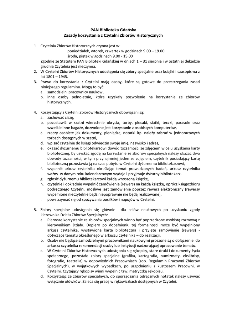 PAN Biblioteka Gdańska Zasady korzystania z Czytelni Zbiorów Historycznych 1. Czytelnia Zbiorów Historycznych czynna jest w: poniedziałek, wtorek, czwartek w godzinach 9.00 – 19.00 środa, piątek w godzinach 9.00 - 15.00 Zgodnie ze Statutem PAN Biblioteki Gdańskiej w dniach 1 – 31 sierpnia i w ostatniej dekadzie grudnia Czytelnia jest nieczynna. 2. W Czytelni Zbiorów Historycznych udostępnia się zbiory specjalne oraz książki i czasopisma z lat 1801 – 1945. 3. Prawo do korzystania z Czytelni mają osoby, które są gotowe do przestrzegania zasad niniejszego regulaminu. Mogą to być: a. samodzielni pracownicy naukowi, b. inne osoby pełnoletnie, które uzyskały pozwolenie na korzystanie ze zbiorów historycznych. 4. Korzystający z Czytelni Zbiorów Historycznych obowiązani są: a. zachować ciszę, b. pozostawić w szatni wierzchnie okrycia, torby, plecaki, siatki, teczki, parasole oraz wszelkie inne bagaże, dozwolone jest korzystanie z osobistych komputerów, c. rzeczy osobiste jak dokumenty, pieniądze, notatki itp. należy zabrać w jednorazowych torbach dostępnych w szatni, d. wpisać czytelnie do księgi odwiedzin swoje imię, nazwisko i adres, e. okazać dyżurnemu bibliotekarzowi dowód tożsamości ze zdjęciem w celu uzyskania karty bibliotecznej, by uzyskać zgodę na korzystanie ze zbiorów specjalnych należy okazać dwa dowody tożsamości, w tym przynajmniej jeden ze zdjęciem, czytelnik posiadający kartę biblioteczną pozostawia ją na czas pobytu w Czytelni dyżurnemu bibliotekarzowi, f. wypełnić arkusz czytelnika określając temat prowadzonych badań, arkusz czytelnika ważny w danym roku kalendarzowym wydaje i przyjmuje dyżurny bibliotekarz, g. zgłosić dyżurnemu bibliotekarzowi każdą wnoszoną książkę, h. czytelnie i dokładnie wypełnić zamówienie (rewers) na każdą książkę, oprócz księgozbioru podręcznego Czytelni, możliwe jest zamówienie poprzez rewers elektroniczny (rewersy wypełnione nieczytelnie bądź niepoprawnie nie będą realizowane), i. powstrzymać się od spożywania posiłków i napojów w Czytelni. 5. Zbiory specjalne udostępnia się głównie dla celów naukowych po uzyskaniu zgody kierownika Działu Zbiorów Specjalnych: a. Pierwsze korzystanie ze zbiorów specjalnych winno być poprzedzone osobistą rozmową z kierownikiem Działu. Dopiero po dopełnieniu tej formalności może być wypełniony arkusz czytelnika, wystawiona karta biblioteczna i przyjęte zamówienie (rewers) dotyczące tematu określonego w arkuszu czytelnika – do realizacji. b. Osoby nie będące samodzielnymi pracownikami naukowymi proszone są o dołączenie do arkusza czytelnika rekomendacji osoby lub instytucji nadzorującej opracowanie tematu. c. W Czytelni Zbiorów Historycznych udostępnia się rękopisy, stare druki i dokumenty życia społecznego, pozostałe zbiory specjalne (grafika, kartografia, numizmaty, ekslibrisy, fotografie, teatralia) w odpowiednich Pracowniach (zob. Regulamin Pracowni Zbiorów Specjalnych), w wyjątkowych wypadkach, po uzgodnieniu z kustoszem Pracowni, w Czytelni. Czytający rękopisy winni wypełnić tzw. metryczkę rękopisu. d. Korzystając ze zbiorów specjalnych, do sporządzania odręcznych notatek należy używać wyłącznie ołówków. Zaleca się pracę w rękawiczkach dostępnych w Czytelni. 6. Ustala się następujący tryb zamawiania materiałów: a. Maksymalna liczba jednocześnie złożonych rewersów nie może być większa niż 5. b. Realizacja zamówień na zbiory specjalne odbywa się w godzinach od 9.00 - 14.30. Rewersy złożone po godzinie 14.30 realizowane są w dniu następnym. Książki i czasopisma z lat 1801 – 1945 można zamawiać nie później niż 30 minut przed zamknięciem Czytelni. c. Na materiały z księgozbiorów podręcznych wybranych Działów i Pracowni zamówienia należy składać do godz. 15.00. Zamówienia złożone po godz. 15.00 będą realizowane w dniu następnym. d. Niezależnie od powyższego, czytelnik (zwłaszcza zamiejscowy) może u dyżurnego bibliotekarza złożyć zamówienie ustnie, telefonicznie lub listownie na dzień następny lub inny z konkretną datą i godziną realizacji. e. Czasopisma i inne publikacje, które zostały zmikrofilmowane lub zdigitalizowane, udostępnia się tylko w postaci kopii. W przypadku zamawiania mikrofilmów z czasopism lub dzieł tomowych ogranicza się liczbę szpul jednocześnie udostępnianych do 8 sztuk. Po zakończeniu korzystania z mikrofilmu czytelnik jest zobowiązany przewinąć mikrofilm do początku. f. Zamówione obiekty mogą być na życzenie czytelnika odkładane na okres 5 dni. Niewykorzystane zostaną wycofane z Czytelni. 7. Wyjątkowo cenne obiekty i obiekty dużego formatu udostępnia się pojedynczo. Udostępnienie kolejnego obiektu następuje po zwrocie poprzedniego. Bezcenne obiekty (unikaty) zasadniczo nie są udostępniane. Zgody na udostępnienie tych obiektów udziela indywidualnie Dyrektor Biblioteki. 8. Dostęp do księgozbioru podręcznego w Czytelni Zbiorów Historycznych jest wolny, wykorzystaną książkę należy odłożyć na najbliższym wolnym stole. 9. Reprodukowanie zbiorów: a. Zgoda na korzystanie ze zbiorów nie jest równoznaczna ze zgodą na ich reprodukowanie. Na wykonanie wszelkiego rodzaju reprodukcji czytelnik obowiązany jest uzyskać formalną zgodę. Zbiory wymagające szczególnej ochrony nie mogą być reprodukowane. b. Reprodukowanie odbywa się w firmie Mikrofilm-Center wg zasad tej pracowni. Zamówienia na wszelkie usługi reprograficzne należy składać na specjalnych drukach u bibliotekarza dyżurnego. Termin wykonania zlecenia zamawiający uzgadnia z pracownikiem firmy Mikrofilm-Center osobiście lub telefonicznie (301- 22 – 51 wew. 331) od 9.00 do 14.00. Tam też kieruje ewentualne reklamacje. c. Fotografowanie zbiorów specjalnych własnym sprzętem wymaga zgody kierownika Działu Zbiorów Specjalnych, fotografowanie zbiorów z lat 1801 – 1945 wyma