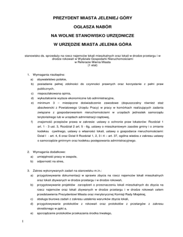 PREZYDENT MIASTA JELENIEJ GÓRY OGŁASZA NABÓR NA WOLNE STANOWISKO URZĘDNICZE W URZĘDZIE MIASTA JELENIA GÓRA stanowisko ds. sprzedaży na rzecz najemców lokali mieszkalnych oraz lokali w drodze przetargu i w drodze rokowań w Wydziale Gospodarki Nieruchomościami w Referacie Mienia Miasta (1 etat) 1. Wymagania niezbędne: a) obywatelstwo polskie, b) posiadanie pełnej zdolności do czynności prawnych oraz korzystanie z pełni praw publicznych, c) nieposzlakowana opinia, d) wykształcenie wyższe ekonomiczne lub administracyjne, e) minimum 3 – miesięczne doświadczenie zawodowe (dopuszczalny również staż absolwencki z Powiatowego Urzędu Pracy) w pracy w komórkach realizujących zadania związane z gospodarowaniem nieruchomościami w urzędach jednostek samorządu terytorialnego lub w urzędach administracji rządowej, f) znajomość przepisów prawa w zakresie: ustawy o ochronie praw lokatorów: Rozdział 1 art. 1 - 3 ust. 3, Rozdział 2 art. 5 - 6g, ustawy o mieszkaniowym zasobie gminy i o zmianie kodeksu cywilnego, ustawy o własności lokali, ustawy o gospodarce nieruchomościami: Dział I - art. 4, 6 oraz Dział II Rozdział 1, 2, 3 i 4 – art. 37, ogólna wiedza z zakresu ustawy o samorządzie gminnym oraz kodeksu postępowania administracyjnego. 2. Wymagania dodatkowe: a) umiejętność pracy w zespole, b) odporność na stres, 3. Zakres wykonywanych zadań na stanowisku m.in.: a) przygotowywanie dokumentacji w sprawie zbycia na rzecz najemców lokali mieszkalnych oraz lokali zbywanych w drodze przetargu i w drodze rokowań, b) przygotowywanie projektów zarządzeń o przeznaczeniu lokali mieszkalnych do zbycia na rzecz najemców oraz lokali zbywanych w drodze przetargu i w drodze rokowań celem przedstawienia Prezydentowi Miasta oraz merytorycznej Komisji Rady Miejskiej, c) obsługa biurowa zadań z zakresu ustalenia warunków zbycia lokali, d) przygotowywanie protokołów z rokowań oraz protokołów z przetargów z zakresu określonego w ppkt a, e) 1 sporządzanie protokołów przekazania środka trwałego, f) przygotowywanie pism w sprawie wyrażenia zgody przez Prezydenta Miasta na wykreślenie hipoteki z ksiąg wieczystych prowadzonych dla lokali sprzedanych przez Miasto Jelenia Góra, g) przygotowywanie dokumentacji w sprawie zmiany formy zabezpieczenia udzielonych bonifikat przy sprzedaży lokali mieszkalnych na rzecz najemców, h) monitorowanie spraw związanych z ewentualnym żądaniem przez Miasto zwrotu udzielonej bonifikaty przy sprzedaży lokali mieszkalnych na rzecz najemców na terenie miasta Jelenia Góra, i) sporządzanie cząstkowego projektu planu finansowego i rzeczowego, j) obsługa biurowa realizowanych procedur, k) utrzymywanie aktualności danych zawartych w Biuletynie Informacji Publicznej (BIP), l) uczestnictwo w organizacji wyborów, spisów oraz referendów. 4. Informacja o warunkach pracy na danym stanowisku: a) praca na I piętrze w budynku przy ul. Ptasiej 2-3, budynek nie jest wyposażony w windę, w pomieszczeniu pracy jest odpowiednia szerokość dojść i przejść, b) stanowisko związane z pracą przy komputerze, pracą w terenie, rozmowami telefonicznymi oraz bezpośrednią obsługą klientów. 5. Wymagane dokumenty: a) życiorys (CV), b) list motywacyjny, c) oświadczenie o treści:” Posiadam pełną zdolność do czynności prawnych oraz korzystam z pełni praw publicznych, nie byłam (byłem) skazana(y) prawomocnym wyrokiem sądu za umyślne przestępstwo ścigane z oskarżenia publicznego lub umyślne przestępstwo skarbowe, d) kopia dokumentu tożsamości, e) kopie dokumentów potwierdzających: wykształcenie /kserokopia dyplomu ukończenia studiów wyższych/, doświadczenie zawodowe /dokumenty potwierdzające minimum 3 – miesięczne doświadczenie zawodowe (dopuszczalny również staż absolwencki z Powiatowego Urzędu Pracy) w pracy w komórkach realizujących zadania związane z gospodarowaniem nieruchomościami w urzędach jednostek samorządu terytorialnego lub w urzędach administracji rządowej, w szczególności: kserokopie świadectw pracy, dokument potwierdzający aktualne zatrudnienie, dokument potwierdzający staż z Powiatowego Urzędu Pracy/. Wymagane dokumenty aplikacyjne należy składać: - w Wydziale Organizacyjnym i Kadr Urzędu Miasta Jelenia Góra ul. Sudecka 29 pok. 18 / I piętro/ z dopiskiem: „Nabór na stanowisko ds. sprzedaży na rzecz najemców lokali mieszkalnych oraz lokali w drodze przetargu i w drodze rokowań w Wydziale Gospodarki Nieruchomościami w Referacie Mienia Miasta” lub - na adres: Wydział Organizacyjny i Kadr Urząd Miasta Jelenia Góra ul. Sudecka 29, 58-500 Jelenia Góra z dopiskiem j/w w terminie do dnia 9 września 2016r. 2 W przypadku osób podejmujących po raz pierwszy pracę na stanowisku urzędniczym umowę o pracę zawiera się na czas określony nie dłuższy niż 6 miesięcy. W czasie trwania umowy organizuje się służbę przygotowawczą kończącą się egzaminem, którego pozytywny wynik jest warunkiem dalszego zatrudnienia pracownika. Przewidywany termin zawarcia umowy o pracę – 1 października 2016r. Ogłoszenie jest opublikowane w Biuletynie Informacji Publicznej Urzędu Miasta Jelenia Góra http://bip.jeleniagora.pl/ oraz wywieszone na tablicach informacyjnych Urzędu Miasta, Pl. Ratuszowy 58 /przybudówka Ratusza - parter /, ul. Sudecka 29. W miesiącu poprzedzającym datę upublicznienia ogłoszenia wskaźnik zatrudnienia osób niepełnosprawnych w Urzędzie Miasta Jelenia Góra w rozumieniu przepisów o rehabilitacji zawodowej i społecznej oraz zatrudnieniu osób niepełnosprawnych wynosił co najmniej 6%. Wymagane dokumenty: list motywacyjny, szczegółowe CV powinny być opatrzone klauzulą: „Wyrażam zgodę na przetwarzanie moich danych osobowych zawartych w ofercie pracy dla potrzeb niezbędnych do realizacji procesu rekrutacji zgodnie z ustawą z dnia 29.08.1997 o ochronie danych osobowych (tj. Dz. U. z 2016r. poz. 922) oraz ustawą z dnia