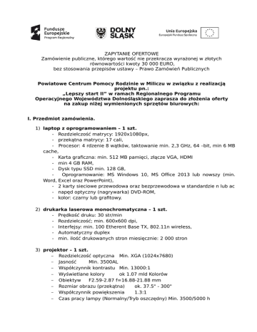ZAPYTANIE OFERTOWE Zamówienie publiczne, którego wartość nie przekracza wyrażonej w złotych równowartości kwoty 30 000 EURO, bez stosowania przepisów ustawy – Prawo Zamówień Publicznych Powiatowe Centrum Pomocy Rodzinie w Miliczu w związku z realizacją projektu pn.: „Lepszy start II” w ramach Regionalnego Programu Operacyjnego Województwa Dolnośląskiego zaprasza do złożenia oferty na zakup niżej wymienionych sprzętów biurowych: I. Przedmiot zamówienia. 1) laptop z oprogramowaniem – 1 szt. - Rozdzielczość matrycy: 1920x1080px, - przekątna matrycy: 17 cali, - Procesor: 4 rdzenie 8 wątków, taktowanie min. 2,3 GHz, 64 –bit, min 6 MB cache, - Karta graficzna: min. 512 MB pamięci, złącze VGA, HDMI - min 4 GB RAM, - Dysk typu SSD min. 128 GB, Oprogramowanie: MS Windows 10, MS Office 2013 lub nowszy (min. Word, Excel oraz PowerPoint), - 2 karty sieciowe przewodowa oraz bezprzewodowa w standardzie n lub ac - napęd optyczny (nagrywarka) DVD-ROM, - kolor: czarny lub grafitowy. 2) drukarka laserowa monochromatyczna – 1 szt. - Prędkość druku: 30 str/min - Rozdzielczość; min. 600x600 dpi, - Interfejsy: min. 100 Etherent Base TX, 802.11n wireless, - Automatyczny duplex - min. ilość drukowanych stron miesięcznie: 2 000 stron 3) projektor – 1 szt. - Rozdzielczość optyczna Min. XGA (1024x7680) - Jasność Min. 3500AL - Współczynnik kontrastu Min. 13000:1 - Wyświetlane kolory ok 1.07 mld Kolorów - Obiektyw F2.59-2.87 f=16.88-21.88 mm - Rozmiar obrazu (przekątna) ok. 37.5" - 300" - Współczynnik powiększenia 1.3:1 - Czas pracy lampy (Normalny/Tryb oszczędny) Min. 3500/5000 h - - Regulacja zniekształcenia trapezowego 2D, Pion, Poziom, 3D pion, Obsługiwana rozdzielczość VGA (640 x 480) do UXGA (1600 x 1200) Częstotliwość pozioma 15K~102KHz Odświeżanie pionowe 23~120Hz Interfejs Computer in (D-sub 15pin), HDMI, Audio in (Mini Jack), Audio L/R in (RCA), Audio out (Mini Jack), Speaker, USB (Type A), (USB Reader & Wireless Display), USB (Type mini B), (Download & UBS display), RJ-45, Kompatybilność HDTV 480i, 480p, 576i, 576p, 720p, 1080i, 1080p Kompatybiliność video NTSC, PAL, SECAM Język menu polski, Akcesoria: Pilot Baterie, Kabel Zasilający, Instrukcja Obsługi, Kabel VGA, Torba, Quick Wireless, NFC Zestaw Oferta powinna być sporządzona w języku polskim. Wszystkie kartki oferty powinny być ponumerowane, trwale spięte oraz zaparafowane przez Oferenta. Ewentualne poprawki w tekście oferty muszą być naniesione w sposób czytelny i zaparafowane. Ofertę można składać na całości lub wybrany sprzęt. II. Termin realizacji zamówienia listopad 2016r. III. Zastrzeżenia: 1.Zamawiający zastrzega sobie prawo zmiany rozpoczęcia realizacji zamówienia, jeżeli wystąpią przyczyny od niego niezależne nieznane w chwili publikowania zapytania ofertowego. 2. Zamawiający zastrzega sobie prawo do nie wyłonienia żadnego z oferentów bez podawania uzasadnienia. 4. Zamawiający zastrzega sobie prawo do odrzucenia ofert ze względów formalnych bez konieczności wzywania oferentów w celu usunięcia braków. IV. Kryterium oceny ofert: 1%=1 pkt K1 - Cena (brutto) 100 % V. Wymagania szczegółowe wobec Oferenta. Do składanej oferty przygotowanej zgodnie z wzorem załącznika nr 1 do niniejszego zapytania ofertowego, Oferent winien dołączyć oświadczenie o spełnianiu warunków udziału w postępowaniu (zał. nr 2). VI. Oferty należy składać do dnia 4 listopada 2016r. (data wpływu do PCPR w Miliczu): 1. Pocztą na adres: Powiatowe Centrum Pomocy Rodzinie, 56-300 Milicz, ul. Trzebnicka 4B lub 2. osobiście w sekretariacie PCPR w Miliczu ul. Trzebnicka 4B Dokumenty, które rozpatrywane. wpłyną po wyżej określonym terminie nie będą VII. Inne informacje: 1. Zamówienie współfinansowane jest ze środków Europejskiego Funduszu Społecznego w ramach Regionalnego programu Operacyjnego Województwa Dolnośląskiego na lata 2014-2020. 2. Uwagi i pytania proszę kierować pod. nr tel. 713841384 (osoba do kontaktu: Katarzyna Szulc) 3. Powiatowe Centrum Pomocy Rodzinie w Miliczu zastrzega sobie prawo do skontaktowania się jedynie z wybranymi oferentami. załącznik nr 1 FORMULARZ OFERTY Przedmiot zamówienia: sprzęt biurowy: laptop z oprogramowaniem, drukarka, projektor Nazwa i adres wykonawcy: Nazwa (imię i nazwisko):…………………………………………………………………………..………. Adres:……………………………………………………………………………………………………….. NIP (w przypadku działalności gospodarczej):………………………………………..……………………… REGON: (w przypadku działalności gospodarczej):…………………………………………………...………. Nr Rachunku Bankowego…………………………………………………...…………………….….………… 1. Oferuję wykonanie przedmiotu zamówienia za kwotę: Dostawa Cena brutto za 1szt. Stawka podatku VAT Laptop z oprogramowaniem drukarka projektor ogółem x 2. Oświadczam, że zapoznałem się z opisem przedmiotu zamówienia i nie wnoszę do niego żadnych zastrzeżeń. 3. Oświadczam, że spełniam wszystkie warunki określone przez Zamawiającego. ……………………., dnia…………. ……………………………… Podpis osoby upoważnionej Załącznik nr 2 do Zapytania ofertowego …………………………………………………………………….. Pieczęć adresowa firmy Wykonawcy OŚWIADCZENIE O SPEŁNIENIU WARUNKÓW UDZIAŁU W POSTĘPOWANIU OKREŚLONYCH W ART. 22 UST. 1 ORAZ O BRAKU PODSTAW DO WYKLUCZENIA NA PODSTAWIE ART. 24 UST. 1 I 2 USTAWY PRAWO ZAMÓWIEŃ PUBLICZNYCH Zgodnie z ustawą z dnia 29 stycznia 2004 r. – Prawo zamówień publicznych (Dz. U. z 2015r. poz. 2164, ze zm.) składając ofertę w postępowaniu o udzielenie zamówienia publicznego oświadczam, jako upoważniony reprezentant Wykonawc