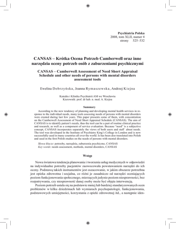 Psychiatria Polska 2008, tom XLII, numer 4 strony 525–532 CANSAS – Krótka Ocena Potrzeb Camberwell oraz inne narzędzia oceny potrzeb osób z zaburzeniami psychicznymi CANSAS – Camberwell Assessment of Need Short Appraisal Schedule and other needs of persons with mental disorders assessment tools Ewelina Dobrzyńska, Joanna Ry m a s z e w s k a , Andrzej K i e j n a Katedra i Klinika Psychiatrii AM we Wrocławiu Kierownik: prof. dr hab. n. med. A. Kiejna Summary According to the new tendency of planning and developing mental health services in response to the individual needs, many tools assessing needs of persons with mental disorders were created during last few years. This paper presents some of them, with concentration on the Camberwell Assessment of Need Short Appraisal Schedule (CANSAS). The aim of CANSAS is to identify patient’s needs, thus the tool can be a part of routine clinical practice and research, as well as a component of service evaluation. Because “need” is a subjective concept, CANSAS incorporates separately the views of both users and staff about needs. The tool was developed in the Institute of Psychiatry King’s College in London and is now successfully used in many countries all over the world. Is has been also translated into Polish and used in the first Polish studies on the needs of persons with mental disorders. Słowa klucze: potrzeby, narzędzia, zaburzenia psychiczne, CANSAS Key words: needs assessment, methods, mental disorders, CANSAS Wstęp Nowa światowa tendencja planowania i tworzenia usług medycznych w odpowiedzi na indywidualne potrzeby pacjentów zaowocowała powstawaniem narzędzi do ich oceny. Podstawą takich instrumentów jest oszacowanie, w jakim obszarze potrzebna jest opieka zdrowotna i socjalna, co różni je zasadniczo od narzędzi oceniających poziom funkcjonowania społecznego, mierzących jedynie poziom niesprawności, bez rozpatrywania, czy niesprawność danej osoby może być objęta interwencją. Poziom potrzeb ustala się na podstawie mniej lub bardziej standaryzowanych ocen problemów w kilku dziedzinach lub wymiarach psychopatologii, funkcjonowania, podstawowych umiejętności, korzystania z opieki zdrowotnej itd., a następnie iden- 526 Ewelina Dobrzyńska i wsp. tyfikacji otrzymywanej lub wymaganej według pacjenta interwencji terapeutycznej oraz wsparcia przez rodzinę czy opiekę społeczną, aż w końcu – na podstawie oceny potrzeby oraz stopnia jej zaspokojenia w opinii profesjonalisty oraz pacjenta. Jeśli dana potrzeba jest zaspokajana przez odpowiednie leczenie czy interwencje socjalne, znika całkowicie lub pozostaje jako potrzeba zaspokojona. Takie rozumienie potrzeb jest w praktyce bardzo korzystne ze względu na to, że ułatwia i usprawnia podejmowanie decyzji klinicznych oraz planowanie psychiatrycznej opieki zdrowotnej. W artykule przedstawiono przegląd narzędzi oceny potrzeb, koncentrując się głównie na Krótkiej Ocenie Potrzeb Camberwell (CANSAS), która istnieje także w polskiej wersji. Narzędzia oceny potrzeb Do oceny potrzeb osób z zaburzeniami psychicznymi wykorzystuje się najczęściej dwa narzędzia: Medical Research Council’s Needs for Care Assessment Schedule (NCAS [1]) oraz Camberwell Assessment of Need (CAN [2]). NCAS jest narzędziem, wypełnianym przez badacza mniej więcej przez półtorej godziny, uwzględniającym potrzeby obejmujące 9 klinicznych (czasem dodatkowo obejmujących alkohol i leki/środki psychoaktywne) oraz 11 społecznych obszarów funkcjonowania. Należą do nich: objawy psychotyczne, neurotyczne, fizyczne, spowolnienie, psychoza organiczna, niebezpieczne zachowania, higiena osobista, prace domowe, zakupy, przygotowywanie posiłków, transport publiczny i udogodnienia, edukacja, zdolności komunikacyjne, pieniądze i radzenie sobie z załatwianiem własnych spraw. Każda potrzeba w ocenie badacza może być zaspokojona [ang. met need], niezaspokojona [ang. unmet need] (gdy nie ma odpowiedniego leczenia lub potrzebna jest dodatkowa ocena), niemożliwa do zaspokojenia (jeśli potencjalnie efektywna interwencja nie jest dostępna lub pacjent odmawia jej zastosowania) [ang. no meetable] oraz zaspokajana w nadmiarze [ang. overmet need]. Istnieje także wersja narzędzia NCAS do badań populacyjnych [3]. W opinii wielu autorów NCAS jest jednak narzędziem zbyt skomplikowanym i czasochłonnym, aby mogło mieć zastosowanie w rutynowej praktyce klinicznej, sprawia także trudności w ocenie pacjentów długoterminowo hospitalizowanych oraz osób bezdomnych z zaburzeniami psychicznymi [4]. Z kolei CAN jest narzędziem częściej stosowanym, uwzględniającym odpowiedzi pacjenta i/lub profesjonalisty, zajmującym jedynie około pół godziny. Powstało w Londynie w celu oceny potrzeb osób z rozpoznaniem psychozy. Koncentruje się na 22 obszarach problemowych (w dużej mierze pokrywających się z NCAS). Skala odpowiedzi obejmuje: brak potrzeby [ang. no need], potrzebę zaspokojoną [ang. met need], potrzebę niezaspokojoną [ang. unmet need] – w przeciwieństwie do NCAS rozumianą jako ciężki/poważny problem istniejący niezależnie od dostarczanej adekwatnej pomocy. Obecnie CAN stosowane jest do oceny potrzeb różnych populacji, nie tylko osób z zaburzeniami psychotycznymi. Narzędzie dostępne jest w wersji klinicznej (CAN-C), badawczej (CAN-R), skróconej (CANSAS; Short Appraisal Schedule) [5], dla pacjentów sądowych (CANFOR), dla dorosłych z niesprawnością ruchową lub umysłową (CANDID) [6], a także dla osób starszych (CANE) [7]. Coraz Narzędzia oceny potrzeb osób z zaburzeniami psychicznymi 527 powszechniej używa się CAN również poza Wielką Brytanią. Jak dotąd, narzędzie to zostało przetłumaczone z języka angielskiego na co najmniej 10 innych języków [8]. Powstała także jego wersja ogólnoeuropejska (CAN-EU) [9]. Polskie tłumaczenie CAN (wraz z tłumaczeniem wstecznym) powstało w Instytucie Psychiatrii i Neurologii w Wa