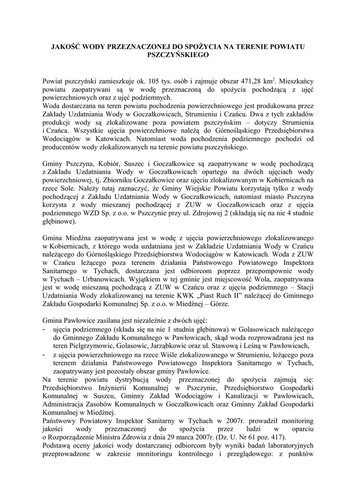 JAKOŚĆ WODY PRZEZNACZONEJ DO SPOŻYCIA NA TERENIE POWIATU PSZCZYŃSKIEGO Powiat pszczyński zamieszkuje ok. 105 tys. osób i zajmuje obszar 471,28 km2. Mieszkańcy powiatu zaopatrywani są w wodę przeznaczoną do spożycia pochodzącą z ujęć powierzchniowych oraz z ujęć podziemnych. Woda dostarczana na teren powiatu pochodzenia powierzchniowego jest produkowana przez Zakłady Uzdatniania Wody w Goczałkowicach, Strumieniu i Czańcu. Dwa z tych zakładów produkcji wody są zlokalizowane poza powiatem pszczyńskim – dotyczy Strumienia i Czańca. Wszystkie ujęcia powierzchniowe należą do Górnośląskiego Przedsiębiorstwa Wodociągów w Katowicach. Natomiast woda pochodzenia podziemnego pochodzi od producentów wody zlokalizowanych na terenie powiatu pszczyńskiego. Gminy Pszczyna, Kobiór, Suszec i Goczałkowice są zaopatrywane w wodę pochodzącą z Zakładu Uzdatniania Wody w Goczałkowicach opartego na dwóch ujęciach wody powierzchniowej, tj. Zbiorniku Goczałkowice oraz ujęciu zlokalizowanym w Kobiernicach na rzece Sole. Należy tutaj zaznaczyć, że Gminy Wiejskie Powiatu korzystają tylko z wody pochodzącej z Zakładu Uzdatniania Wody w Goczałkowicach, natomiast miasto Pszczyna korzysta z wody mieszanej pochodzącej z ZUW w Goczałkowicach oraz z ujęcia podziemnego WZD Sp. z o.o. w Pszczynie przy ul. Zdrojowej 2 (składają się na nie 4 studnie głębinowe). Gmina Miedźna zaopatrywana jest w wodę z ujęcia powierzchniowego zlokalizowanego w Kobiernicach, z którego woda uzdatniana jest w Zakładzie Uzdatniania Wody w Czańcu należącego do Górnośląskiego Przedsiębiorstwa Wodociągów w Katowicach. Woda z ZUW w Czańcu leżącego poza terenem działania Państwowego Powiatowego Inspektora Sanitarnego w Tychach, dostarczana jest odbiorcom poprzez przepompownie wody w Tychach – Urbanowicach. Wyjątkiem w tej gminie jest miejscowość Wola, zaopatrywana jest w wodę mieszaną pochodzącą z ZUW w Czańcu oraz z ujęcia podziemnego – Stacji Uzdatniania Wody zlokalizowanej na terenie KWK „Piast Ruch II” należącej do Gminnego Zakładu Gospodarki Komunalnej Sp. z o.o. w Miedźnej – Górze. Gmina Pawłowice zasilana jest niezależnie z dwóch ujęć: - ujęcia podziemnego (składa się na nie 1 studnia głębinowa) w Golasowicach należącego do Gminnego Zakładu Komunalnego w Pawłowicach, skąd woda rozprowadzana jest na teren Pielgrzymowic, Golasowic, Jarząbkowic oraz ul. Stawową i Leśną w Pawłowicach, - z ujęcia powierzchniowego na rzece Wiśle zlokalizowanego w Strumieniu, leżącego poza terenem działania Państwowego Powiatowego Inspektora Sanitarnego w Tychach, zaopatrywany jest pozostały obszar gminy Pawłowice. Na terenie powiatu dystrybucją wody przeznaczonej do spożycia zajmują się: Przedsiębiorstwo Inżynierii Komunalnej w Pszczynie, Przedsiębiorstwo Gospodarki Komunalnej w Suszcu, Gminny Zakład Wodociągów i Kanalizacji w Pawłowicach, Administracja Zasobów Komunalnych w Goczałkowicach oraz Gminny Zakład Gospodarki Komunalnej w Miedźnej. Państwowy Powiatowy Inspektor Sanitarny w Tychach w 2007r. prowadził monitoring jakości wody przeznaczonej do spożycia przez ludzi w oparciu o Rozporządzenie Ministra Zdrowia z dnia 29 marca 2007r. (Dz. U. Nr 61 poz. 417). Podstawą oceny jakości wody dostarczanej odbiorcom były wyniki badań laboratoryjnych przeprowadzone w zakresie monitoringu kontrolnego i przeglądowego: z punktów zlokalizowanych u producentów wody – na terenie ujęć wód powierzchniowych i podziemnych, z punktów stałych, z przepompowni wody i z punktów, których lokalizacja wynikała z interwencji mieszkańców. Łącznie na terenie powiatu wyznaczono 17 punktów monitoringowych, z których w równomiernych odstępach czasu pobierane były próbki wody do badań laboratoryjnych. Ogółem w roku 2007 w ramach monitoringu jakości wody przeznaczonej do spożycia przez ludzi na terenie powiatu pobrano 97 próbek do badań fizykochemicznych i 101 próbek do badań mikrobiologicznych. Najwięcej informacji o jakości fizykochemicznej i mikrobiologicznej wody wodociągowej dostarczały analizy wyników badań laboratoryjnych z punktów stałych, zlokalizowanych w następujących miejscach: - Pszczyna, ul. Rynek 2 – siedziba Urzędu Miasta, - Pszczyna, ul. Zdrojowa 4 – siedziba Przedsiębiorstwa Inżynierii Komunalnej, Goczałkowice, ul. Szkolna 13 – siedziba Urzędu Gminy, Pawłowice, ul. Zjednoczenia 60 – siedziba Urzędu Gminy, Suszec, ul. Ogrodowa 2 – siedziba Przedsiębiorstwa Gospodarki Komunalnej, Golasowice, ul. Korczaka 6 – budynek NZOZ, Kobiór, ul. Kobiórska 5 – siedziba Urzędu Gminy, Miedźna, ul. Topolowa 12 – siedziba Gminnego Zakładu Gospodarki Komunalnej , Wola, ul. Pszczyńska 9 – Kryta Pływalnia. Dane dotyczące jakości wody z poszczególnych gmin podległych Starostwu Powiatowemu w Pszczynie (dane dotyczą sieci rozdzielczej wodociągowej). Badania fizykochemiczne Lp. Nazwa gminy 1. Goczałkowice 2. Kobiór 3. 4. 5. 6. Miedźna Pawłowice Pszczyna Suszec Ogółem Woda zasilająca gminę pochodzi z: - uj.Goczałkowice - uj. Czaniec - uj.Goczałkowice - uj. Czaniec - uj. Czaniec - uj. Wola - u. Strumień - uj. Golasowice - uj.Goczałkowice - uj. Czaniec - uj. WZD - uj.Goczałkowice - uj. Czaniec Ogółem Badania mikrobiologiczne Zakwestio - nowane Ogółem Zakwestionowane 8 0 8 1 6 0 6 0 6 0 6 0 15 2 16 2 18 0 18 1 12 0 14 2 65 2 68 6 Analiza jakości mikrobiologicznej badanych wód nie budziła zastrzeżeń – stwierdzone zanieczyszczenia mikrobiologiczne nie znalazły potwierdzenia w przeprowadzonych bezpośrednio po ich wykryciu ponownych badaniach kontrolnych. W pobranych do analizy fizykochemicznej próbkach wody nie stwierdzono przekroczeń parametrów, które mogłyby zagrozić zdrowiu osób spożywających tą wodę oraz pogorszyć jej ocenę organoleptyczną dokonywaną przez konsumentów. Okresowo stwierdzane na terenie powiatu przekroczenia niewłaściwy