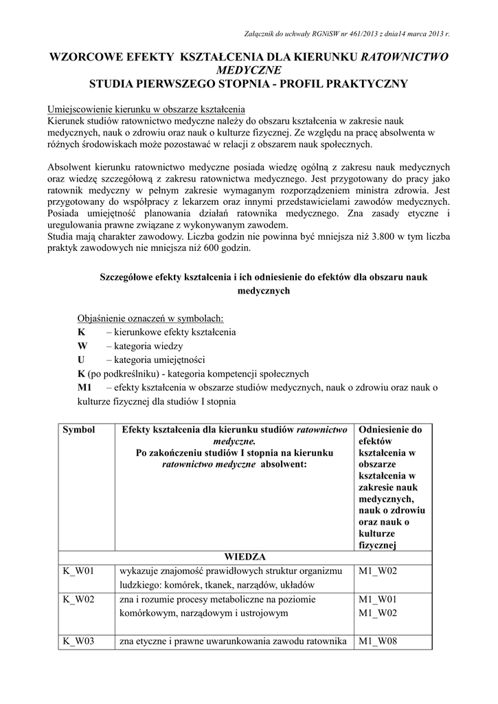 Załącznik do uchwały RGNiSW nr 461/2013 z dnia14 marca 2013 r. WZORCOWE EFEKTY KSZTAŁCENIA DLA KIERUNKU RATOWNICTWO MEDYCZNE STUDIA PIERWSZEGO STOPNIA - PROFIL PRAKTYCZNY Umiejscowienie kierunku w obszarze kształcenia Kierunek studiów ratownictwo medyczne należy do obszaru kształcenia w zakresie nauk medycznych, nauk o zdrowiu oraz nauk o kulturze fizycznej. Ze względu na pracę absolwenta w różnych środowiskach może pozostawać w relacji z obszarem nauk społecznych. Absolwent kierunku ratownictwo medyczne posiada wiedzę ogólną z zakresu nauk medycznych oraz wiedzę szczegółową z zakresu ratownictwa medycznego. Jest przygotowany do pracy jako ratownik medyczny w pełnym zakresie wymaganym rozporządzeniem ministra zdrowia. Jest przygotowany do współpracy z lekarzem oraz innymi przedstawicielami zawodów medycznych. Posiada umiejętność planowania działań ratownika medycznego. Zna zasady etyczne i uregulowania prawne związane z wykonywanym zawodem. Studia mają charakter zawodowy. Liczba godzin nie powinna być mniejsza niż 3.800 w tym liczba praktyk zawodowych nie mniejsza niż 600 godzin. Szczegółowe efekty kształcenia i ich odniesienie do efektów dla obszaru nauk medycznych Objaśnienie oznaczeń w symbolach: K – kierunkowe efekty kształcenia W – kategoria wiedzy U – kategoria umiejętności K (po podkreślniku) - kategoria kompetencji społecznych M1 – efekty kształcenia w obszarze studiów medycznych, nauk o zdrowiu oraz nauk o kulturze fizycznej dla studiów I stopnia Symbol K_W01 K_W02 K_W03 Efekty kształcenia dla kierunku studiów ratownictwo medyczne. Po zakończeniu studiów I stopnia na kierunku ratownictwo medyczne absolwent: WIEDZA wykazuje znajomość prawidłowych struktur organizmu ludzkiego: komórek, tkanek, narządów, układów zna i rozumie procesy metaboliczne na poziomie komórkowym, narządowym i ustrojowym zna etyczne i prawne uwarunkowania zawodu ratownika Odniesienie do efektów kształcenia w obszarze kształcenia w zakresie nauk medycznych, nauk o zdrowiu oraz nauk o kulturze fizycznej M1_W02 M1_W01 M1_W02 M1_W08 Załącznik do uchwały RGNiSW nr 461/2013 z dnia14 marca 2013 r. K_W04 K_W05 K_W06 K_W07 K_W08 K_W09 K_W10 K_W11 K_W12 K_W13 K_W14 K_W15 K_W16 K_W17 K_W18 K_W19 K_W20 K_W21 K_W22 K_W23 medycznego zna podstawy psychologiczne zachowań indywidualnych oraz relacji z rodziną, najbliższym otoczeniem i społeczeństwem rozumie problemy wynikające z niepełnosprawności, kalectwa i choroby przewlekłej rozumie uwarunkowania społeczne zdrowia i choroby zna aspekty prawne związane z postępowaniem wobec osób z zaburzeniami psychicznymi posiada znajomość zaburzeń w strukturach komórkowych, tkankowych, narządowych i układowych wywołanych chorobą lub urazem zna i rozumie mechanizmy prowadzące do nagłych zagrożeń zdrowia i życia zna objawy, patogenezę i sposoby postępowania w określonych stanach klinicznych zna podstawowe mechanizmy działania leków zna metody ograniczania bólu zna zasady dekontaminacji zna rodzaje, objawy i skutki działania czynników masowego rażenia (promieniowania, skażenia chemicznego, biologicznego) zna zasady promocji zdrowia, właściwego odżywiania i zdrowego stylu życia zna czynniki ryzyka zdrowotnego i zagrożenia życia zna mechanizmy wywołujące, objawy i skutki stresu zna postawy epidemiologii i zapobiegania chorobom rozumie strukturę i organizację systemu ochrony zdrowia na poziomie krajowym i globalnym z uwzględnieniem uwarunkowań ekonomicznych zna zasady ratowania tonących oraz podstawy asekuracji wysokościowej zna organizację, funkcjonowanie i finansowanie systemu ratownictwa medycznego w Polsce oraz organizację i funkcjonowanie innych służb i organizacji powołanych do niesienia pomocy zna i rozumie podstawowe pojęcia i zasady z zakresu ochrony własności przemysłowej i prawa autorskiego zna ogólne zasady tworzenia i rozwoju form indywidualnej przedsiębiorczości w obszarze ochrony zdrowia M1_W04 M1_W05 M1_W04 M1_W04 M1_W05 M1_W08 M1_W03 M1_W03 M1_W03 M1_W05 M1_W05 M1_W03, M1_W05 M1_W07 M1_W03, M1_W05 M1_W06 M1_W04, M1_W06 M1_W04 M1_W06 M1_W09 M1_W10 M1_W05 M1_W09 M1_W11 M1_W12 2 Załącznik do uchwały RGNiSW nr 461/2013 z dnia14 marca 2013 r. K_U01 K_U02 K_U03 K_U04 K_U05 K_U06 UMIEJĘTNOŚCI potrafi skutecznie komunikować się z pacjentem, jego rodziną (opiekunem), świadkiem zdarzenia potrafi przeprowadzić wywiad z pacjentem, jego rodziną (opiekunem), świadkiem zdarzenia potrafi wyjaśnić pacjentowi istotę jego dolegliwości i uzasadnić decyzję o sposobie dalszego postępowania potrafi skutecznie komunikować się ze współpracownikami i innymi pracownikami ochrony zdrowia posiada umiejętność komunikowania się i współpracy z innymi służbami i organizacjami powołanymi do niesienia pomocy potrafi rozpoznać stany nagłego zagrożenia zdrowotnego K_U18 zna zasady postępowania adekwatne do rozpoznanego stanu nagłego zagrożenia zdrowotnego Komunikuje się z osobami niepełnosprawnymi w tym z niepełnosprawnością wieloraką Stosuje alternatywne i wspomagające metody komunikacji na miejscu zdarzenia potrafi ocenić stan pacjenta w celu ustalenia postępowania potrafi ocenić stan świadomości pacjenta posiada umiejętność układania pacjenta w pozycji właściwej dla rodzaju schorzenia lub odniesionych obrażeń ciała potrafi prowadzić podstawowe czynności resuscytacyjne u dorosłych i dzieci potrafi prowadzić zaawansowane czynności resuscytacyjne u dorosłych i dzieci potrafi przywracać drożność dróg oddechowych metodami bezprzyrządowymi posiada umiejętność przyrządowego udrażniania dróg oddechowych metodami nadkrtaniowym posiada umiejętność intubacji dotchawiczej w laryngoskopii bezpośredniej potrafi wykonać konikopunkcję i konikotomię K_U19 potrafi wdrożyć tlenoterapię K_U20 posiada umiejętność wspomagania oddechu K_U07 K_U08 K_U09 K_U10 K_U11 K_U12 K_U13 K_U14 K_U15 K_U16 K_U17 M1_U0
