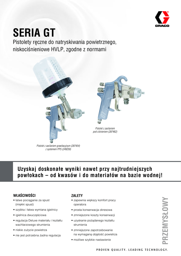 SERIA GT Pistolety rêczne do natryskiwania powietrznego, niskociœnieniowe HVLP, zgodne z normami Pistolet z zasilaniem pod ciœnieniem (287462) Pistolet z zasilaniem grawitacyjnym (287454) z systemem PPS (249259) W£AŒCIWOŒCI ZALETY • ∆atwe poci◊ganie za spust (miêkki spust) • zapewnia wiêkszy komfort pracy operatora • szybka i ∆atwa wymiana igielnicy • prosta konserwacja okresowa • igielnica dwuczêœciowa • zmniejszone koszty konserwacji • regulacja Deluxe materia∆u i kszta∆tu wachlarzowego strumienia • uzyskanie po¿◊danego kszta∆tu strumienia • niskie zu¿ycie powietrza • zmniejszone zapotrzebowanie na wymagan◊ objêtoœæ powietrza • nie jest potrzebna ¿adna regulacja • mo¿liwe szybkie nastawienie PRZEMYS£OWY Uzyskaj doskona∆e wyniki nawet przy najtrudniejszych pow∆okach – od kwasów i do materia∆ów na bazie wodnej! P R O V E N Q U A L I T Y. L E A D I N G T E C H N O LO G Y. Informacje wymagane do zamówienia Czêœci i akcesoria Wybór w∆aœciwego pistoletu 3M’S PPS™ PRZYGOTOWANIE FARBY Czêstoœæ natryskiwania Zalecany system zasilania Typ pistoletu TRWA£OŒÆ Dobór pistoletu < 10 razy/tydzieñ Zasilanie grawitacyjne lub syfonowe Pistolet z kubkiem > 30 razy/tydzieñ Z naczyniami ciœnieniowymi lub pompk◊ Pistolet z zasilaniem ciœnieniowym Lepszy Najlepszy Seria GT Seria GT • Dobre wykoñczenie • Dobra wartoœæ • Dobre wykoñczenie • Dobra wartoœæ Lepkoœæ materia∆u • Najlepsza ergonomia • Najd∆u¿sza trwa∆oœæ • Najlepsza ergonomia • Najd∆u¿sza trwa∆oœæ Wielkoœæ otworu Numery czêœci in. (mm) Zespó∆ Koñcówka rozpylaj◊ca niska 0,045 (1,1) 287461 119807 Ciœnieniowe œrednia 0,055 (1,4) 287462 119807 Ciœnieniowe wysoka 0,070 (1,8) 287464 119807 Syfonowe wysoka 0,070 (1,8) 287456 119808 Pistolety HVLP Lepkoœæ materia∆u Wielkoœæ otworu Numery czêœci in. (mm) Zespó∆ Koñcówka rozpylaj◊ca Ciœnieniowe Ciœnieniowe niska 0,045 (1,1) 248993 119806 Ciœnieniowe œrednia 0,055 (1,4) 248994 119806 Ciœnieniowe wysoka 0,070 (1,8) 248995 119806 niska 0,045 (1,1) 248996 119809 Grawitacyjne* œrednia 0,055 (1,4) 248997 119810 Grawitacyjne* wysoka 0,070 (1,8) 248998 119812 Grawitacyjne* Pistolety zgodne Lepkoœæ materia∆u z normami Wielkoœæ otworu Numery czêœci in. (mm) Zespó∆ Koñcówka rozpylaj◊ca Ciœnieniowe niska 0,045 (1,1) 249014 119807 Ciœnieniowe œrednia 0,055 (1,4) 249015 119807 Ciœnieniowe 119807 wysoka 0,070 (1,8) 249425 Grawitacyjne* niska 0,045 (1,1) 248999 119811 Grawitacyjne* œrednia 0,055 (1,4) 287454 119811 Grawitacyjne* wysoka 0,070 (1,8) 287455 119811 850 ml (32 oz) 3MTM PPSTM 234937 Kubek i pierœcieñ (pude∆ko zawiera 4 szt.) Do u¿ywania z pistoletami grawitacyjnymi i syfonowymi. 234938 Pokrywa i wstawka (pude∆ko zawiera 25 szt.) Do u¿ywania z pistoletami grawitacyjnymi i syfonowymi. 234939 Wk∆adka pomiarowa (pude∆ko zawiera 100 szt.) 249259 Zestaw grawitacyjny 650 ml (25 oz.) Po jednej szt.: kubek, pierœcieñ, pokrywa, wstawka, adapter. 234773 Zestaw syfonowy 650 ml (25 oz) Po jednej szt.: kubek, pierœcieñ, pokrywa, wstawka, adapter. 15E470 15E469 15E467 15D684 15F505 3MTM PPSTM Zasobnik pokryw 3MTM PPSTM Zasobnik wstawek 3MTM PPSTM Taca pistoletu 3MTM PPSTM Adapter zasilania syfonowego 3MTM PPSTM Adapter zasilania grawitacyjnego KUBKI GRAWITACYJNE 249258 249257 249259 Kubek aluminiowy 600 ml, wysoka szczelnoœæ Kubek aluminiowy 900 ml, wysoka szczelnoœæ Zestaw PPS 650 ml KUBKI SYFONOWE 249873 239582 Kubek aluminiowy 850 ml, wysoka szczelnoœæ i bez pokrêt∆a Kubek ze stali nierdzewnej 850 ml, wysoka szczelnoœæ i bez pokrêt∆a Zestaw PPS 650 ml INNE Igielnice i dysze Wielkoœæ otworu Technologia Zespó∆ igielnicy 0,045 (1,1) Rozpylanie powietrzne 119821 273013 119817 0,045 (1,1) HVLP 119821 273013 119819 0,045 (1,1) Zgodne – grawitacyjne 119821 273013 119819 0,045 (1,1) Zgodne – ciœnieniowe 119821 273013 119817 0,055 (1,4) Rozpylanie powietrzne 119821 273013 119816 0,055 (1,4) HVLP 119821 273013 119814 0,055 (1,4) Zgodne – grawitacyjne 119821 273013 119814 0,055 (1,4) Zgodne – ciœnieniowe 119821 273013 119816 0,070 (1,8) Rozpylanie powietrzne 119822 273014 119818 0,070 (1,8) HVLP 119822 273014 119815 0,070 (1,8) Zgodne – grawitacyjne 119822 273014 119815 0,070 (1,8) Zgodne – ciœnieniowe 119822 273014 119818 (mm) 234771 Kubek i pierœcieñ (pude∆ko zawiera 8 szt.) Do u¿ywania z pistoletami grawitacyjnymi i syfonowymi. 234772 Pokrywa i wstawka (pude∆ko zawiera 50 szt.) Do u¿ywania z pistoletami grawitacyjnymi i syfonowymi. 15F531 Wk∆adka pomiarowa (pude∆ko zawiera 100 szt.) 234773 *Kubki nale¿y zamawiaæ oddzielnie. Opcje obejmuj◊ kubki aluminiowe lub zestaw PPS. Cale 234941 Kubek i pierœcieñ (pude∆ko zawiera 8 szt.) Do u¿ywania z pistoletami grawitacyjnymi i syfonowymi. 650 ml (25 oz) 3MTM PPSTM Seria XT Seria XT Seria XT • Najlepsze wykoñczenie • Najlepsze wykoñczenie • Najlepsze wykoñczenie • Najlepsza ergonomia • Najd∆u¿sza trwa∆oœæ 150 ml (6 oz) 3MTM PPSTM 234940 Pokrywa i wstawka (pude∆ko zawiera 50 szt.) Do u¿ywania z pistoletami grawitacyjnymi i syfonowymi. 234942 Wk∆adka pomiarowa (pude∆ko zawiera 50 szt.) Seria LT • Wysokie walory za ma∆e pieni◊dze Dobry Pistolety do natryskiwania powietrznego Pomiêdzy 10–30 razy/tydzieñ Z naczyniami ciœnieniowymi lub pompk◊ Pistolet z zasilaniem ciœnieniowym Zestaw koñcówek igielnicy Dysza 119800 119801 119802 119803 119804 111265 Zestaw do regulacji szerokoœci strumienia Zestaw zaworu powietrza Zestaw regulacyjny materia∆u Zestaw naprawczy sekcji materia∆u Zestaw uszczelek Smar RÊCZNY 310888 Instrukcja obs∆ugi serii GT Klucz do oznaczenia lepkoœci materia∆u Niska: 20 centypuazów przy 70ºF (21ºC) Wysoka: 160, 260 centypuazów przy 70ºF (21ºC) Œrednia: 70 centypuazów przy 70ºF (21ºC) High Solids: ponad 360 centypuazów przy 70ºF (21ºC) Wszystkie informacje zawarte w 