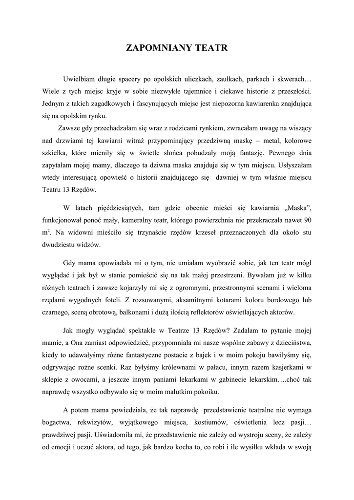 ZAPOMNIANY TEATR Uwielbiam długie spacery po opolskich uliczkach, zaułkach, parkach i skwerach… Wiele z tych miejsc kryje w sobie niezwykłe tajemnice i ciekawe historie z przeszłości. Jednym z takich zagadkowych i fascynujących miejsc jest niepozorna kawiarenka znajdująca się na opolskim rynku. Zawsze gdy przechadzałam się wraz z rodzicami rynkiem, zwracałam uwagę na wiszący nad drzwiami tej kawiarni witraż przypominający przedziwną maskę – metal, kolorowe szkiełka, które mieniły się w świetle słońca pobudzały moją fantazję. Pewnego dnia zapytałam mojej mamy, dlaczego ta dziwna maska znajduje się w tym miejscu. Usłyszałam wtedy interesującą opowieść o historii znajdującego się dawniej w tym właśnie miejscu Teatru 13 Rzędów. W latach pięćdziesiątych, tam gdzie obecnie mieści się kawiarnia „Maska”, funkcjonował ponoć mały, kameralny teatr, którego powierzchnia nie przekraczała nawet 90 m2. Na widowni mieściło się trzynaście rzędów krzeseł przeznaczonych dla około stu dwudziestu widzów. Gdy mama opowiadała mi o tym, nie umiałam wyobrazić sobie, jak ten teatr mógł wyglądać i jak był w stanie pomieścić się na tak małej przestrzeni. Bywałam już w kilku różnych teatrach i zawsze kojarzyły mi się z ogromnymi, przestronnymi scenami i wieloma rzędami wygodnych foteli. Z rozsuwanymi, aksamitnymi kotarami koloru bordowego lub czarnego, sceną obrotową, balkonami i dużą ilością reflektorów oświetlających aktorów. Jak mogły wyglądać spektakle w Teatrze 13 Rzędów? Zadałam to pytanie mojej mamie, a Ona zamiast odpowiedzieć, przypomniała mi nasze wspólne zabawy z dzieciństwa, kiedy to udawałyśmy różne fantastyczne postacie z bajek i w moim pokoju bawiłyśmy się, odgrywając rożne scenki. Raz byłyśmy królewnami w pałacu, innym razem kasjerkami w sklepie z owocami, a jeszcze innym paniami lekarkami w gabinecie lekarskim….choć tak naprawdę wszystko odbywało się w moim malutkim pokoiku. A potem mama powiedziała, że tak naprawdę przedstawienie teatralne nie wymaga bogactwa, rekwizytów, wyjątkowego miejsca, kostiumów, oświetlenia lecz pasji… prawdziwej pasji. Uświadomiła mi, że przedstawienie nie zależy od wystroju sceny, że zależy od emocji i uczuć aktora, od tego, jak bardzo kocha to, co robi i ile wysiłku wkłada w swoją pracę. Wówczas nawet maleńkie, szare i ubogie miejsce może stać się wspaniałym teatrem, przenieść widza w magiczne, odległe miejsca i sprawić, by zapomniał o realnym świecie, o swoich problemach i kłopotach. Dzięki mamie doszłam do wniosku, że teatr to nie tylko budynek, cztery ściany, lecz ludzie…aktorzy, którzy w nim grają i wkładają całe swoje serce i wysiłek w każde przygotowywane przedstawienie. Z tego, co dowiedziałam się od mamy, taki był właśnie teatr prowadzony przez Jerzego Grotowskiego. W jego przedstawieniach nie grali aktorzy profesjonalni, aktorzy, którzy ukończyli szkoły teatralne, lecz właśnie pasjonaci. Nie wykonywali swojej pracy dla pieniędzy, ale z miłości do grania na deskach teatru. Nie mieli wyszukanych scenografii i kostiumów. Niewielkie pomieszczenie służyło im za garderobę, a mały magazyn za rekwizytornię. Jerzy Grotowski kochał teatr i dlatego też dbał o to, by jego sztuki były zagrane perfekcyjnie. Wspólnie z aktorami pracował nad rolami, czasami po kilkanaście godzin dziennie, tak by wszystko było zapięte na ostatni guzik i dopracowane co do najdrobniejszego szczegółu. Ze smutkiem słuchałam, jak mama opowiadała mi o kłopotach, z jakimi borykał się Teatr 13 Rzędów i jak chciano się go pozbyć na różne sposoby z naszego miasta. Mimo wielu prób pomocy teatrowi stało się jednak najgorsze – Teatr 13 Rzędów zlikwidowano. W jego miejsce natomiast utworzono we Wrocławiu Teatr Laboratorium. Teraz wszystko zaczęło mi się układać w logiczną całość. To dlatego obok kawiarni „Maska” mieści się kawiarnia „Laboratorium”, upamiętniająca wrocławski teatr Jerzego Grotowskiego! Szkoda tylko, że po działalności takiego wybitnego reżysera i jego teatru, który zyskał sławę i był doceniany poza granicami kraju, pozostały tylko dwie małe kawiarenki, które symbolizują oba zapomniane teatry Jerzego Grotowskiego. W ich wnętrzu, zwłaszcza w „Masce”, czuje się jednak niepowtarzalny klimat i teatralną atmosferę. Zuzanna Trzebuniak Klasa VI Publiczna Szkoła Podstawowa nr 8 W Opolu Opiekun – Katarzyna Bajger