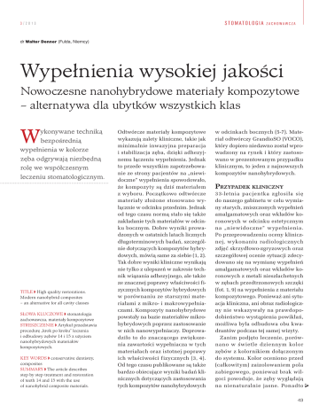 S TOMATOLOGIA 3/2013 zachowawcza dr Walter Denner (Fulda, Niemcy) Wypełnienia wysokiej jakości Nowoczesne nanohybrydowe materiały kompozytowe – alternatywa dla ubytków wszystkich klas W ykonywane techniką bezpośrednią wypełnienia w kolorze zęba odgrywają niezbędną rolę we współczesnym leczeniu stomatologicznym. TITLE High quality restorations. Modern nanohybrid composites – an alternative for all cavity classes Słowa kluczowe stomatologia zachowawcza, materiały kompozytowe Streszczenie Artykuł przedstawia procedurę „krok po kroku” leczenia i odbudowy zębów 14 i 15 z użyciem nanohybrydowych materiałów kompozytowych. Key words conservative dentistry, composites Summary The article describes step by step treatment and restoration of teeth 14 and 15 with the use of nanohybrid composite materials. Odtwórcze materiały kompozytowe wykazują zalety kliniczne, takie jak minimalnie inwazyjna preparacja i stabilizacja zęba, dzięki adhezyjnemu łączeniu wypełnienia. Jednak to przede wszystkim zapotrzebowanie ze strony pacjentów na „niewidoczne” wypełnienia spowodowało, że kompozyty są dziś materiałem z wyboru. Początkowo odtwórcze materiały złożone stosowano wyłącznie w odcinku przednim. Jednak od tego czasu normą stało się także zakładanie tych materiałów w odcinku bocznym. Dobre wyniki prowadzonych w ostatnich latach licznych długoterminowych badań, szczególnie dotyczących kompozytów hybrydowych, mówią same za siebie (1, 2). Tak dobre wyniki kliniczne wynikają nie tylko z ulepszeń w zakresie technik wiązania adhezyjnego, ale także ze znacznej poprawy właściwości fizycznych kompozytów hybrydowych w porównaniu ze starszymi materiałami z mikro- i makrowypełniaczami. Kompozyty nanohybrydowe powstały na bazie materiałów mikrohybrydowych poprzez zastosowanie w nich nanowypełniaczy. Doprowadziło to do znaczącego zwiększenia zawartości wypełniacza w tych materiałach oraz istotnej poprawy ich właściwości fizycznych (3, 4). Od tego czasu publikowane są także bardzo obiecujące wyniki badań klinicznych dotyczących zastosowania tych kompozytów nanohybrydowych w odcinkach bocznych (5-7). Materiał odtwórczy GrandioSO (VOCO), który dopiero niedawno został wprowadzony na rynek i który zastosowano w prezentowanym przypadku klinicznym, to jeden z najnowszych kompozytów nanohybrydowych. Przypadek kliniczny 33-letnia pacjentka zgłosiła się do naszego gabinetu w celu wymiany starych, zniszczonych wypełnień amalgamatowych oraz wkładów koronowych w odcinku estetycznym na „niewidoczne” wypełnienia. Po przeprowadzeniu oceny klinicznej, wykonaniu radiologicznych zdjęć skrzydłowo-zgryzowych oraz szczegółowej ocenie sytuacji zdecydowano się na wymianę wypełnień amalgamatowych oraz wkładów koronowych z metali nieszlachetnych w zębach przedtrzonowych szczęki (fot. 1, 9) na wypełnienia z materiału kompozytowego. Ponieważ ani sytuacja kliniczna, ani obraz radiologiczny nie wskazywały na prawdopodobieństwo wystąpienia powikłań, możliwa była odbudowa obu kwadrantów podczas tej samej wizyty. Zanim podjęto leczenie, porównano w świetle dziennym kolor zębów z kolornikiem dołączonym do systemu. Kolor oceniono przed (całkowitym) zaizolowaniem pola zabiegowego, ponieważ brak wilgoci powoduje, że zęby wyglądają na nienaturalnie jasne. Ponadto 43 S TOMATOLOGIA kontrastujący kolor koferdamu powoduje błędne wrażenie koloru zębów. Zaizolowanie pola zabiegowego za pomocą koferdamu powoduje czyste osłonięcie leczonych zębów od reszty jamy ustnej, umożliwiając lekarzowi dentyście skuteczną i czystą pracę. Takie oddzielenie pola zabiegowego stanowi ogromną korzyść zarówno dla dentysty, jak i dla pacjenta, szczególnie w przypadku większych wypełnień. Na j p i e r w o d b u d owa n o z ę b y w 1. kwadrancie. W tym celu założono koferdam na ząb 16 za pomocą klamry, po czym usunięto stare wypełnienia amalgamatowe i wkłady koronowe (fot. 2). Zastosowane formówki częściowe (Compositight, Garrison) zamocowano przy pomocy pierścienia (Palodent, Dentsply) i dociśnięto drewnianymi klinami. Należy bardzo starannie przeprowadzić adaptację formówek, ponieważ pozwoli to na zminimalizowanie wielkości nadmiarów. Takie postępowanie się opłaci, ponieważ na późniejszym etapie będzie trzeba spędzić mniej czasu i poświęcić mniej energii na wykończenie wypełnienia. Po aplikacji systemu wiążącego (Futurabond DC, VOCO) nakładano warstwowo materiał GrandioSO w kolorze A3, stopniowo wypełniając ubytek w zębie 15. W tym celu najpierw przekształcono ubytek klasy II w ubytek całkowicie położony w granicach powierzchni zwarciowej, odbudowując krawędź dystalną (fot. 3) i mezjalną. Przyjemna, nielepiąca się konsystencja materiału GrandioSO ułatwia jego adaptację oraz kształtowanie proksymalnych powierzchni wypełnień. Po uformowaniu ścian proksymalnych można było zdjąć formówki i pierścienie utrzymujące, co poprawiło widoczność pola. Materiał kompozytowy GrandioSO nakładano pojedynczymi warstwami do ubytku, który obejmo44 T zachowawcza wał teraz wyłącznie powierzchnię zwarciową, a następnie każdą warstwę polimeryzowano przez dziesięć sekund niebieskim światłem. W tym procesie każdej warstwie nadaje się w miarę możliwości prawidłowy kształt anatomiczny, m.in. w możliwie wierny sposób odzwierciedlając rzeźbę powierzchni zwarciowej. Pozwala to znacznie zaoszczędzić czas podczas wykańczania wypełnienia. Na fot. 5 przedstawiono założone i wstępnie uformowane wypełnienie w zębie 15. Następnie przeprowadzono podobne postępowanie w obrębie zęba 14. Założono i dociśnięto klinami formówki częściowe (fot. 6), naniesiono system wiążący, osuszono go strumieniem powietrza i przeprowadzono polimeryzację. Także w tym przypadku odbudowę rozpoczęto od ścian proksymalnych, po czym warstwowo wype
