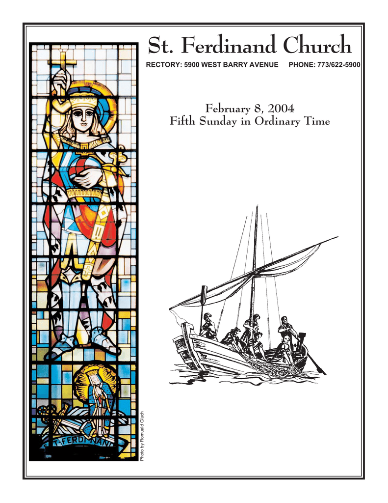 St. Ferdinand Church RECTORY: 5900 WEST BARRY AVENUE PHONE: 773/622-5900 Photo by Romuald Gluch February 8, 2004 Fifth Sunday in Ordinary Time Page Two Fifth Sunday in Ordinary Time February 8, 2004 The sanctuary lamps this week are lit for: ^Peter Aloisio ^Piecuch, Szerzen & Szczech Families MONDAY, Weekday 7:00 AM—Joseph Jakoby, Jr. rq. Wife 8:00 AM—Julius Piecuch rq. Piecuch & Szerszen Families TUESDAY, Scholastica, virgin 7:00 AM—Lillian Oliveri rq. Family & Friends 8:00 AM—Richard E. Wawrzyniak (14th Anniv.) rq. Julia Wawrzyniak & Family WEDNESDAY, Weekday / Our Lady of Lourdes 7:00 AM—Lourdez & Ceferina Geronimo rq. Family 7:00 AM—(Chapel)Mass in Polish 8:00 AM—Clemente & Mallardi Families rq. Family THURSDAY, Weekday 7:00 AM—Jennie Focht rq. Husband & Family 8:00 AM—Mary Kuzniar rq. Daughter, Lorraine Talaga FRIDAY, Weekday 7:00 AM—Florence Fremel rq. Irene Novacek 8:00 AM—Marie Frisch rq. Daughter SATURDAY, Cyril and Methodius, bishop 7:00 AM—Mass in Polish 8:00 AM—Alex Ladisa rq. Wife, Dolores Sunday Anticipated Mass 5:00 PM—Leonard Strzepek rq. Victoria Strzepek, Wife SUNDAY, Sixth Sunday in Ordinary Time 7:30 AM—Stella Filipin rq. Daughter 7:30 AM—(Chapel) ^Kazimiera Solecka w 9 m-c po œm.; -o b³og. Bo¿e dla córki 9:00 AM—Josephine Geraci rq. Mr. Sam Geraci 10:30 AM—(Chapel)Laura Kovarik rq. Cousin 10:45 AM—-^Kazimierz Szef, Anna G³¹biñska; ^Jerzy Sikorski w 2 rocz. œm.; ^Anna Fr¹czek w 35 rocz. œm.; ^Stanis³awa Kuzdrza³ w 16 rocz. œm. 12:15 PM—(Chapel) Mass in Italian 12:30 PM—Memorial Mass Society 3:00 PM—Mass in Polish 5:00 PM—Lillian Oliveri rq. Family 6:30 PM—o zdrowie, b³og. Bo¿e i potrzebne ³aski oraz opiekê Matki Bo¿ej dla Ireny READINGS FOR THE WEEK Monday: Tuesday: Wednesday: Thursday: Friday: Saturday: Sunday: 1 Kgs 8:1-7, 9-13; Mk 6:53-56 1 Kgs 8:22-23, 27-30; Mk 7:1-13 1 Kgs 10:1-10; Mk 7:14-23 1 Kgs 11:4-13; Mk 7:24-30 1 Kgs 11:29-32; 12:19; Mk 7:31-37 1 Kgs 12:26-32; 13:33-34; Mk 8:1-10 Jer 17:5-8; Ps 1; 1 Cor 15:12, 16-20; Lk 17:20-26 HANDMAIDS C. Carsello 3rd publication None 2nd publication Dariusz Kwiatkowski and Katarzyna Kowalik Piotr Sobala and Magdalena Reczek 1st publication None WE WELCOME IN BAPTISM Daniel Janusz, son of Janusz and Anna (Piejko) Galiñski; Thomas Alexander, son of Marek and Gra¿yna (Janik) Komosa; Oskar Jakub, son of Krzysztof Rolak and Justyna Kudroñ; Victoria, daughter of Piotr and Renata (Olchawa) WoŸniak. GOD’S SUMMONS Confronted with God’s power and majesty, the first response of the prophet Isaiah was to acknowledge his sinfulness. “Woe is me, I am doomed! For I am a man of unclean lips,” he said aloud. Likewise, with his empty fishing nets dramatically filled at Jesus’ instruction, Peter fell to his knees and cried out, “Depart from me, Lord, for I am a sinful man.” Next, Peter got up. He docked his boats, then left to follow Jesus. Isaiah also had a dramatic change of heart. When he heard the Lord say, “Whom shall I send? Who will go for us?” Isaiah answered, “Here I am, send me.” We are summoned daily by the Risen Lord. We are reminded of the saving power of the gospel and know in our heart of hearts that, as St. Paul wrote, believing in anything else won’t lead to anything. What will it take for you to move past your sinfulness? What will it take for you to get off your knees? What will it take for you to bring to dock what is unimportant and to accept your call to be God’s messenger? (c) Copyright, J. S. Paluch Co. LOVE INDEED They love indeed who quake to say they love. —Philip Sidney February 8, 2004 Fifth Sunday in Ordinary Time Farewell and Thank You, Mrs. Aneta Kocma Five years ago today Mrs. Aneta (Œwiêtochowska) Koæma joined our parish staff as Administrative Assistant. Aneta has served our parishioners and our parish staff faithfully in all the traditional duties of a parish secretary as well as having been an extremely competent and diligent assistant to Fr. Cortesi and myself in administrative matters. There were countless times when her skills as a translator between the Polish and English languages have been invaluable during these years when our parish membership increased to over 40% Polish-speaking Catholic families. In addition, her computer skills and attention to details have helped us to keep current with our parish records and business matters in this very active parish. Mrs. Kocma has accepted a position in the private sector that will utilize many of these same talents that she shared with us since 1999. While her leaving our staff is a loss to us, we wish her well in her new endeavors and send with her our appreciation for all of her dedication to the Church and for five years of fine work. On behalf of our parishioners and parish staff, may God bless you always, Aneta, for all that you did for St. Ferdinand Parish. Daniel P. Costigan, Parish Business Manager "They Left Everything and Followed Jesus" What are the purposes of the World Day for Consecrated Life? In his message for the first World Day for Consecrated Life, the pope said the day offers the opportunity to thank God for the gift of consecrated life, to promote knowledge of the life, February 8 to invite consecrated people to celebrate what the Lord has accomplished in them, and to acquire more awareness of their mission in the Church and in the world. Our Financial Support of St. Ferdinand Parish Sunday, January 31-February 1, 2004: Envelopes: $ 9,668.60 Loose Cash: $ 3,373.75 TOTAL DONATIONS: $13,042.35 Amount over / (under) weekly budget: ($1,957.65) Archdiocesan Seminary Appeal (To Date) $3,934.04 Thank you for all that you do for St. Ferdinand Parish and the Archdiocese of Chicago. Daniel P. Costigan, Parish Business Manager Page Three As members of the parish faith community, it is our responsibility to remember both in concrete and spiritual ways those who cannot celebrate with us each week because they are ill. Those who are sick in tu