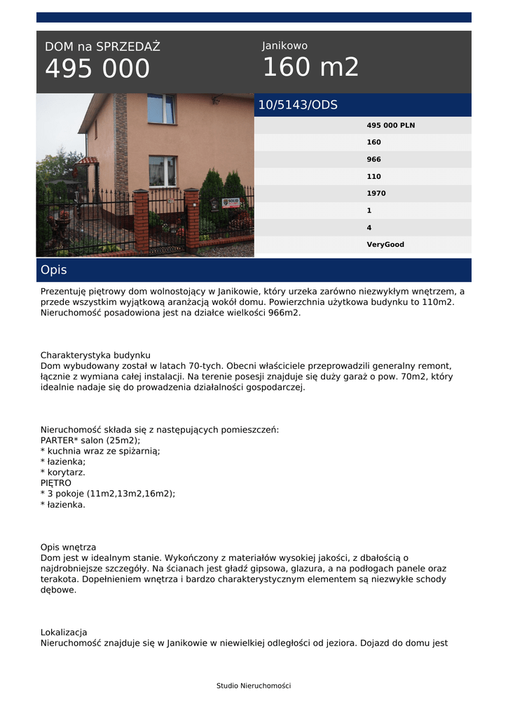 DOM na SPRZEDAŻ 495 000 Janikowo 160 m2 10/5143/ODS 495 000 PLN 160 966 110 1970 1 4 VeryGood Opis Prezentuję piętrowy dom wolnostojący w Janikowie, który urzeka zarówno niezwykłym wnętrzem, a przede wszystkim wyjątkową aranżacją wokół domu. Powierzchnia użytkowa budynku to 110m2. Nieruchomość posadowiona jest na działce wielkości 966m2. Charakterystyka budynku Dom wybudowany został w latach 70-tych. Obecni właściciele przeprowadzili generalny remont, łącznie z wymiana całej instalacji. Na terenie posesji znajduje się duży garaż o pow. 70m2, który idealnie nadaje się do prowadzenia działalności gospodarczej. Nieruchomość składa się z następujących pomieszczeń: PARTER* salon (25m2); * kuchnia wraz ze spiżarnią; * łazienka; * korytarz. PIĘTRO * 3 pokoje (11m2,13m2,16m2); * łazienka. Opis wnętrza Dom jest w idealnym stanie. Wykończony z materiałów wysokiej jakości, z dbałością o najdrobniejsze szczegóły. Na ścianach jest gładź gipsowa, glazura, a na podłogach panele oraz terakota. Dopełnieniem wnętrza i bardzo charakterystycznym elementem są niezwykłe schody dębowe. Lokalizacja Nieruchomość znajduje się w Janikowie w niewielkiej odległości od jeziora. Dojazd do domu jest Studio Nieruchomości drogą asfaltową. Dogodny dostęp do komunikacji i bliska odległość do szkoły oraz sklepów. Dostępne media: * prąd; * woda - miejska; * kanalizacja - miejska; * ogrzewanie - ekogroszek (nowy piec wraz z całą instalacją wymieniony w 2012 roku). W ostatnim czasie został również zamontowany piec gzowy. Dodatkowe informacje Niewątpliwym atutem jest garaż wolnostojący na dwa stanowiska. Dopełnieniem wszystkiego jest piękny ogród z licznymi nasadzeniami, wędzarnia z grillem oraz letnia altana - stanowią one wizytówkę tego domu. Na podwórku wyłożona jest kolorowa kostka brukowa. Ta nieruchomość może być Twoja za cenę 495.000 zł (cena do negocjacji). To idealna oferta dla osób szukających wyjątkowego domu rodzinnego oraz doskonałego miejsca na własną firmę. Zadzwoń, by umówić się na oglądanie i dowiedzieć się więcej! Więcej naszych ofert znajdziecie na stronie www.studio-nieruchomosci.com Sprzedaj ze Studio Nieruchomości tel. 502 908 680 email: [email protected] Studio Nieruchomości Powered by TCPDF (www.tcpdf.org)