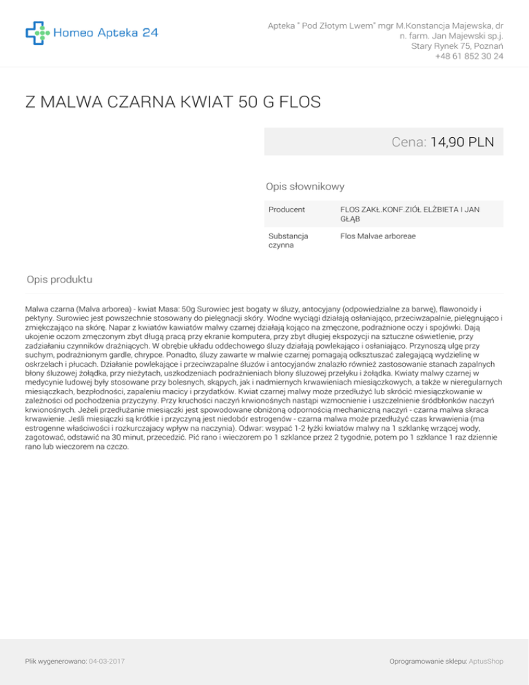 Apteka " Pod Złotym Lwem" mgr M.Konstancja Majewska, dr n. farm. Jan Majewski sp.j. Stary Rynek 75, Poznań +48 61 852 30 24 Z MALWA CZARNA KWIAT 50 G FLOS Cena: 14,90 PLN Opis słownikowy Producent FLOS ZAKŁ.KONF.ZIÓŁ ELŻBIETA I JAN GŁĄB Substancja czynna Flos Malvae arboreae Opis produktu Malwa czarna (Malva arborea) - kwiat Masa: 50g Surowiec jest bogaty w śluzy, antocyjany (odpowiedzialne za barwę), flawonoidy i pektyny. Surowiec jest powszechnie stosowany do pielęgnacji skóry. Wodne wyciągi działają osłaniająco, przeciwzapalnie, pielęgnująco i zmiękczająco na skórę. Napar z kwiatów kawiatów malwy czarnej działają kojąco na zmęczone, podrażnione oczy i spojówki. Dają ukojenie oczom zmęczonym zbyt długą pracą przy ekranie komputera, przy zbyt długiej ekspozycji na sztuczne oświetlenie, przy zadziałaniu czynników drażniących. W obrębie układu oddechowego śluzy działają powlekająco i osłaniająco. Przynoszą ulgę przy suchym, podrażnionym gardle, chrypce. Ponadto, śluzy zawarte w malwie czarnej pomagają odksztuszać zalegającą wydzielinę w oskrzelach i płucach. Działanie powlekające i przeciwzapalne śluzów i antocyjanów znalazło również zastosowanie stanach zapalnych błony śluzowej żołądka, przy nieżytach, uszkodzeniach podrażnieniach błony śluzowej przełyku i żołądka. Kwiaty malwy czarnej w medycynie ludowej były stosowane przy bolesnych, skąpych, jak i nadmiernych krwawieniach miesiączkowych, a także w nieregularnych miesiączkach, bezpłodności, zapaleniu macicy i przydatków. Kwiat czarnej malwy może przedłużyć lub skrócić miesiączkowanie w zależności od pochodzenia przyczyny. Przy kruchości naczyń krwionośnych nastąpi wzmocnienie i uszczelnienie śródbłonków naczyń krwionośnych. Jeżeli przedłużanie miesiączki jest spowodowane obniżoną odpornością mechaniczną naczyń - czarna malwa skraca krwawienie. Jeśli miesiączki są krótkie i przyczyną jest niedobór estrogenów - czarna malwa może przedłużyć czas krwawienia (ma estrogenne właściwości i rozkurczajacy wpływ na naczynia). Odwar: wsypać 1-2 łyżki kwiatów malwy na 1 szklankę wrzącej wody, zagotować, odstawić na 30 minut, przecedzić. Pić rano i wieczorem po 1 szklance przez 2 tygodnie, potem po 1 szklance 1 raz dziennie rano lub wieczorem na czczo. Plik wygenerowano: 04-03-2017 Powered by TCPDF (www.tcpdf.org) Oprogramowanie sklepu: AptusShop