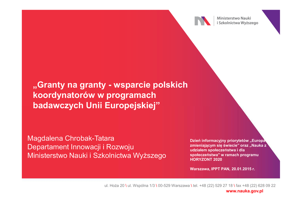 „Granty na granty - wsparcie polskich koordynatorów w programach badawczych Unii Europejskiej” Magdalena Chrobak-Tatara Departament Innowacji i Rozwoju Ministerstwo Nauki i Szkolnictwa Wyższego Dzień informacyjny priorytetów „Europa w zmieniającym się świecie” oraz „Nauka z udziałem społeczeństwa i dla społeczeństwa” w ramach programu HORYZONT 2020 Warszawa, IPPT PAN, 20.01.2015 r. ul. Hoża 20 \ ul. Wspólna 1/3 \ 00-529 Warszawa \ tel. +48 (22) 529 27 18 \ fax +48 (22) 628 09 22 www.nauka.gov.pl Podstawy prawne 1. Ustawa z dnia 30 kwietnia 2010 r. o zasadach finansowania nauki (Dz. U. z 2014 r., poz. 1620) 2. Komunikat Ministra Nauki i Szkolnictwa Wyższego z dnia 21 maja 2014 r. o ustanowieniu programu pod nazwą „Granty na granty – wsparcie polskich koordynatorów w programach badawczych Unii Europejskiej” 3. Ogłoszenie o naborze wniosków Granty na Granty www.nauka.gov.pl Cel programu • Cel: wsparcie polskich jednostek naukowych, które o realizację projektów w ramach programów badawczych Unii Europejskiej • Dla jednostek, które zamierzają podjąć się roli koordynatora w planowanym projekcie oraz stworzyć międzynarodowe konsorcjum • W ramach programu wnioskodawcy mogą uzyskać środki finansowe na działania związane z przygotowaniem wniosku projektowego do programu badawczego Unii Europejskiej w odpowiedzi na wezwanie konkursowe Granty na Granty ubiegają się www.nauka.gov.pl Adresaci programu O przyznanie środków finansowych w ramach programu mogą ubiegać się jednostki naukowe, o których mowa w art. 2 pkt 9 ustawy z dnia 30 kwietnia 2010 r. o zasadach finansowania nauki (Dz. U. Nr 96, poz. 615, z późn. zm.) z wyłączeniem podmiotów, dla których przyznanie środków finansowych stanowiłoby pomoc państwa w rozumieniu przepisów Unii Europejskiej. Granty na Granty www.nauka.gov.pl Wysokość finansowania i koszty • Maksymalny poziom finansowania: 30 • Koszty kwalifikowalne: dodatkowe rozpoznanie; napisanie wniosku; konferencje; spotkania robocze • Koszty niekwalifikowalne: koszty pośrednie; koszty podatku od towarów i usług (VAT), jeśli mogą zostać odzyskane w oparciu o przepisy ustawy z dnia 11 marca 2004 r. o podatku od towarów i usług Granty na Granty 000 zł www.nauka.gov.pl Możliwości finansowania Dwie ścieżki: 1. pokrycie planowanych kosztów 2. refundacja kosztów Granty na Granty www.nauka.gov.pl Pokrycie planowanych kosztów • Środki finansowe przyznaje się na okres nie dłuższy niż 12 miesięcy. • Wnioskodawca, któremu zostaną przyznane środki finansowe, jest zobowiązany do przekazania wniosku projektowego przed złożeniem go na wezwanie konkursowe do recenzji dwóch ekspertów. • Zadaniem eksperta będzie udzielenie wnioskodawcy wskazówek dotyczących poprawy lub uzupełnienia wniosku projektowego. • Eksperci są wskazywani przez Krajowy Punkt Kontaktowy Programów Badawczych UE. • O wskazanych ekspertach wnioskodawcę informuje ministerstwo. Granty na Granty www.nauka.gov.pl Refundacja kosztów • Jeżeli wniosek projektowy uzyskał liczbę punktów powyżej progu (threshold) wyznaczonego przez Komisję Europejską lub inny upoważniony przez nią podmiot w ramach ostatecznej punktacji określonej dla danego wezwania konkursowego (w przypadku konkursu dwuetapowego za ostateczną punktację rozumie się liczbę punktów uzyskaną w drugim etapie oceny wniosków projektowych) • Refundacja obejmuje koszty poniesione w okresie nie dłuższym niż 6 miesięcy przed dniem złożenia wniosku projektowego Granty na Granty www.nauka.gov.pl Ogłoszenie o naborze wniosków • Środki finansowe w ramach programu są przyznawane w drodze naboru wniosków ogłoszonego przez Ministra. • Nabór wniosków w ramach I edycji programu zakończył się 31 grudnia 2014 r. • W pierwszym kwartale 2015 r. planowane jest ogłoszenie kolejnej edycji programu. • Informacje będą na bieżąco zamieszczane na stronach Ministerstwa. Granty na Granty www.nauka.gov.pl Strona internetowa programu: www.nauka.gov.pl/granty-na-granty Osoba do kontaktu: Aleksandra Kropop Departament Nauki Wydział Programów Międzynarodowych tel. 22 50 17 150 e-mail: [email protected] www.nauka.gov.pl Granty na Granty Dziękuję za uwagę [email protected] ul. Hoża 20 \ ul. Wspólna 1/3 \ 00-529 Warszawa \ tel. +48 (22) 529 27 18 \ fax +48 (22) 628 09 22 www.nauka.gov.pl