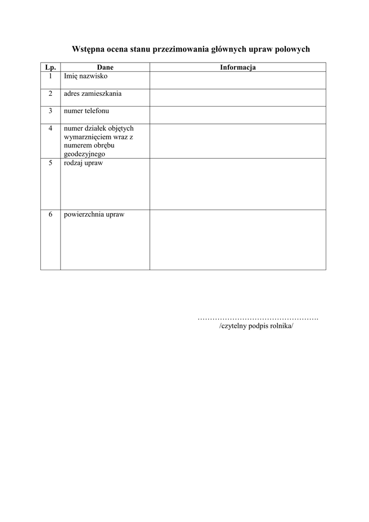 Wstępna ocena stanu przezimowania głównych upraw polowych Lp. 1 Dane Imię nazwisko 2 adres zamieszkania 3 numer telefonu 4 5 numer działek objętych wymarznięciem wraz z numerem obrębu geodezyjnego rodzaj upraw 6 powierzchnia upraw Informacja …………………………………………. /czytelny podpis rolnika/