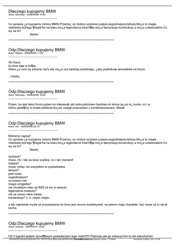 Dlaczego kupujemy BMW Autor: Motramp - 2006/04/06 10:50 _____________________________________ Co sprawia ¿e kupujemy motory BMW.Przecie¿ s± motory szybsze,l¿ejsze,wygodniejsze,tañsze.Mo¿e to magia niebiesko-bia³ego ¶migie³ka na baku,mo¿e legendarna trwa³o¶æ,mo¿e fascynacja konstrukcj± a mo¿e uniwersalizm.Co wy na to? Marek ============================================================================ Odp:Dlaczego kupujemy BMW Autor: Mazby - 2006/04/06 11:00 _____________________________________ Oh Karol, ta zima daje w ko¶æ. Wiem,¿e ruch na witrynie ma³y ale mo¿e cos bardziej ambitnego, ¿eby podkrêciæ atmosferke na forum. ...mazby ============================================================================ Odp:Dlaczego kupujemy BMW Autor: Motramp - 2006/04/06 12:02 _____________________________________ Pytam ,bo jest takie forum.pytam bo interesujê siê motocyklizmem bardziej od strony je¿ca ni¿ konia, no i w koñcu jeste¶my w dziale pitolenie.Ka¿d± uwagê przeczytam z zainteresowaniem. Marek ============================================================================ Odp:Dlaczego kupujemy BMW Autor: ron - 2006/04/06 22:19 _____________________________________ Motramp napisa³: Co sprawia ¿e kupujemy motory BMW.Przecie¿ s± motory szybsze,l¿ejsze,wygodniejsze,tañsze.Mo¿e to magia niebiesko-bia³ego ¶migie³ka na baku,mo¿e legendarna trwa³o¶æ,mo¿e fascynacja konstrukcj± a mo¿e uniwersalizm.Co wy na to? Marek szybsze? moze. r4v i tak sa dosc szybkie. no i ten moment! lzejsze? moze. widac nie wszystkim to przeszkadza. tansze? jesli nowe. wygodniejsze? na pewno nie! magia smigielka? nie chcialbym miec np f650 za nic w swiecie. legendarna trwalosc? nie sa znowu takie trwale... konstrukcja? o, o, cieplo cieplo... a tak naprawde mysle ze przywiazanie do bmw jest mocno subiektywne. na pewno maja charakter. byc moze za to sie je kocha. ============================================================================ Odp:Dlaczego kupujemy BMW Autor: czwarty - 2006/04/14 18:58 _____________________________________ Od 3 tygodni jestem szczê¶liwym posiadaczem tego moto!!!!!! Poprostu jak go zobaczy³em to siê zakocha³em ARCHIWUM FoRUM BOXER-MOTOR - MOTOCYKLE BMW sklep BOXER-PARTS.eu MamboBoard czê¶ci i akcesoria Forum Component version: 1.4 Stable Generated: 4 March, 2017, 01:58 os±d¼cie sami!!!!!!!Mokrego dyngusa!!!!!!!!!!:evil: Niestety nie ten rozmiar zdjêcia!!!:( Edytowany przez: czwarty, w: 2006.04.14 18:59 ============================================================================ Odp:Dlaczego kupujemy BMW Autor: consigliero - 2006/04/14 21:08 _____________________________________ To moje nowe cacko http://www.boxer-motor.com/components/com_mamboboard/uploaded/images/12.jpg ============================================================================ Odp:Dlaczego kupujemy BMW Autor: polarfox - 2006/04/17 11:17 _____________________________________ jak pitoöenie to pitolenie. fajnie ze jest to forum,jestem na dyzurze od 3 dni i juz mi sie bezpieczniki pala.to dobrze wtedy pomarzyc.zwlaszcza korci mnie, zeby opisac moja wyprawe z dziewczyna na Krete 2003 moze by komus tes sie zachcialo pomarzyc.. co do bemek: jezdzilem simsonem,potem mz150 i 250.hm,wtedy to byly czasy, king of the road. simsonem wokol pomorza, raz z berlina do warszawy w 12 godzin za TIR ami, zeby szybciej..plecki bolaly oj bolaly.w warszawie wtedy mozna bylo jeszcze kolezanki ze studiow zabrac na simsona..chociaz juz sie zaczynaly gorsze czasy. branie bylo od fiata 126 wzwyz.wtedy jeszcze nie bylo klopotow z parkowaniem.. MZ 250: to byl k. zajeb,zle wywazone, probowalo wywalic na zakretach.ale jak sie przesiadlem z simsona to na mztce na myslalem ze mnie zwieje z kanapy.(ale tylko za 1 razem) znowu king of ther road.. w skalki czestochowskie z kumplem na mztce: pelny sprzet , moto przeladowane a my 140 na godzine( no, powiedzmy 120) a ja sie dziwilem,ze pali 14 litrow.. w niemczech kupilem Yamahe Diversion 900. o, znowu ten king.. ciezkie to, pilo duzo- 8 do 9, ale wygodne, 6 lat tym pojezdzilem.opony musialem wymieniac co 10 000, bo darly sie,a ja jezdze bez jakiegois palenia gumy. wtedy zobaczylem BM ki. wydawaly mi sie drogie.raz sie skusilem zeby sie przejechac,ROADSTEREM. wrazenie bylo po mieciutkim bzyczeniu moich 4 rzedowych cylinderkow takie,jakbym lecial AN2...brr.i ten moment obrotowy, musialem kontrowac kerownica,zeby sie nie zwalic na skrzazowaniu ;-) stanowczo nie.,nie podobalo mi sie. ale nadal mnie intrygowalo, dlaczego germanie tak chetnie toto kupuja. wtedy przejechalem sie GS 1150.ale sie zdziwilem, charakterystyka ,wygody i mnostwo itp-ow -wtedy zrozumialem co to za moto. potem : spalanie 5-7,potem opony- wymienilem (metzeler tourance) dopiero po 26 000 km ( nie bede tego juz robilprzerazilem sie jak w tylnym kole pokazaly sie na biezniku ..druty.. kolo nie peklo, dojechalem do domu. dwa razy lezalem: raz na gownie na krecie, raz po pijanemu ( juz dawno nie pije) wtedy moto byl bez bez gmoli (chyba tak sie w pl nazywa te dziwne rury?) mocno sie dziwilem, ze oprocz dekla na cylindrze prawie bez zadrasniec ( troche szyba, troche mocowanie kufra, ale nie widac). jakbym to wywalil Yamaha, to zaplacilbym tysiace za plastiki.. teraz mam te rury.(gmole?) mole? motto: nie pytaj CZY sie wywalisz- tylko KIEDY.. taki madrala uze mnie. teraz wiem czemu wybralem BM GS:laugh: bylem na Krecie moja BMka. pieknie bylo, wygodnie. ABS. myslalem, ze tego nigdy nie bede potrzebowac. mylilem sie: juz teraz nie chce moto bez.. ARCHIWUM FoRUM BOXER-MOTOR - MOTOCYKLE BMW sklep BOXER-PARTS.eu MamboBoard czê¶ci i akcesoria Forum Component version: 1.4 Stable Generated: 4 March, 2017, 01:58 tyle na razie, bo co tu udowadniac dawno udowodnione.. pozdronienia piotr ============================================================================ Odp:Dlaczego kupujemy BMW Autor: Irek R1100RS - 2006/04/19 22:40 _____________________________________ A zes Panie zaczal stopniowac... Szybsze -> to zale