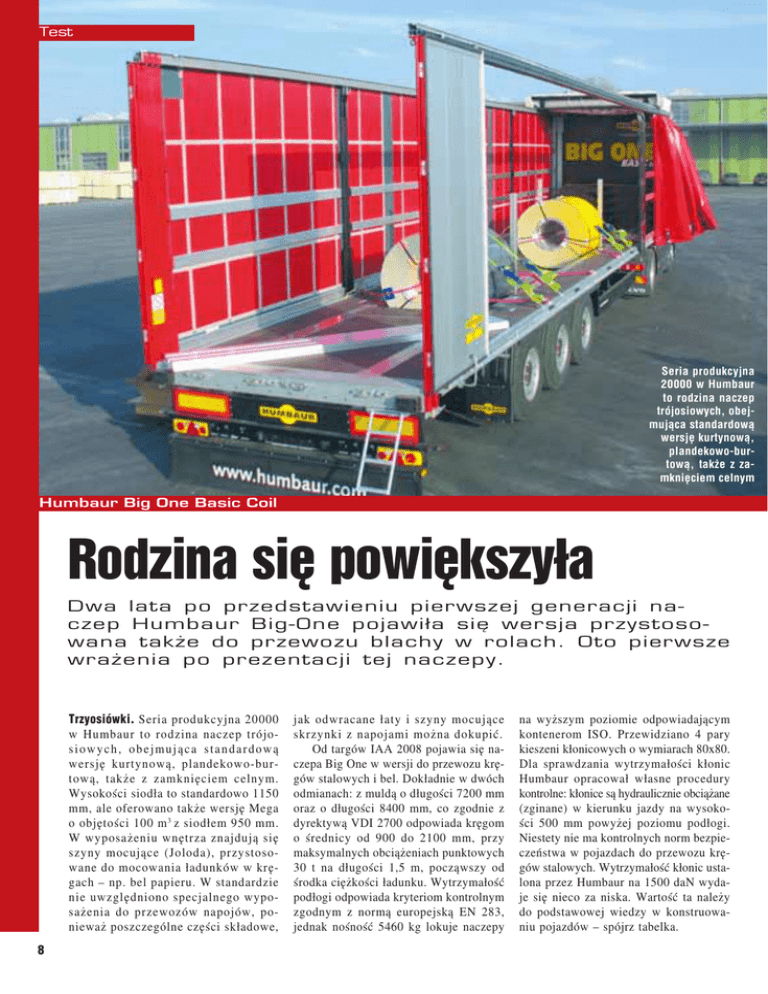 Test Seria produkcyjna 20000 w Humbaur to rodzina naczep trójosiowych, obej− mująca standardową wersję kurtynową, plandekowo−bur− tową, także z za− mknięciem celnym Humbaur Big One Basic Coil Rodzina się powiększyła Dwa lata po przedstawieniu pierwszej generacji na− czep Humbaur Big−One pojawiła się wersja przystoso− wana także do przewozu blachy w rolach. Oto pierwsze wrażenia po prezentacji tej naczepy. Trzyosiówki. Seria produkcyjna 20000 w Humbaur to rodzina naczep trójo− siowych, obejmująca standardową wersję kurtynową, plandekowo−bur− tową, także z zamknięciem celnym. Wysokości siodła to standardowo 1150 mm, ale oferowano także wersję Mega o objętości 100 m 3 z siodłem 950 mm. W wyposażeniu wnętrza znajdują się szyny mocujące (Joloda), przystoso− wane do mocowania ładunków w krę− gach – np. bel papieru. W standardzie nie uwzględniono specjalnego wypo− sażenia do przewozów napojów, po− nieważ poszczególne części składowe, 8 jak odwracane łaty i szyny mocujące skrzynki z napojami można dokupić. Od targów IAA 2008 pojawia się na− czepa Big One w wersji do przewozu krę− gów stalowych i bel. Dokładnie w dwóch odmianach: z muldą o długości 7200 mm oraz o długości 8400 mm, co zgodnie z dyrektywą VDI 2700 odpowiada kręgom o średnicy od 900 do 2100 mm, przy maksymalnych obciążeniach punktowych 30 t na długości 1,5 m, począwszy od środka ciężkości ładunku. Wytrzymałość podłogi odpowiada kryteriom kontrolnym zgodnym z normą europejską EN 283, jednak nośność 5460 kg lokuje naczepy na wyższym poziomie odpowiadającym kontenerom ISO. Przewidziano 4 pary kieszeni kłonicowych o wymiarach 80x80. Dla sprawdzania wytrzymałości kłonic Humbaur opracował własne procedury kontrolne: kłonice są hydraulicznie obciążane (zginane) w kierunku jazdy na wysoko− ści 500 mm powyżej poziomu podłogi. Niestety nie ma kontrolnych norm bezpie− czeństwa w pojazdach do przewozu krę− gów stalowych. Wytrzymałość kłonic usta− lona przez Humbaur na 1500 daN wyda− je się nieco za niska. Wartość ta należy do podstawowej wiedzy w konstruowa− niu pojazdów – spójrz tabelka. Podwozie. Rama Big One Basic Coil waży ponad 500 kg, czyli więcej niż jej odpo− wiednik w naczepie bez wnęki. Odpowia− dają za to podłużnice o większych rozmia− rach oraz wygięte dźwigary poprzeczne. Do tego dochodzi olbrzymia liczba śrub i nakrętek, gdyż jak wiadomo ciężkie po− jazdy w Humbaur są montowane za po− mocą połączeń śrubowych. Wiązki i przewody położone są w dwóch liniach. Z powodu obecności mul− dy trzy zbiorniki na sprężone powietrze za− mocowano wzdłużnie w części tylnej. Tak jak wcześniej planowano, Humbaur zna− lazł łatwiejszą pozycję montowania modułu EBS naczepy, mianowicie przy dźwigarze C, przed środkową osią. Podczas odbio− ru testowej naczepy z EBS poinformowano, że funkcjonuje również program ochrony przed wywróceniem. Humbaur standardowo wbudowuje hamulce Knorr G2, na życzenie może to być Wabco TEBS−E. W podwo− ziach seryjnie montowane są osie SAF− Intradisc−Integral, opcjonalnie Gigant−Euro− Achse z resorem prowadzącym. Co jeszcze w przyczepie testowej było zamontowane dodatkowo, a w wersjach produkcyjnych jest już standardem, to osłona przeciwnajazdowa z integralnym oświetle− niem. Przygotowując nowy model nacze− py Humbaur oddzielił rzędy świateł od rury osłony przeciwnajazdowej, w każdym ra− zie pokazuje to najnowszy prospekt. Po− zostaje dodać, że każdy odcinek sklejki wielowarstwowej tworzącej pokrycie muldy ma jeden otwór, dzięki czemu można go zdemontować bez użycia narzędzi. To ważne, kiedy zakrywa się wnękę przewożąc ładunki częściowe. W praktyce interesuje to naj− bardziej spedytorów obsługujących ładunki częściowe właśnie takimi naczepami. jeździ i troszczy się o bezpieczeństwo ładunku. Na podstawie takich ustaleń pojechałem najpierw do Übach−Palen− berg, potem do Aalen−Unterkochen, a następnie do Buttenwiesen. W Mera, w spółce handlowej Spanset w Übach−Palenberg, zaopatrzyłem się w maty antypoślizgowe i ochraniacze kra− wędzi. Niestety było za mało czasu na zamówienie specjalnych ochraniaczy kra− wędzi mocowanych na napinanych łań− cuch – Secutex, które są robione tylko na zamówienie. Dlatego KFZ−Anzeiger pracuje zarówno ze zwykłymi ochrania− czami, jak i ze specjalnymi „KaSI”, w których napinacze przewidziano tylko dla pasów wiążących. Drugi etap testu odbył się w Aalen w firmie Rieger i Dietz. Tam na miejscu ekspert od techniki wiązań łańcuchowych – Ale− xander Hoffmann, obliczył mi dopiero, co musiałbym technicznie mieć, żeby załado− wać zwoje ważące po ok 6 t. Wynikiem były 4 łańcuchy typu ICE 12 klasy jako− ści, które od półtora roku są na rynku, a z którymi do tej pory nie miałem do czy− nienia (mimo wiedzy, że istnieją). Po sprawdzeniu w praktyce, jak działa opatentowany system skracania łańcuchów „Snappy”, pojechałem dalej do Gerstho− fen: mocowania zostały załadowane na Big One, przykrycie muld zostało już zdjęte i przymocowane na ścianie czołowej. Po− tem, po połączeniu naczepy z Volvo FH, ruszyłem w kierunku Buttenwiesen, gdyż Kłonice 80x80x5mm Standardowy przekrój poprzeczny dla wty− kanych kłonic nie mówi nic o sile, jaką może przenieść taka część. Ponieważ wartość ta, określona w próbie praktycznej przez Tho− masa Eschey z Humbaur wynosi 1500 daN na 500 mm wysokości kłonicy, wydała mi się trochę za niska, popytałem trochę wkoło. Po pierwsze: Thorsten Perk, fabryka Krone w Werlte, wcisnął takie same kłonice w różne wysokości montażowe i przy 500 m odkrył to samo, co także i w Humbaur zostało zmie− rzone. Po drugie: Christoph Bleker z Schmitz Cargobull objaśnił mi dwa kry