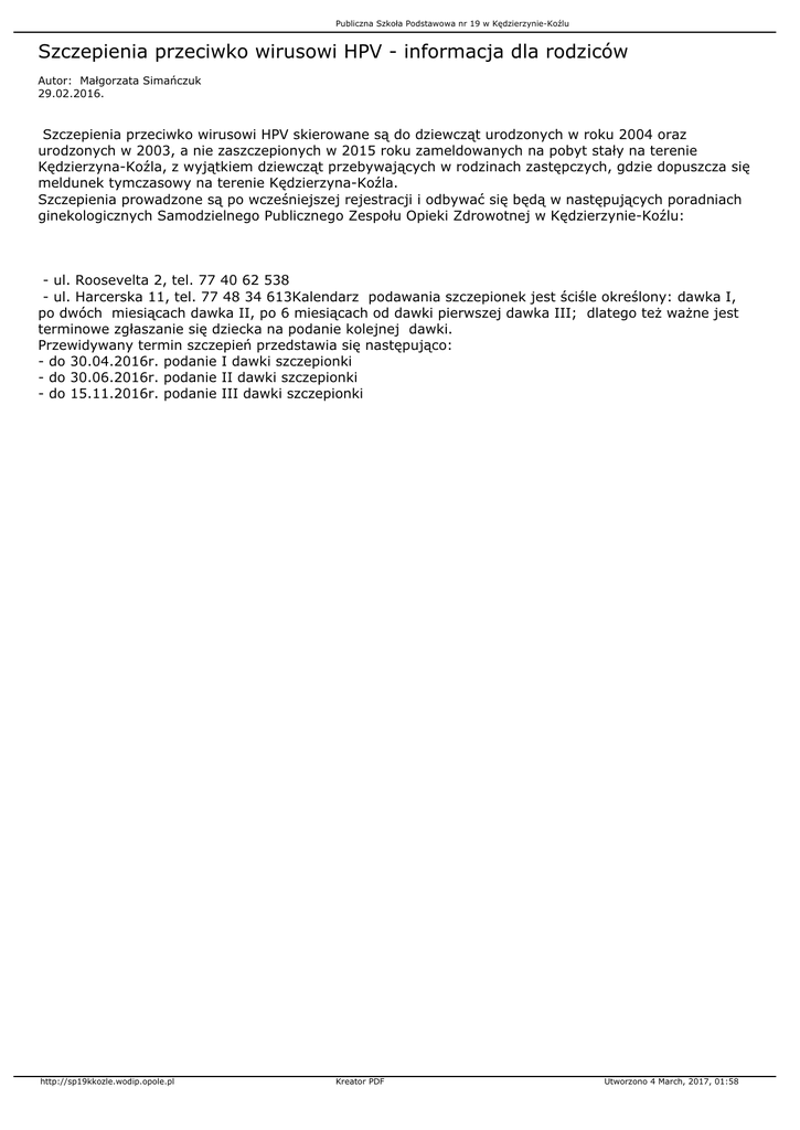Publiczna Szkoła Podstawowa nr 19 w Kędzierzynie-Koźlu Szczepienia przeciwko wirusowi HPV - informacja dla rodziców Autor: Małgorzata Simańczuk 29.02.2016. Szczepienia przeciwko wirusowi HPV skierowane są do dziewcząt urodzonych w roku 2004 oraz urodzonych w 2003, a nie zaszczepionych w 2015 roku zameldowanych na pobyt stały na terenie Kędzierzyna-Koźla, z wyjątkiem dziewcząt przebywających w rodzinach zastępczych, gdzie dopuszcza się meldunek tymczasowy na terenie Kędzierzyna-Koźla. Szczepienia prowadzone są po wcześniejszej rejestracji i odbywać się będą w następujących poradniach ginekologicznych Samodzielnego Publicznego Zespołu Opieki Zdrowotnej w Kędzierzynie-Koźlu: - ul. Roosevelta 2, tel. 77 40 62 538 - ul. Harcerska 11, tel. 77 48 34 613Kalendarz podawania szczepionek jest ściśle określony: dawka I, po dwóch miesiącach dawka II, po 6 miesiącach od dawki pierwszej dawka III; dlatego też ważne jest terminowe zgłaszanie się dziecka na podanie kolejnej dawki. Przewidywany termin szczepień przedstawia się następująco: - do 30.04.2016r. podanie I dawki szczepionki - do 30.06.2016r. podanie II dawki szczepionki - do 15.11.2016r. podanie III dawki szczepionki http://sp19kkozle.wodip.opole.pl Kreator PDF Utworzono 4 March, 2017, 01:58