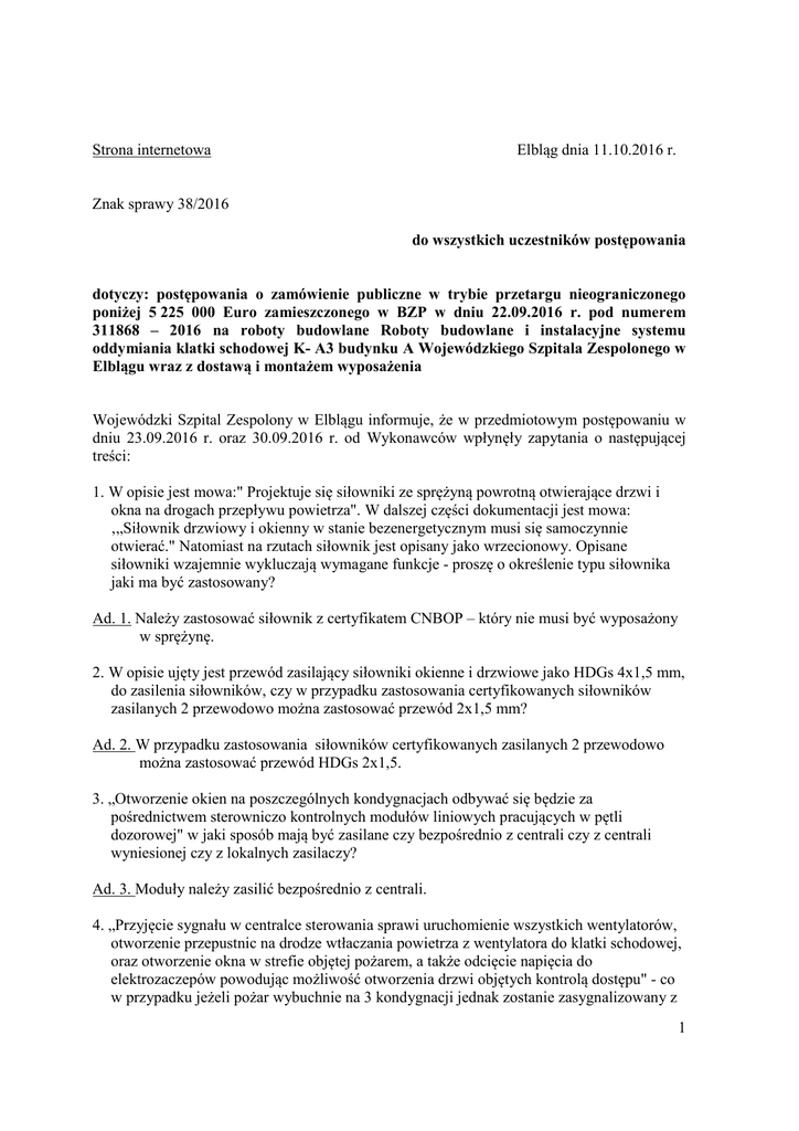 Strona internetowa Elbląg dnia 11.10.2016 r. Znak sprawy 38/2016 do wszystkich uczestników postępowania dotyczy: postępowania o zamówienie publiczne w trybie przetargu nieograniczonego poniżej 5 225 000 Euro zamieszczonego w BZP w dniu 22.09.2016 r. pod numerem 311868 – 2016 na roboty budowlane Roboty budowlane i instalacyjne systemu oddymiania klatki schodowej K- A3 budynku A Wojewódzkiego Szpitala Zespolonego w Elblągu wraz z dostawą i montażem wyposażenia Wojewódzki Szpital Zespolony w Elblągu informuje, że w przedmiotowym postępowaniu w dniu 23.09.2016 r. oraz 30.09.2016 r. od Wykonawców wpłynęły zapytania o następującej treści: 1. W opisie jest mowa:" Projektuje się siłowniki ze sprężyną powrotną otwierające drzwi i okna na drogach przepływu powietrza". W dalszej części dokumentacji jest mowa: ‚„Siłownik drzwiowy i okienny w stanie bezenergetycznym musi się samoczynnie otwierać." Natomiast na rzutach siłownik jest opisany jako wrzecionowy. Opisane siłowniki wzajemnie wykluczają wymagane funkcje - proszę o określenie typu siłownika jaki ma być zastosowany? Ad. 1. Należy zastosować siłownik z certyfikatem CNBOP – który nie musi być wyposażony w sprężynę. 2. W opisie ujęty jest przewód zasilający siłowniki okienne i drzwiowe jako HDGs 4x1,5 mm, do zasilenia siłowników, czy w przypadku zastosowania certyfikowanych siłowników zasilanych 2 przewodowo można zastosować przewód 2x1,5 mm? Ad. 2. W przypadku zastosowania siłowników certyfikowanych zasilanych 2 przewodowo można zastosować przewód HDGs 2x1,5. 3. „Otworzenie okien na poszczególnych kondygnacjach odbywać się będzie za pośrednictwem sterowniczo kontrolnych modułów liniowych pracujących w pętli dozorowej" w jaki sposób mają być zasilane czy bezpośrednio z centrali czy z centrali wyniesionej czy z lokalnych zasilaczy? Ad. 3. Moduły należy zasilić bezpośrednio z centrali. 4. „Przyjęcie sygnału w centralce sterowania sprawi uruchomienie wszystkich wentylatorów, otworzenie przepustnic na drodze wtłaczania powietrza z wentylatora do klatki schodowej, oraz otworzenie okna w strefie objętej pożarem, a także odcięcie napięcia do elektrozaczepów powodując możliwość otworzenia drzwi objętych kontrolą dostępu" - co w przypadku jeżeli pożar wybuchnie na 3 kondygnacji jednak zostanie zasygnalizowany z 1 przycisku na kondygnacji 4 ? Zgodnie z założeniem projektowym okna zostaną otwarte na kondygnacji 4. Ad. 4. Przyjęcie sygnału musi spowodować otworzenie okien i drzwi przepływu na wszystkich kondygnacjach. 5. Projektuje się linie i moduły monitorujące stan urządzeń systemu zapobiegający zadymieniu - jakie stany mają być monitorowane? Ad. 5. Monitorowaniem należy objąć stany urządzeń potwierdzające otworzenie dróg napowietrzania i odpływu powietrza. 6. W przedmiarze jest ujętych 10 siłowników okien jednak na rzutach jest 16 szt. Która ilość jest prawidłowa? Ad. 6. Należy przyjąć ilość siłowników w/g projektu to jest 16 szt. 7. Na schemacie przepływu powietrza są umieszczone dwie linie dozorowe jedna to 4000 druga natomiast 6000 - zgodnie z nomenklaturą przywołanego producenta to dwa różne systemy, różniące się od siebie - jaki należy zastosować? Ad. 7. Należy zastosować system 6000 – kompatybilny z liniami systemu 4000. 8. Czy dokumentacja jest uzgodniona z Rzeczoznawcą ds. przeciw pożarowych? Ad. 8. Dokumentacja jest uzgodniona z Rzeczoznawcą do spraw p-poż. 9. Czy zamawiający dopuszcza zastosowanie innego systemu oddymiania klatki schodowej wraz z opracowaniem dokumentacji spełniającej obowiązujące wymagania? Ad. 9. Zamawiający nie dopuszcza. 10. Czy zamawiający posiada ekspertyzę stanu ochrony przeciw pożarowej dotyczącą budynku opracowaną przez Rzeczoznawcę ds. przeciw pożarowych? Ad. 10. Zamawiający posiada ekspertyzę. 11. „Projektuje się przycisk S przy centralce sygnalizacji pożaru umożliwiajqcy wydanie komendy wznowienia pracy wentylatora N1" - brak informacji odnośnie scenariusza zadziałania przycisku „S" - W systemach sygnalizacji pożarowej należy montować urządzenia posiadające certyfikaty CNBOP - proszę o przedstawienie przycisku pożarowego wielokrotnego użytku dla wysłania kilku procedur do centrali. A mianowicie centrala wykryła zadymienie w kanale nawiewnym poprzez czujkę zamontowaną w kanale - co w przypadku projektowanego kanału jest mało prawdopodobne. Zadaniem centrali jest nie uruchomienie wentylatora N1. W tym samym momencie uprawniona osoba wydaje komendę start wentylatora N1 - jak ma zachować się system przypadku zamkniętego styku przycisku „S" przy braku jego ponownego użycia? 2 Ad. 11. Komeda czytana z przycisku winna posiadać wyższy priorytet od czujki w kanale nawiewnym. 12.W jaki sposób mają być zasilane siłowniki okienne? 16 siłowników potrzebuje około 16 A przy zastosowaniu siłownika 1A, natomiast gdy zajdzie potrzeba zastosowania siłownika 2A to wartość wzrasta do 32A. Jakie rozwiązanie proponuje zamawiający? Ad. 12. Zasilanie siłowników należy zapewnić poprzez sekcję zasilaną zprzed wyłącznika pożarowego 13. Czy można zainstalować na każdej kondygnacji centralę oddymiania na linii dozorowej która będzie odpowiadać za sterowanie i kontrolę okien oraz zwolnienie elektrozaczepów? Ad. 13. Proponowane centrale oddymiania winny zapewniać komunikacją z centralą sterowania wentylatorami i CSP w jednolitym certyfikowanym systemie. Będzie to rozwiązanie droższe. 14. W przypadku sterowania skrzydłem okna przez siłownik, w normalnym użytkowaniu nie da się korzystać z okna czy zamawiający wyraża na to zgodę? Ad. 14. Okna z zamontowanymi siłownikami nie będą przeznaczone do otwierania ręcznego. 15. W jaki sposób ma być rozwiązany system monitorowania otwarcia dróg napowietrzania ? O ile siłowniki do przepustnic występują z wbudowanymi krańcówkami o tyle cer