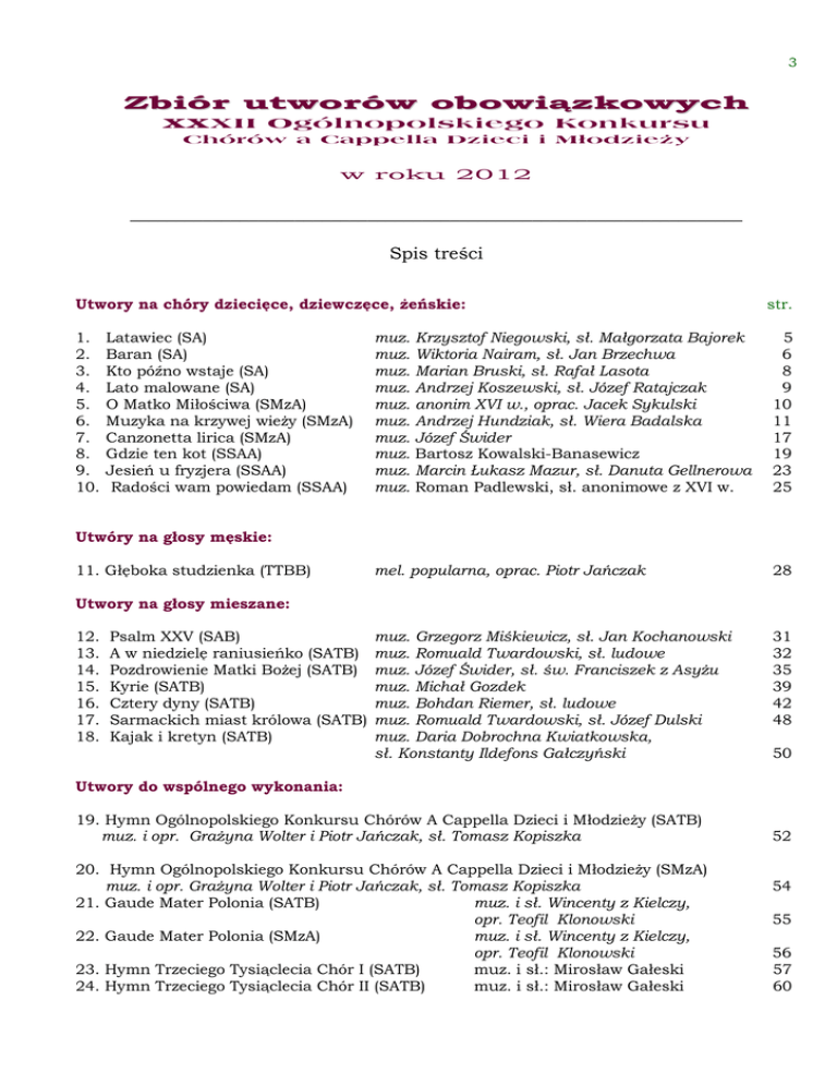 3 Zbiór utworów obowiązkowych XXXII Ogólnopolskiego Konkursu Chórów a Cappella Dzieci i Młodzieży w roku 2012 ___________________________________________________________________ Spis treści Utwory na chóry dziecięce, dziewczęce, żeńskie: 1. 2. 3. 4. 5. 6. 7. 8. 9. 10. Latawiec (SA) Baran (SA) Kto późno wstaje (SA) Lato malowane (SA) O Matko Miłościwa (SMzA) Muzyka na krzywej wieży (SMzA) Canzonetta lirica (SMzA) Gdzie ten kot (SSAA) Jesień u fryzjera (SSAA) Radości wam powiedam (SSAA) str. muz. Krzysztof Niegowski, sł. Małgorzata Bajorek muz. Wiktoria Nairam, sł. Jan Brzechwa muz. Marian Bruski, sł. Rafał Lasota muz. Andrzej Koszewski, sł. Józef Ratajczak muz. anonim XVI w., oprac. Jacek Sykulski muz. Andrzej Hundziak, sł. Wiera Badalska muz. Józef Świder muz. Bartosz Kowalski-Banasewicz muz. Marcin Łukasz Mazur, sł. Danuta Gellnerowa muz. Roman Padlewski, sł. anonimowe z XVI w. 5 6 8 9 10 11 17 19 23 25 mel. popularna, oprac. Piotr Jańczak 28 muz. Grzegorz Miśkiewicz, sł. Jan Kochanowski muz. Romuald Twardowski, sł. ludowe muz. Józef Świder, sł. św. Franciszek z Asyżu muz. Michał Gozdek muz. Bohdan Riemer, sł. ludowe muz. Romuald Twardowski, sł. Józef Dulski muz. Daria Dobrochna Kwiatkowska, sł. Konstanty Ildefons Gałczyński 31 32 35 39 42 48 Utwóry na głosy męskie: 11. Głęboka studzienka (TTBB) Utwory na głosy mieszane: 12. 13. 14. 15. 16. 17. 18. Psalm XXV (SAB) A w niedzielę raniusieńko (SATB) Pozdrowienie Matki Bożej (SATB) Kyrie (SATB) Cztery dyny (SATB) Sarmackich miast królowa (SATB) Kajak i kretyn (SATB) 50 Utwory do wspólnego wykonania: 19. Hymn Ogólnopolskiego Konkursu Chórów A Cappella Dzieci i Młodzieży (SATB) muz. i opr. Grażyna Wolter i Piotr Jańczak, sł. Tomasz Kopiszka 20. Hymn Ogólnopolskiego Konkursu Chórów A Cappella Dzieci i Młodzieży (SMzA) muz. i opr. Grażyna Wolter i Piotr Jańczak, sł. Tomasz Kopiszka 21. Gaude Mater Polonia (SATB) muz. i sł. Wincenty z Kielczy, opr. Teofil Klonowski 22. Gaude Mater Polonia (SMzA) muz. i sł. Wincenty z Kielczy, opr. Teofil Klonowski 23. Hymn Trzeciego Tysiąclecia Chór I (SATB) muz. i sł.: Mirosław Gałeski 24. Hymn Trzeciego Tysiąclecia Chór II (SATB) muz. i sł.: Mirosław Gałeski 52 54 55 56 57 60 4 25. Hymn Trzeciego Tysiąclecia Chór III (SA) 26. Hymn Trzeciego Tysiąclecia (fortepian) 27. Hymn Trzeciego Tysiąclecia (wyciąg) 28. 29. 30. 31. 32. muz. i sł.: Mirosław Gałeski muz. i sł.: Mirosław Gałeski muz. i sł.: Mirosław Gałeski 62 64 68 Słowniczek Regulamin XXXII Ogólnopolskiego Konkursu Chórów A Cappella Dzieci i Młodzieży Karta kwalifikacyjna Karta repertuarowa Protokół eliminacji wojewódzkich 78 81 85 86 87 UWAGA! Hymnu III Tysiąclecia Mirosława Gałęskiego prosimy nauczyć następująco: • • • Chór I i chór II wszystkie chóry mieszane. Chór III wszystkie chóry dziecięce i żeńskie. Chóry męskie prosimy o nauczenie partii tenorów i basów z chórów I i II.