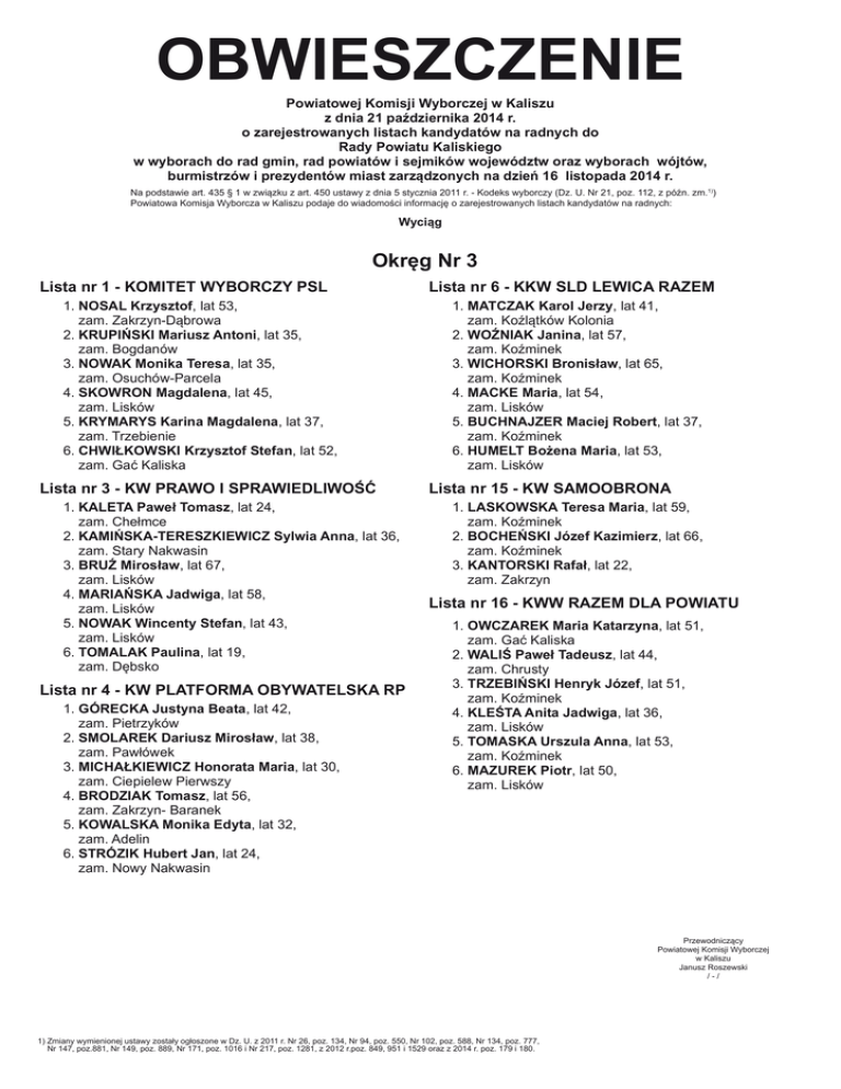 OBWIESZCZENIE Powiatowej Komisji Wyborczej w Kaliszu z dnia 21 października 2014 r. o zarejestrowanych listach kandydatów na radnych do Rady Powiatu Kaliskiego w wyborach do rad gmin, rad powiatów i sejmików województw oraz wyborach wójtów, burmistrzów i prezydentów miast zarządzonych na dzień 16 listopada 2014 r. Na podstawie art. 435 § 1 w związku z art. 450 ustawy z dnia 5 stycznia 2011 r. - Kodeks wyborczy (Dz. U. Nr 21, poz. 112, z późn. zm.1)) Powiatowa Komisja Wyborcza w Kaliszu podaje do wiadomości informację o zarejestrowanych listach kandydatów na radnych: Wyciąg Okręg Nr 3 Lista nr 1 - KOMITET WYBORCZY PSL Lista nr 6 - KKW SLD LEWICA RAZEM Lista nr 3 - KW PRAWO I SPRAWIEDLIWOŚĆ Lista nr 15 - KW SAMOOBRONA 1. N OSAL Krzysztof, lat 53, zam. Zakrzyn-Dąbrowa 2. K RUPIŃSKI Mariusz Antoni, lat 35, zam. Bogdanów 3. N OWAK Monika Teresa, lat 35, zam. Osuchów-Parcela 4. S KOWRON Magdalena, lat 45, zam. Lisków 5. K RYMARYS Karina Magdalena, lat 37, zam. Trzebienie 6. C HWIŁKOWSKI Krzysztof Stefan, lat 52, zam. Gać Kaliska 1. K ALETA Paweł Tomasz, lat 24, zam. Chełmce 2. K AMIŃSKA-TERESZKIEWICZ Sylwia Anna, lat 36, zam. Stary Nakwasin 3. B RUŹ Mirosław, lat 67, zam. Lisków 4. M ARIAŃSKA Jadwiga, lat 58, zam. Lisków 5. N OWAK Wincenty Stefan, lat 43, zam. Lisków 6. T OMALAK Paulina, lat 19, zam. Dębsko Lista nr 4 - KW PLATFORMA OBYWATELSKA RP 1. G ÓRECKA Justyna Beata, lat 42, zam. Pietrzyków 2. S MOLAREK Dariusz Mirosław, lat 38, zam. Pawłówek 3. M ICHAŁKIEWICZ Honorata Maria, lat 30, zam. Ciepielew Pierwszy 4. B RODZIAK Tomasz, lat 56, zam. Zakrzyn- Baranek 5. K OWALSKA Monika Edyta, lat 32, zam. Adelin 6. S TRÓZIK Hubert Jan, lat 24, zam. Nowy Nakwasin 1. M ATCZAK Karol Jerzy, lat 41, zam. Koźlątków Kolonia 2. W OŹNIAK Janina, lat 57, zam. Koźminek 3. W ICHORSKI Bronisław, lat 65, zam. Koźminek 4. M ACKE Maria, lat 54, zam. Lisków 5. B UCHNAJZER Maciej Robert, lat 37, zam. Koźminek 6. H UMELT Bożena Maria, lat 53, zam. Lisków 1. L ASKOWSKA Teresa Maria, lat 59, zam. Koźminek 2. B OCHEŃSKI Józef Kazimierz, lat 66, zam. Koźminek 3. K ANTORSKI Rafał, lat 22, zam. Zakrzyn Lista nr 16 - KWW RAZEM DLA POWIATU 1. O WCZAREK Maria Katarzyna, lat 51, zam. Gać Kaliska 2. W ALIŚ Paweł Tadeusz, lat 44, zam. Chrusty 3. T RZEBIŃSKI Henryk Józef, lat 51, zam. Koźminek 4. K LEŚTA Anita Jadwiga, lat 36, zam. Lisków 5. T OMASKA Urszula Anna, lat 53, zam. Koźminek 6. M AZUREK Piotr, lat 50, zam. Lisków Przewodniczący Powiatowej Komisji Wyborczej w Kaliszu Janusz Roszewski /-/ 1) Zmiany wymienionej ustawy zostały ogłoszone w Dz. U. z 2011 r. Nr 26, poz. 134, Nr 94, poz. 550, Nr 102, poz. 588, Nr 134, poz. 777, Nr 147, poz.881, Nr 149, poz. 889, Nr 171, poz. 1016 i Nr 217, poz. 1281, z 2012 r.poz. 849, 951 i 1529 oraz z 2014 r. poz. 179 i 180.