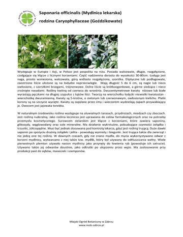 Saponaria officinalis (Mydlnica lekarska) rodzina Caryophyllaceae (Goździkowate) Występuje w Europie i Azji, w Polsce jest pospolita na niżu. Posiada walcowate, długie, rozgałęzione, czołgające się kłącze z licznymi korzeniami. Część nadziemna dorasta do wysokości 30-80cm. Łodyga jest naga, prosto wzniesiona, walcowata, górą widlasto rozgałęziona, szorstka. Eliptyczne lub podługowate, zaostrzone liście ułożone są na łodydze naprzeciwlegle. Mają długość 5 do 6 cm, są nagie lub nieco owłosione, z szorstkimi brzegami, trójnerwowe. Dolne liście są krótkoogonkowe, a górne siedzące i nieco zrośnięte nasadami. Rośliny kwitną od czerwca do września. Dwucentymetrowe kwiaty różowe lub białe wyrastają pęczkami na długiej szypułce z kątów liści. Tworzą na wierzchołku łodyżki niewielki kwiatostan wierzchotkę dwuramienną. Kwiaty są 5-krotne, o zielonym lub czerwonawym, owłosionym kielichu. Płatki korony są na szczycie wycięte. Kwiaty są zapylane przez ćmy i wieczorem wydzielają zapach przywabiający je. Owocem jest jajowata torebka. W naturalnym środowisku roślina występuje na aluwialnych tarasach, przydrożach, miedzach czy zboczach. Jest rośliną ruderalną. Jako roślina lecznicza jest uprawiana do celów farmakologicznych oraz na potrzeby przemysłu kosmetycznego. Surowcem zielarskim jest kłącze z korzeniami, które zawiera saponiny, glikozydy, węglowodany oraz sole mineralne. Ma działanie wykrztuśne, pobudzające czynności żołądka i trzustki, żółciopędne. Musi być jednak stosowana pod kontrolą lekarza, gdyż jest rośliną trującą. Duże dawki saponin po spożyciu drażnią żołądek i jelita - powodują wymioty i biegunki. Jest trująca także dla zwierząt i nie jedzą one tej rośliny. W dawnych czasach, gdy nie znano mydła, do mycia wykorzystywano odwar z korzeni mydlnicy, wytwarzano z niej także tzw. mydlik, który był używany do odtłuszczania wełny. Wiele pierwotnych plemion używało nasion mydlnicy jako przynęty do łowienia ryb (powoduje ich zatrucie). Używano także jej odwarów doustnie, jako odtrutki po ukąszeniu przez węże. Ma zastosowanie przy produkcji past do zębów, maseczek i szamponów. Miejski Ogród Botaniczny w Zabrzu www.mob-zabrze.pl