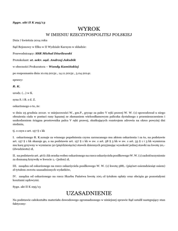 Sygn. akt II K 295/13 WYROK W IMIENIU RZECZYPOSPOLITEJ POLSKIEJ Dnia 7 kwietnia 2014 roku Sąd Rejonowy w Ełku w II Wydziale Karnym w składzie: Przewodniczący: SSR Michał Dźwilewski Protokolant: st. sekr. sąd. Andrzej Jakubik w obecności Prokuratora – Wandy Kamińskiej po rozpoznaniu dnia 10.09.2013r., 14.11.2013r., 3.04.2014r. sprawy: R. K. urodz. (...) w K. syna S. i B. z d. Z. oskarżonego o to, że: w dniu 25 grudnia 2012r. w miejscowości W., gm.P., gryząc za palec V ręki prawej W. W. (1) spowodował u niego obrażenia ciała w postaci rany kąsanej ze złamaniem wieloodłamowym paliczka dystalnego z przemieszczeniem i uszkodzeniem ścięgna prostownika palca V ręki prawej, skutkujących rozstrojem zdrowia na okres powyżej dni siedmiu, tj. o czyn z art. 157 § 1 kk I. oskarżonego R. K.uznaje za winnego popełnienia czynu zarzucanego mu aktem oskarżenia i za to, na podstawie art. 157 § 1 kk skazuje go, a na podstawie art. 157 § 1 kk w zw. z art. 58 § 3 kk w zw. z art. 33 § 1 i 3 kk wymierza mu karę grzywny w wymiarze 50 (pięćdziesięciu) stawek dziennych przyjmując wysokość jednej stawki na kwotę 20,(dwudziestu) zł, II. na podstawie art. 46 § 1 kk orzeka wobec oskarżonego na rzecz oskarżyciela posiłkowego W. W. (1) zadośćuczynienie za doznaną krzywdę w kwocie 1,- (jeden) zł, III. zasądza od oskarżonego na rzecz oskarżyciela posiłkowego W. W. (1) kwotę 588,- (pięćset osiemdziesiąt osiem) zł tytułem zwrotu uzasadnionych wydatków, IV. zasądza od oskarżonego na rzecz Skarbu Państwa kwotę 100,-zł tytułem opłaty oraz obciąża go pozostałymi kosztami sądowymi. Sygn. akt II K 295/13 UZASADNIENIE Na podstawie całokształtu materiału dowodowego zgromadzonego w niniejszej sprawie Sąd ustalił następujący stan faktyczny: w dniu 25 grudnia 2012r. R. K.wraz z partnerką A. B.uczestniczyli w przyjęciu w domu W. W. (1). Na miejscu byli również obecni K. B.- matka A. B.a partnerka W. W. (1) oraz pozostali członkowie rodziny W. W. (1), a w tym synowie P., K. i T. oraz córkiS. J.z mężem K. oraz jego bratem R., E. W. z mężem M.. M.in. R. K., W. W. (1), A. B. i K. J.spożywali alkohol w postaci wódki. Najwięcej alkoholu spożywał R. K.. W trakcie przyjęcia, w kuchni i w obecności W. W. (1), znajdujący się pod znacznym wpływem alkoholu R. K., zaczął używać wulgaryzmów w stosunku do K. B.. Został wówczas uderzony w twarz przez W. W. (1). W związku z powyższym R. K.z A. B.postanowili wrócić do domu. R. K., bez kurtki i butów wyszedł na zewnątrz, a za nim udała się A. B.. Po chwili za w/w wyszli W. W. (1) i K. J.. Na podwórku W. W. (1) zaproponował R. K.odwiezienie do domu. W tym momencie R. K.zamachnął się na W. W. (1), chcąc uderzyć go w twarz. W. W. (1) uchylił się i sam uderzył przeciwnika. Następnie doszło do szarpaniny między w/w i obaj upadli. W. W. (1) zdołał podnieść się na kolana. Wówczas R. K. chwycił go za rękę i ugryzł palec V prawej ręki powodując uszkodzenia w postaci rany kąsanej ze złamaniem wieloodłamowym paliczka dystalnego z przemieszczeniem i uszkodzeniem ścięgna prostownika skutkujące rozstrojem zdrowia na okres powyżej dni siedmiu. W. W. (1) zaczął uderzać R. K.w twarz i klatkę piersiową w celu uwolnienia palca, co ostatecznie nastąpiło. Powyższy stan faktyczny Sąd ustalił na podstawie następujących dowodów: - częściowo wyjaśnień R. K.– k. 105-106, 30-32, - zeznań świadków: częściowo W. W. (1) – k. 106-107, 1-3, częściowoK. J.– k. 135 oraz k. 32-33, 174-175 akt II K 226/13, częściowo K. B.– k. 107-108, 8-9, częściowo A. B.– k. 108-109, 20-21, częściowo K. W.– k. 109-110, 10-11, W. W. (2) – k. 126, częściowo P. W. – k. 126, 12-13, częściowo T. W.– k. 126, 15-16, częściowo E. W. – k. 127, 37-38 oraz k. 125-126 akt II K 226/13, częściowo S. J.– k. 127-128, 39-40, - zaświadczenia lekarskiego – k. 4, - opinii lekarskiej – k. 23, 125-126, 131, - dokumentacji lekarskiej – k. 117-122, oraz akt II K 226/13. Oskarżony R. K.nie przyznał się do popełnienia zarzucanego mu czynu i wyjaśnił, że wspólnie z A. i. K. B.zostali zaproszeni na uroczystość do pokrzywdzonego. Była tam cała rodzina W. w. (1). Wszyscy pili alkohol. Około 21.00 któryś z synów W. W. (1)lub jego zięć zaczął oskarżonego szarpać. Nie wie z jakiego powodu. Zdenerwował się i wyprosił wszystkich z kuchni. Tam doszło do szarpaniny. Na początku szarpał się tylko z tym jednym mężczyzną. Kiedy wyprosił wszystkich z kuchni, został tam tylko W. W. (1)i on. Doszło między nimi do sprzeczki i został dwukrotnie uderzony w twarz przez pokrzywdzonego. Oddał mu. Słyszał tłuczone szkło kiedy W. W. (1)uderzył ręką w stół. Na stole było tłuczone szkło i o nie pokrzywdzony rozciął sobie palec. Po chwili wpadli wszyscy z salonu. Próbowali ich rozdzielić. Była ogólna szamotanina. Wtedy oskarżony wyszarpnął się i w kapciach lub boso wybiegł na dwór. Dostał jeszcze w przedpokoju w tył głowy, nie wie od kogo. A. B.wybiegła za nim. Później został jeszcze uderzony parę razy i padł. Uderzał go W. W. (1)i wydaje mu się, że był tam też jego syn. Był kopany i bity i stracił świadomość. Kiedy się ocknął była przy nim jego dziewczyna. W. W. (1)podjechał samochodem z włączonymi światłami. Przed nimi utknął w zaspie. Wybiegł z samochodu i znowu bił oskarżonego po twarzy pięścią. Oskarżonemu leciała krew z nosa od uderzeń zadanych w kuchni. Dalej nie pamięta. Musiał znowu tracić świadomość. R. K. dodał, że nie ugryzł pokrzywdzonego w palec. Nie był w stanie tego zrobić, ponieważ leżał pobity na śniegu. Sąd dał wiarę oskarżonemu jedynie częściowo, tj. w zakresie w jakim wskazuje na pobyt w domu pokrzywdzonego, podaje tożsamość osób biorących udział w przyjęciu, wskazuje na incydent w kuchni z udziałem pokrzywdzonego oraz incydent następczy na podwó