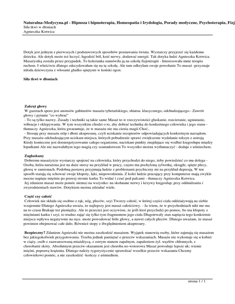Naturalna-Medycyna.pl - Hipnoza i hipnoterapia, Homeopatia i Irydologia, Porady medyczne, Psychoterapia, Fizj Siła tkwi w dłoniach Agnieszka Kotwica Dotyk jest jednym z pierwszych i podstawowych sposobów poznawania świata. Wystarczy przyjrzeć się każdemu dziecku. Ale dotyk może też leczyć, łagodzić ból, koić nerwy, dodawać energii. Tak dotyka ludzi Agnieszka Kotwica. Masażystką została przez przypadek. To koleżanka namówiła ją na szkolę fizjoterapii - Interesowała mnie terapia ruchem. I właściwie dlatego zdecydowałam się na tę szkołę. Ale tam odkryłam swoje powołanie To masaż -przyznaje młoda dziewczyna z włosami gładko spiętymi w koński ogon. Siła tkwi w dłoniach Zakręt głowy W gazetach sporo jest anonsów gabinetów masażu tybetańskiego, shiatsu. klasycznego, odchudzającego.- Zawrót głowy i pytanie "co wybrać" - To są tylko nazwy. Zasady i techniki są takie same Masaż to w rzeczywistości głaskanie, rozcieranie, ugniatanie, wibracje i oklepywanie. W tym wszystkim cliodzi o to, aby dobrać technikę do konkretnego człowieka i jego stanu tłumaczy Agnieszka, która gwarantuje, że w masażu nie ma cienia magii Choć.. - Stosuję przy masażu stóp i dłoni akupresurę, czyli uciskanie receptorów odpowiadających konkretnym narządom. Przy masażu odchudzającym uciskam miejsca, których pobudzenie sprawi zwiększone wydalanie toksyn z ustroją Kiedy konieczne jest doenergetyzowanie całego organizmu, naciskam punkty znajdujące się wzdłuż kręgosłupa między łopatkami Ale nie nazwałabym tego magią czy szamaństwem To wszystko można wytłumaczyć - dodaje z uśmiechem. Zagłaskany Dobremu masażyście wystarczy spojrzeć na człowieka, który przychodzi do niego, żeby powiedzieć co mu dolega Osoba, która narażona jest na duże stresy na przykład w pracy, często ma pochyloną sylwetkę, okrągłe, spięte plecy, głowę w ramionach. Podobną postawę przyjmują ludzie z problemami psychiczny mi na przykład depresją. W ten sposób starają się schować swoje kłopoty, lęki, niepowodzenia. Z kolei ludzie pracujący przy komputerze mają zwykle mocno napięte mięśnie po prawej stronie karku To widać i czuć pod palcami - tłumaczy Agnieszka Kotwica. Jej zdaniem masaż może pomóc niema) na wszystko: na skołatane nerwy i krzywy kręgosłup, przy odduidzaniu i zwyrodnieniach stawów. Dotykiem można zdziałać wiele. Część czy całość Człowiek nie składa się osobno z rąk, nóg, pleców, szyi Tworzy całość, w której części ciała oddziaiywują na siebie wzajemnie Dlatego Agnieszka uważa, że najlepszy jest masaż całościowy. - Ja wiem, że w przychodniach nikt me ma na to czasu Brakuje też pieniędzy. Ale to przecież jest oczywiste, że jeśli ktoś przyclndzi po pomoc, bo ma kłopoty z mięśniami karku i szyi, to trudno zająć się tylko tym fragmentem jego ciała Długotrwały stan napięcia tego konkretnie miejsca wpływa negatywnie na ręce. może powodować bóle głowy, a nawet całych pleców. Dlatego uważam, że masaż powinien obejmować całe dało. Również stopy z iłwględnieniem akupresury. Bezpieczny? Zdaniem Agnieszki nie można zaszkodzić masażem. Wyjątek stanowią osoby, które zajmują się masażem bez jakiegokolwiek przygotowania. Trzeba jednak pamiętać o przeciw wskazaniach. Masażu nie wykonuje się u kobiet w ciąży, osób z zaawansowaną miażdżycą, z ostrym stanem zapalnym, zapaleniem żył. węzłów chłonnych, z chorobami skóry. Absolutnym przeciw-skazamem jest choroba no-wotorowa Masaż powoduje lepsze uk; wienie mięśni, poprawę krążenia. Dlatego należy rygorystycznie sprawdzać wszelkie przeciw wskazania Chcemy człowiekowi pomóc, a nie zaszkodzić -kończy z uśmiediem. strona 1 / 1