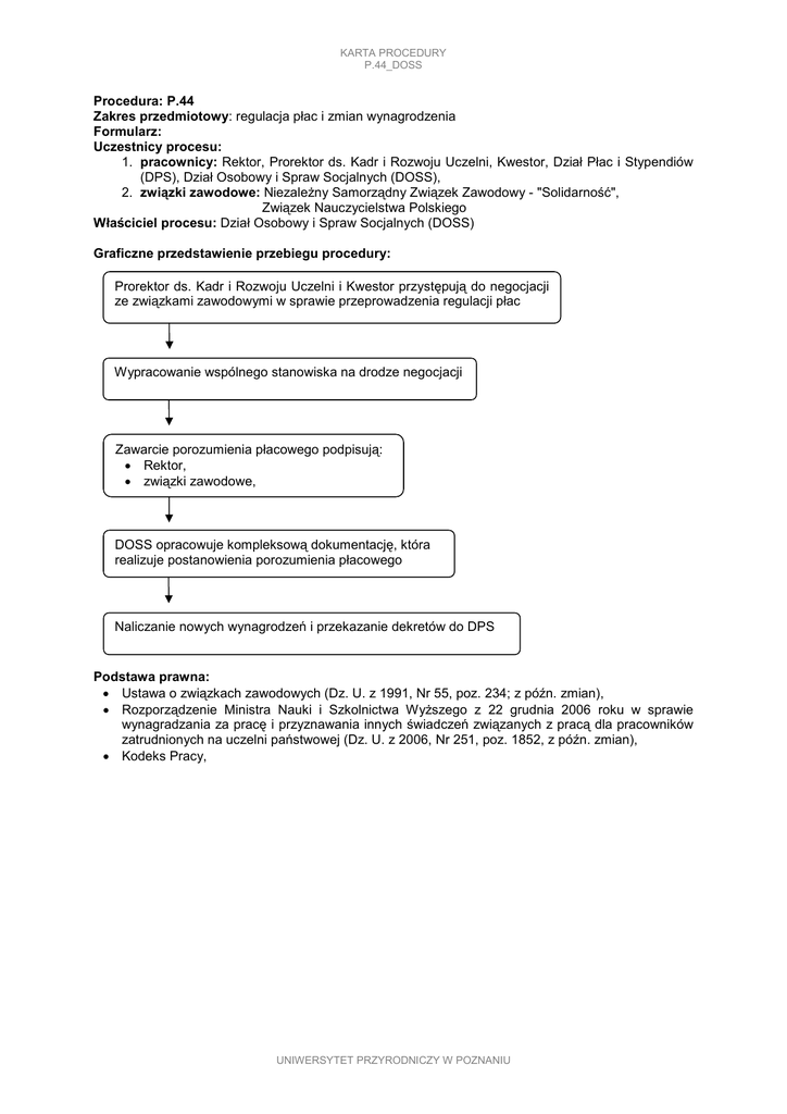 KARTA PROCEDURY P.44_DOSS Procedura: P.44 Zakres przedmiotowy: regulacja płac i zmian wynagrodzenia Formularz: Uczestnicy procesu: 1. pracownicy: Rektor, Prorektor ds. Kadr i Rozwoju Uczelni, Kwestor, Dział Płac i Stypendiów (DPS), Dział Osobowy i Spraw Socjalnych (DOSS), 2. związki zawodowe: NiezaleŜny Samorządny Związek Zawodowy - "Solidarność", Związek Nauczycielstwa Polskiego Właściciel procesu: Dział Osobowy i Spraw Socjalnych (DOSS) Graficzne przedstawienie przebiegu procedury: Prorektor ds. Kadr i Rozwoju Uczelni i Kwestor przystępują do negocjacji ze związkami zawodowymi w sprawie przeprowadzenia regulacji płac Wypracowanie wspólnego stanowiska na drodze negocjacji Zawarcie porozumienia płacowego podpisują: • Rektor, • związki zawodowe, DOSS opracowuje kompleksową dokumentację, która realizuje postanowienia porozumienia płacowego Naliczanie nowych wynagrodzeń i przekazanie dekretów do DPS Podstawa prawna: • Ustawa o związkach zawodowych (Dz. U. z 1991, Nr 55, poz. 234; z późn. zmian), • Rozporządzenie Ministra Nauki i Szkolnictwa WyŜszego z 22 grudnia 2006 roku w sprawie wynagradzania za pracę i przyznawania innych świadczeń związanych z pracą dla pracowników zatrudnionych na uczelni państwowej (Dz. U. z 2006, Nr 251, poz. 1852, z późn. zmian), • Kodeks Pracy, UNIWERSYTET PRZYRODNICZY W POZNANIU