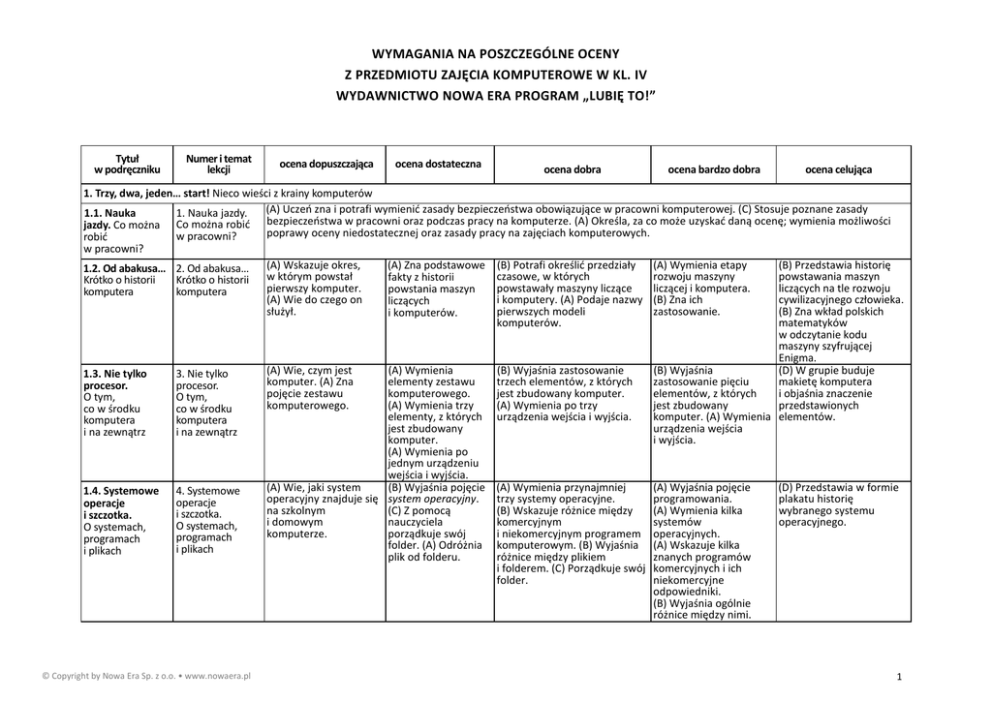 WYMAGANIA NA POSZCZEGÓLNE OCENY Z PRZEDMIOTU ZAJĘCIA KOMPUTEROWE W KL. IV WYDAWNICTWO NOWA ERA PROGRAM „LUBIĘ TO!” Tytuł w podręczniku Numer i temat lekcji ocena dopuszczająca ocena dostateczna ocena dobra ocena bardzo dobra ocena celująca 1. Trzy, dwa, jeden… start! Nieco wieści z krainy komputerów (A) Uczeń zna i potrafi wymienić zasady bezpieczeństwa obowiązujące w pracowni komputerowej. (C) Stosuje poznane zasady 1. Nauka jazdy. 1.1. Nauka jazdy. Co można Co można robić bezpieczeństwa w pracowni oraz podczas pracy na komputerze. (A) Określa, za co może uzyskać daną ocenę; wymienia możliwości poprawy oceny niedostatecznej oraz zasady pracy na zajęciach komputerowych. w pracowni? robić w pracowni? (A) Wskazuje okres, (A) Wymienia etapy (B) Przedstawia historię (A) Zna podstawowe (B) Potrafi określić przedziały 1.2. Od abakusa… 2. Od abakusa… w którym powstał czasowe, w których rozwoju maszyny powstawania maszyn fakty z historii Krótko o historii Krótko o historii pierwszy komputer. powstawały maszyny liczące liczącej i komputera. liczących na tle rozwoju powstania maszyn komputera komputera (A) Wie do czego on i komputery. (A) Podaje nazwy (B) Zna ich cywilizacyjnego człowieka. liczących służył. pierwszych modeli zastosowanie. (B) Zna wkład polskich i komputerów. komputerów. matematyków w odczytanie kodu maszyny szyfrującej Enigma. (A) Wie, czym jest (A) Wymienia (B) Wyjaśnia zastosowanie (B) Wyjaśnia (D) W grupie buduje 1.3. Nie tylko 3. Nie tylko komputer. (A) Zna elementy zestawu trzech elementów, z których zastosowanie pięciu makietę komputera procesor. procesor. pojęcie zestawu komputerowego. jest zbudowany komputer. elementów, z których i objaśnia znaczenie O tym, O tym, komputerowego. (A) Wymienia trzy (A) Wymienia po trzy jest zbudowany przedstawionych co w środku co w środku elementy, z których urządzenia wejścia i wyjścia. komputer. (A) Wymienia elementów. komputera komputera jest zbudowany urządzenia wejścia i na zewnątrz i na zewnątrz komputer. i wyjścia. (A) Wymienia po jednym urządzeniu wejścia i wyjścia. (A) Wie, jaki system (B) Wyjaśnia pojęcie (A) Wymienia przynajmniej (A) Wyjaśnia pojęcie (D) Przedstawia w formie 1.4. Systemowe 4. Systemowe operacyjny znajduje się system operacyjny. trzy systemy operacyjne. programowania. plakatu historię operacje operacje na szkolnym (C) Z pomocą (B) Wskazuje różnice między (A) Wymienia kilka wybranego systemu i szczotka. i szczotka. i domowym nauczyciela komercyjnym systemów operacyjnego. O systemach, O systemach, komputerze. porządkuje swój i niekomercyjnym programem operacyjnych. programach programach folder. (A) Odróżnia komputerowym. (B) Wyjaśnia (A) Wskazuje kilka i plikach i plikach plik od folderu. różnice między plikiem znanych programów i folderem. (C) Porządkuje swój komercyjnych i ich folder. niekomercyjne odpowiedniki. (B) Wyjaśnia ogólnie różnice między nimi. © Copyright by Nowa Era Sp. z o.o. • www.nowaera.pl 1 Tytuł w podręczniku Numer i temat lekcji ocena dopuszczająca ocena dostateczna 2. Malowanie na ekranie. Nie tylko proste rysunki w MS Paint 6.1 (C) Korzysta z Pędzli (C) Korzysta 5. i 6. Możesz 2.1. Możesz i Kolorów w programie z narzędzi programu jeszcze więcej. jeszcze więcej. Paint. (C) Tworzy Funkcje edytora Paint. Funkcje edytora rysunek wiejskiego grafiki MS Paint domku grafiki MS Paint 6.1 z wykorzystaniem 6.1 podstawowych narzędzi programu. (C) Z pomocą (C) Z niewielką 7. i 8. Płatek 2.2. Płatek nauczyciela wykonuje pomocą nauczyciela śniegu. Wklejanie śniegu. niedokładny rysunek wykonuje i obracanie Wklejanie gwiazdki śniegu, niedokładny rysunek elementów korzystając z metody gwiazdki śniegu. i obracanie odbicia i obrotu elementów fragmentu obrazu. 2.3. Wiatr w żagle. Zwielokrotnianie obiektów ocena dobra ocena bardzo dobra (C) Korzysta z narzędzi programu Paint, efektywnie operuje różnymi typami Pędzli i Wypełnień. (C) Tworzy rysunek wiejskiego domku z wykorzystaniem tych narzędzi. (C) Korzysta z funkcji zaawansowanych, przenoszenia i kopiowania elementów podczas tworzenia rysunku wiejskiego domku. (C) Praca jest staranna i dokładna. (C) Samodzielnie wykonuje rysunek gwiazdki śniegu. Praca jest staranna i dokładna. (C) Samodzielnie wykonuje niedokładny rysunek gwiazdki śniegu. 9. Wiatr w żagle. Rysowanie sylwetki statku widzianego z przodu (C) Z pomocą nauczyciela rysuje bardzo prosty rysunek statku bez wykorzystania Krzywej. (C) Tworzy prosty rysunek statku z wykorzystaniem nielicznych Krzywych. (C) Tworzy rysunek statku z wielokrotnym wykorzystaniem Krzywej. (C) Tworzy rysunek statku ze szczególną starannością i dbałością o drobne szczegóły. 10. Wiatr w żagle. Rysowanie sylwetki statku widzianego z boku (C) Z pomocą nauczyciela rysuje bardzo prosty rysunek statku bez wykorzystania Krzywej. (C) Tworzy prosty rysunek statku z wykorzystaniem nielicznych Krzywych. (C) Tworzy rysunek statku z wielokrotnym wykorzystaniem Krzywej. (C) Tworzy rysunek statku ze szczególną starannością i dbałością o szczegóły. © Copyright by Nowa Era Sp. z o.o. • www.nowaera.pl ocena celująca (D) Tworzy ilustrację do przeczytanej ostatnio lektury, stosując co najmniej kilka narzędzi programu Paint oraz różnych ich opcji. (C) Samodzielnie wykonuje rysunek gwiazdki śniegu. Praca jest szczególnie staranna i dokładna. Bardzo precyzyjnie są narysowane małe elementy. Praca odwzorowuje rzeczywisty wygląd płatka śniegu. (D) Tworzy prezentację na temat wody i jej stanów skupienia. (D) Przygotowuje prezentację poświęconą okrętom z okresu XV–XVIII wieku. (C) Używając dostępnych narzędzi programu Paint, rysuje sylwetkę statku widzianego z boku. Wykazuje się przy tym szczególną starannością i kreatywnością. 2 Tytuł w podręczniku Numer i temat lekcji 2.4. W poszukiwaniu nowych lądów. Praca w dwóch oknach 11. i 12. W poszukiw