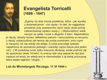 Evangelista Torricelli (1608 - 1647) „Żyjemy na dnie morza powietrza, które - jak wynika z doświadczenia - ma ciężar i to taki, że najgęstsze powietrze przy powierzchni ziemi waży około jednej czterechsetnej ciężaru wody [...] Wykonaliśmy wiele naczyń ze szkła i rurek o długości 2 łokci. Napełniliśmy je rtęcią, otwarty koniec zatkaliśmy palcem i zanurzyliśmy w naczyniu z rtęcią; zobaczyliśmy jak tworzy się pusta przestrzeń, przy czym w naczyniu nic się wtedy nie dzieje, a rurka pozostaje zawsze napełniona do wysokości jednego i czwartej części łokcia plus jeden cal [...] W podobnej rurce, tylko znacznie dłuższej, woda podnosi się do wysokości około 18 łokci, to znaczy tyle razy więcej ile rtęć jest cięższa od wody, bo wtedy jest w równowadze z tą samą przyczyną, która działa najedno i drugie...” List do Michelangelo Ricciego, 11 VI 1644 r. Otto Guericke (1602 - 1686) Pierwsza pompa Guerickego „...wydało mi się, że dla moich celów bardziej odpowiednia będzie kula miedziana. Pojemność tej kuli A wynosiła od 60 do 70 kwart magdeburskich i została ona opatrzona u góry kurkiem mosiężnym B, na dole zaś była szczelnie połączona z pompą. Następnie przystąpiłem, jak poprzednio, do wyciągania wody i powietrza. Początkowo tłok dawał się poruszać łatwo, ale wkrótce stało się to trudniejsze, tak że dwaj silni mężczyźni prawie nie mogli go wyciągnąć. Kiedy byli oni zajęci poruszaniem tłoka tam i z powrotem i już myśleli, że usunięte zostało całe powietrze, kula metalowa została nagle zgnieciona z wielkim hukiem ku ogólnemu przerażeniu, tak jak się zgniata w palcach materiał, albo jakby kula została zrzucona z wierzchołka wieży z gwałtownym łoskotem. Uważam, że przyczyną tego była niewprawność rzemieślników, którzy przypuszczalnie nie wykonali kuli dokładnie okrągłej...” Druga pompa Guerickego Eksperymenty Guerickego Doświadczenie, które wykazuje, że wskutek ciśnienia powietrza dwie półkule zostają tak mocno połączone, że nie można ich od siebie oddzielić siłą 16 koni „Poleciłem wykonać dwie miedziane półkule, czyli miski o średnicy około 3/4, a dokładniej 67/100 łokcia magdeburskiego. Były one szczelnie dopasowane do siebie i jedna z nich miała kurek, czy raczej klapę, z pomocą której można było wyciągać znajdujące się wewnątrz powietrze i która zamykała dostęp powietrzu z zewnątrz... Oprócz tego półkule są opatrzone żelaznymi kółkami, aby mogły być do nich zaprzęgnięte konie, jak widać na rysunku. Poza tym poleciłem uszyć ze skóry pierścień, bardzo dobrze nasycony woskiem z terpentyną, aby zupełnie nie przepuszczał powietrza. Półkule te połączyłem, przedzielając pierścieniem; następnie szybko zostało z nich wypompowane powietrze. Przekonałem się z jaką siłą są połączone półkule, między którymi znajdował się ów pierścień. Ściśnięte przez ciśnienie otaczającego powietrza były one złączone tak mocno, że 16 koni albo nie mogło ich wcale rozerwać, albo z wielkim tylko trudem. Kiedy ostatecznie wielkim wysiłkiem udało się je rozerwać, powodowało to huk podobny do wystrzału z armaty...” Otto von Guericke, Experimenta nova (1672) Publiczny pokaz „półkul magdeburskich” Regensburg 1654 Robert Boyle (1627 - 1691) Pierwsza pompa Boyle’a Druga pompa Boyle’a Sprawdzanie twierdzenia Galileusza, że wszystkie ciała w próżni spadają z jednakowym przyspieszeniem Wyniki pomiarów Boyle’a (1662) V Pobs Pcalc V Pobs Pcalc 12 292/16 292/16 53/4 615/16 6018/23 111/2 309/16 306/16 51/2 641/16 633/16 11 3115/16 3112/16 51/4 671/16 664/7 101/2 338/16 331/7 5 7011/16 70 10 355/16 35 43/4 742/16 7311/19 91/2 37 3615/19 41/2 7714/16 772/3 9 395/16 387/8 41/4 8212/16 824/17 81/2 4110/16 412/17 4 8714/16 873/8 8 443/16 4311/16 33/4 931/16 931/5 71/2 471/16 463/5 31/2 1007/16 996/7 7 505/16 50 31/4 10713/16 1077/13 61/2 545/16 5310/16 3 1179/16 1164/8 6 5813/16 582/8 Wyniki Boyle’a (1662) pV V (jednostki umowne) Pomiary ciśnienia i objętości powietrza w laboratorium Boyle’a wykonywali Henry Power i Richard Towneley oraz Robert Hooke, który był asystentem Boyle’a. W Paryżu niezależnie od Boyle’a, ale trochę później, związek objętości i ciśnienia powietrza znalazł eksperymentalnie Edme Mariotte. Początki termometrii Pierwsze termoskopy powietrzne (termometry) Galileo Galilei 1603 ? (1592 ?) Santorio Santori 1611 Cornelius Drebbel > 1606 (1586 ?) Robert Fludd 1617 ? Jean Rey (1631) pierwszy termometr cieczowy Punkty stałe Boyle zamarzanie olejku anyżowego Huygens zamarzanie (lub wrzenie) wody Hooke zamarzanie wody 1688 Dalencé topnienie śniegu (-10o) i topnienie masła (10o) 1694 Renaldini zamarzanie i wrzenie wody (przedział 12o) 1665 Ciepło i zimno traktowano przez długi czas jako odrębne jakości, tzn. zimno nie było postrzegane jako mała ilość ciepła. Przykład: Jean Baptiste Morin (1583 - 1656) uważał, że ciepło i zimno mają pewien maksymalny stopień, którego nie mogą przekroczyć, a także pewien stopień minimalny, poniżej którego nie mogą się obniżyć. Przyjął arbitralne założenie: stopień ciepła + stopień zimna = 8 Temperatura mieszanin Termometry pozwalały mierzyć „ciepło” (temperatura od łacińskiego temperatura mieszanina) W stanie równowagi „ciepło”, jak sądzono (np. Boerhaave, Musschenbroek), jest po prostu proporcjonalne do objętości albo proporcjonalne do masy, ale z doświadczeń wynikało, iż jest to niezgodne ze wzorami termometrycznymi na temperaturę mieszanin. Porównanie niektórych skal termometrycznych Deluc 1772 Sweden 1745 Celsius 1742 Delisle 1733 Reaumur 1730 Fahrenheit 1717 Amontons 1702 Roemer 1702 Newton 1701 34 60 73 212 80 0 0 100 12,5 22,5 59,2 96 30,8 96,5 64,3 35,5 28,5 0 7,5 51,5 32 0 150 100 0 0 46 0 117 - 18 0 - 5,5 - 14,2 176,2 Wrzenie wody Ciało ludzkie Topnienie lodu Początk