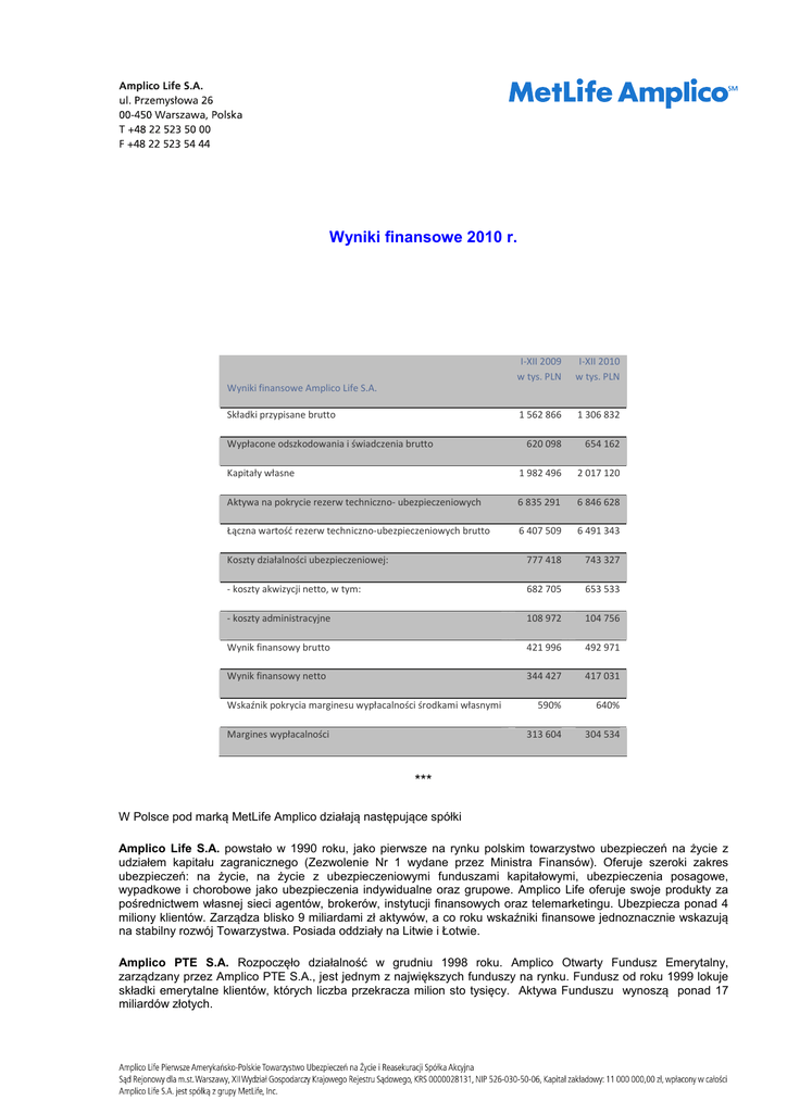 Wyniki finansowe 2010 r. I-XII 2009 w tys. PLN I-XII 2010 w tys. PLN 1 562 866 1 306 832 620 098 654 162 Kapitały własne 1 982 496 2 017 120 Aktywa na pokrycie rezerw techniczno- ubezpieczeniowych 6 835 291 6 846 628 Łączna wartość rezerw techniczno-ubezpieczeniowych brutto 6 407 509 6 491 343 Koszty działalności ubezpieczeniowej: 777 418 743 327 - koszty akwizycji netto, w tym: 682 705 653 533 - koszty administracyjne 108 972 104 756 Wynik finansowy brutto 421 996 492 971 Wynik finansowy netto 344 427 417 031 590% 640% 313 604 304 534 Wyniki finansowe Amplico Life S.A. Składki przypisane brutto Wypłacone odszkodowania i świadczenia brutto Wskaźnik pokrycia marginesu wypłacalności środkami własnymi Margines wypłacalności *** W Polsce pod marką MetLife Amplico działają następujące spółki Amplico Life S.A. powstało w 1990 roku, jako pierwsze na rynku polskim towarzystwo ubezpieczeń na życie z udziałem kapitału zagranicznego (Zezwolenie Nr 1 wydane przez Ministra Finansów). Oferuje szeroki zakres ubezpieczeń: na życie, na życie z ubezpieczeniowymi funduszami kapitałowymi, ubezpieczenia posagowe, wypadkowe i chorobowe jako ubezpieczenia indywidualne oraz grupowe. Amplico Life oferuje swoje produkty za pośrednictwem własnej sieci agentów, brokerów, instytucji finansowych oraz telemarketingu. Ubezpiecza ponad 4 miliony klientów. Zarządza blisko 9 miliardami zł aktywów, a co roku wskaźniki finansowe jednoznacznie wskazują na stabilny rozwój Towarzystwa. Posiada oddziały na Litwie i Łotwie. Amplico PTE S.A. Rozpoczęło działalność w grudniu 1998 roku. Amplico Otwarty Fundusz Emerytalny, zarządzany przez Amplico PTE S.A., jest jednym z największych funduszy na rynku. Fundusz od roku 1999 lokuje składki emerytalne klientów, których liczba przekracza milion sto tysięcy. Aktywa Funduszu wynoszą ponad 17 miliardów złotych. Amplico TFI S.A. działa od czerwca 2004 roku. Amplico TFI oferuje 19 strategii o zróżnicowanym ryzyku i zasięgu geograficznym. Obsługuje 35 000 klientów. Zarządza aktywami ponad 1,6 miliarda złotych. MetLife Towarzystwo Ubezpieczeń na Życie S.A. jest jednym z pierwszych towarzystw ubezpieczeniowych w Polsce działającym we współpracy z instytucjami bankowymi. Oferuje ubezpieczenia kredytobiorców i posiadaczy kart kredytowych, oszczędnościowe ubezpieczenia na życie, ubezpieczenia posagowe oraz terminowe ubezpieczenia zdrowia i życia. Ubezpieczenia te są dostępne poprzez partnerów z sektora bankowego oraz kanały sprzedaży bezpośredniej. Towarzystwo ubezpiecza ponad 400 tysięcy klientów i zarządza aktywami w wysokości 0,5 miliarda zł. Polskie spółki MetLife Amplico należą do grupy MetLife, Inc. Istniejące od ponad 140 lat MetLife, Inc. jest wiodącą światową firmą oferującą ubezpieczenia i usługi finansowe w obu Amerykach, Japonii, Azji Wschodniej, Europie i na Bliskim Wschodzie. Poprzez swoje spółki zależne i stowarzyszone MetLife Inc. obsługuje 90 milionów Klientów w ponad 60 krajach i jest największą firmą ubezpieczeń 1 2 na życie w Stanach Zjednoczonych i Meksyku . Obsługuje ponad 90 ze 100 największych firm oraz 70 procent 3 wszystkich firm z rankingu FORTUNE 500® . Spółki grupy MetLife oferują ubezpieczenia na życie, rentowe, majątkowe, produkty bankowości detalicznej oraz inne usługi finansowe dla klientów indywidualnych, a także grupowe produkty emerytalne i oszczędnościowe dla korporacji i instytucji. 1 1. miejsce wśród ubezpieczycieli na życie w USA (grupowe + indywidualne – według polis w mocy) – LIMRA, czerwiec 2010 2 Estadisticas AMIS, czerwiec 2010 3 FORTUNE 500®, maj 2010. FORTUNE 500® jest zarejestrowanym znakiem handlowym FORTUNE magazine, spółką Time, Inc. W celu uzyskania dodatkowych informacji, zapraszamy na stronę www.metlifeamplico.pl oraz www.metlife.com