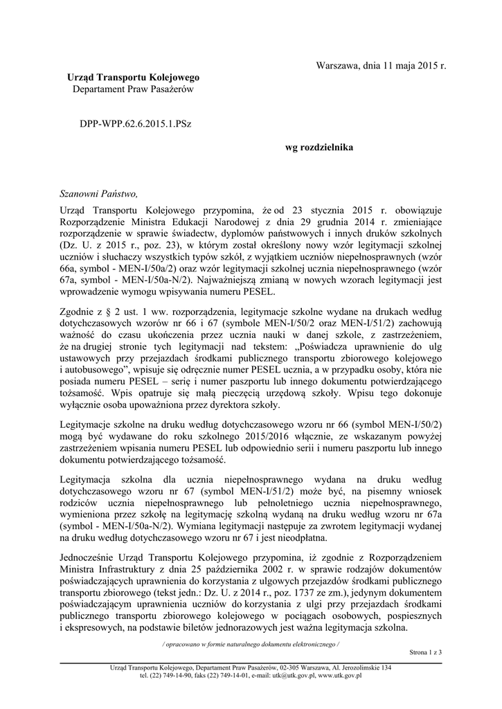 Warszawa, dnia 11 maja 2015 r. Urząd Transportu Kolejowego Departament Praw Pasażerów DPP-WPP.62.6.2015.1.PSz wg rozdzielnika Szanowni Państwo, Urząd Transportu Kolejowego przypomina, że od 23 stycznia 2015 r. obowiązuje Rozporządzenie Ministra Edukacji Narodowej z dnia 29 grudnia 2014 r. zmieniające rozporządzenie w sprawie świadectw, dyplomów państwowych i innych druków szkolnych (Dz. U. z 2015 r., poz. 23), w którym został określony nowy wzór legitymacji szkolnej uczniów i słuchaczy wszystkich typów szkół, z wyjątkiem uczniów niepełnosprawnych (wzór 66a, symbol - MEN-I/50a/2) oraz wzór legitymacji szkolnej ucznia niepełnosprawnego (wzór 67a, symbol - MEN-I/50a-N/2). Najważniejszą zmianą w nowych wzorach legitymacji jest wprowadzenie wymogu wpisywania numeru PESEL. Zgodnie z § 2 ust. 1 ww. rozporządzenia, legitymacje szkolne wydane na drukach według dotychczasowych wzorów nr 66 i 67 (symbole MEN-I/50/2 oraz MEN-I/51/2) zachowują ważność do czasu ukończenia przez ucznia nauki w danej szkole, z zastrzeżeniem, że na drugiej stronie tych legitymacji nad tekstem: „Poświadcza uprawnienie do ulg ustawowych przy przejazdach środkami publicznego transportu zbiorowego kolejowego i autobusowego”, wpisuje się odręcznie numer PESEL ucznia, a w przypadku osoby, która nie posiada numeru PESEL – serię i numer paszportu lub innego dokumentu potwierdzającego tożsamość. Wpis opatruje się małą pieczęcią urzędową szkoły. Wpisu tego dokonuje wyłącznie osoba upoważniona przez dyrektora szkoły. Legitymacje szkolne na druku według dotychczasowego wzoru nr 66 (symbol MEN-I/50/2) mogą być wydawane do roku szkolnego 2015/2016 włącznie, ze wskazanym powyżej zastrzeżeniem wpisania numeru PESEL lub odpowiednio serii i numeru paszportu lub innego dokumentu potwierdzającego tożsamość. Legitymacja szkolna dla ucznia niepełnosprawnego wydana na druku według dotychczasowego wzoru nr 67 (symbol MEN-I/51/2) może być, na pisemny wniosek rodziców ucznia niepełnosprawnego lub pełnoletniego ucznia niepełnosprawnego, wymieniona przez szkołę na legitymację szkolną wydaną na druku według wzoru nr 67a (symbol - MEN-I/50a-N/2). Wymiana legitymacji następuje za zwrotem legitymacji wydanej na druku według dotychczasowego wzoru nr 67 i jest nieodpłatna. Jednocześnie Urząd Transportu Kolejowego przypomina, iż zgodnie z Rozporządzeniem Ministra Infrastruktury z dnia 25 października 2002 r. w sprawie rodzajów dokumentów poświadczających uprawnienia do korzystania z ulgowych przejazdów środkami publicznego transportu zbiorowego (tekst jedn.: Dz. U. z 2014 r., poz. 1737 ze zm.), jedynym dokumentem poświadczającym uprawnienia uczniów do korzystania z ulgi przy przejazdach środkami publicznego transportu zbiorowego kolejowego w pociągach osobowych, pospiesznych i ekspresowych, na podstawie biletów jednorazowych jest ważna legitymacja szkolna. / opracowano w formie naturalnego dokumentu elektronicznego / Strona 1 z 3 Urząd Transportu Kolejowego, Departament Praw Pasażerów, 02-305 Warszawa, Al. Jerozolimskie 134 tel. (22) 749-14-90, faks (22) 749-14-01, e-mail: [email protected], www.utk.gov.pl W świetle obowiązujących przepisów, legitymacje szkolne wydane na drukach MEN-I/50/2 oraz MEN-I/51/2, bez wpisanego numeru PESEL, traktowane są jako nieważne i nie poświadczają uprawnień do ulgowych przejazdów. W przypadku okazania, w czasie kontroli dokumentów przewozu osób lub bagażu, legitymacji poświadczającej uprawnienia ucznia do ulgowego przejazdu bez wpisanego numeru PESEL, uczeń ten traktowany jest jako osoba nieposiadająca prawa do ulgowego przejazdu. Zgodnie z art. 33a ust. 4 ustawy z 15 listopada 1984 r. Prawo przewozowe (tekst jedn.: Dz. U. z 2000 r., Nr 50, poz. 601 ze zm.) w razie stwierdzenia braku ważnego dokumentu poświadczającego uprawnienie do bezpłatnego albo ulgowego przejazdu przewoźnik lub organizator publicznego transportu zbiorowego albo osoba przez niego upoważniona pobiera właściwą należność za przewóz i opłatę dodatkową albo wystawia wezwanie do zapłaty. Pobrana należność za przewóz i opłata dodatkowa, po uiszczeniu opłaty manipulacyjnej odpowiadającej kosztom poniesionym przez przewoźnika lub organizatora publicznego transportu zbiorowego, podlega zwrotowi, a w przypadku wezwania do zapłaty - umorzeniu, w przypadku udokumentowania przez podróżnego, nie później niż w terminie 7 dni od dnia przewozu, uprawnień do bezpłatnego lub ulgowego przejazdu. Wyjątkiem są legitymacje szkolne wydane na drukach MENiS-II/180/2 oraz MENiS-II/182/2, które zgodnie z § 36 ust. 1 i 2 Rozporządzenia Ministra Edukacji Narodowej z dnia 28 maja 2010 r. w sprawie świadectw, dyplomów państwowych i innych druków szkolnych (tekst jedn.: Dz. U. z 2010 r. Nr 97, poz. 624.) mogły być wydawane do roku szkolnego 2010/2011 i zachowują ważność (bez konieczności wpisania nr PESEL) do czasu ukończenia przez ucznia nauki w danej szkole, tj. najpóźniej do 30 września 2016 r. Będę zobowiązany za przekazanie ww. informacji wszystkim placówkom edukacyjnym objętym nadzorem pedagogicznym Kuratorium, których informacje te mogą dotyczyć. Z poważaniem PRZEMYSŁAW SKUBISZ DYREKTOR DEPARTAMENTU PRAW PASAŻERÓW / opracowano w formie naturalnego dokumentu elektronicznego / Strona 2 z 3 Urząd Transportu Kolejowego, Departament Praw Pasażerów, 02-305 Warszawa, Al. Jerozolimskie 134 tel. (22) 749-14-90, faks (22) 749-14-01, e-mail: [email protected], www.utk.gov.pl Otrzymują: 1. Pani Beata Pawłowicz - Dolnośląski Kurator Oświaty Pl. Powstańców Warszawy 1, 50-153 Wrocław 2. Pani Anna Łukaszewska - Kujawsko-Pomorski Kurator Oświaty ul. Konarskiego 1/3, 85-066 Bydgoszcz 3. Pan Krzysztof Babisz - Lubelski Kurator Oświaty ul. 3-go Maja 6, 20-950 Lublin 4. Pani Bogna Ferensztajn - Lubuski Kurator Oświaty ul. Jagiellończyka 10, 66-400 Gorzów Wlkp. 5. Pan Jan Kamiński - 