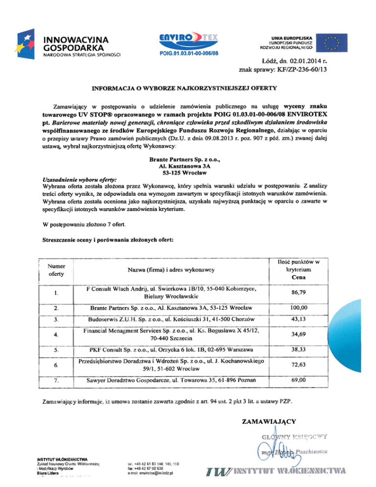 INNOWACYJNA GOSPODARKA NARODOWA STRATLGIA SPÓiNO,Cl UNIA EUROPEJSKA FIJROPFJ5KI FUNDUSZ ROZWOJU RŁGIONALNE GO POIG.01 .03.01-00.006108 Łódź, dn 02.O1.2014r. znak sprawy: KF!ZP-236-60!13 INFORMACJA O WYBORZE NAJKORZYSTNIEJSZEJ OFERTY Zamawiający w postępowaniu o udzielenie zamówienia publicznego na usługę wyceny znaku towarowego UV STOP® opracowanego w ramach projektu POIG 01.03.01-OO-006/08 ENYIROTEX pt. Barierowe inciteriały nowej generacji, chroniące człowieka przed szkodliwym działaniem środowiska współfinansowanego ze środków Europejskiego Funduszu Rozwoju Regionalnego, dziafając w oparciu o przepisy ustawy Prawo zamówień publicznych (DzU. z dnia 09.08.2013 r. poz. 907 z póż. zm.) zwanej dalej ustawą, wybrał najkorzystniejszą ofertę Wykonawcy: Brante Partners Sp. z o.o., AI. Kasztanowa 3A 53-125 Wrocław Uzasadnienie Hyboru oferty: Wybrana oferta została złożona przez Wykonawcę, który spełnia warunki udziału w postępowaniu. Z analizy treści oferty wynika, że odpowiadała ona wymogom zawartym w specyfikacji istotnych warunków zamówienia. Wybrana olrta została oceniona jako najkorzystniejsza, uzyskała najwyższą punktację w oparciu o zawarte w specyfkacj i istotnych warunków zamówienia kryterium. W postępowaniu złożono 7 ofert. Streszczenie oceny i porównania złożonych ofert: Numer oferty Ilość punktów w kryterium Cena Nazwa (firma) i adres wykonawcy F Consułt Włach Andrij, uł. Świerkowa lB/10. 55-040 Kohierzyce, Bielany Wrocławskie . Budoserwis Z.U.H. Sp. z o.o.. 3. iii. - 100,00 Brante Pariners Sp. z o.o.. Al. Kasztanowa 3A, 53-125 Wrocław 2. 79 C 43.13 Kościuszki 31, 41-500 Chorzów Financial Metiagment Seryices Sp. zo.o., ul. Ks. Bogusława X 45/12. 70-440 Szczecin 3469 5. PKF Consuit Sp. z o.o., ul. Orzycka 6 lok. 1B, 02-695 Warszawa 38.33 ) Przedsiębiorstwo l)oradztwa i Wdrożeń Sp. z o.o., ul. J. Kochanowskiego 59/1, 51-602 Wrocław 4 . „ 79 -. 69.00 Sawyer Doradztwo Ciospodarcze. ul. Towarowa 35, 61-896 l”oznaó 7. Zamawiający inhrmujc. iż umowa zostanie zawarta zgodnie z art. 91 list. 2 pkt 3 lit, a ustawy PZP. ZAMAWIAJĄCY - INSTYTUT WŁÓKIENNICTWA Zakład Naukowy Chem Wckir-iri Modyfikacj Wyrobow Biuro Lidera - Cz tel: +4842 61 63 44 l4 119 fax +46 42 61 92 638 e-ma eiyrotex6wJodz p1 r.