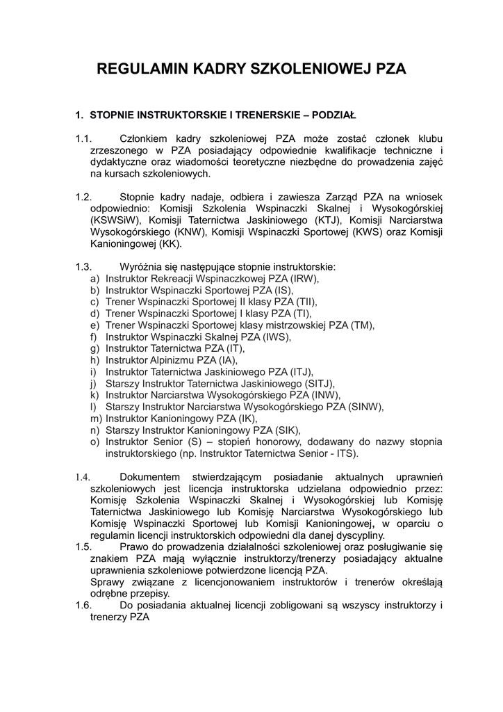 REGULAMIN KADRY SZKOLENIOWEJ PZA 1. STOPNIE INSTRUKTORSKIE I TRENERSKIE – PODZIAŁ 1.1. Członkiem kadry szkoleniowej PZA może zostać członek klubu zrzeszonego w PZA posiadający odpowiednie kwalifikacje techniczne i dydaktyczne oraz wiadomości teoretyczne niezbędne do prowadzenia zajęć na kursach szkoleniowych. 1.2. Stopnie kadry nadaje, odbiera i zawiesza Zarząd PZA na wniosek odpowiednio: Komisji Szkolenia Wspinaczki Skalnej i Wysokogórskiej (KSWSiW), Komisji Taternictwa Jaskiniowego (KTJ), Komisji Narciarstwa Wysokogórskiego (KNW), Komisji Wspinaczki Sportowej (KWS) oraz Komisji Kanioningowej (KK). 1.3. a) b) c) d) e) f) g) h) i) j) k) l) m) n) o) Wyróżnia się następujące stopnie instruktorskie: Instruktor Rekreacji Wspinaczkowej PZA (IRW), Instruktor Wspinaczki Sportowej PZA (IS), Trener Wspinaczki Sportowej II klasy PZA (TII), Trener Wspinaczki Sportowej I klasy PZA (TI), Trener Wspinaczki Sportowej klasy mistrzowskiej PZA (TM), Instruktor Wspinaczki Skalnej PZA (IWS), Instruktor Taternictwa PZA (IT), Instruktor Alpinizmu PZA (IA), Instruktor Taternictwa Jaskiniowego PZA (ITJ), Starszy Instruktor Taternictwa Jaskiniowego (SITJ), Instruktor Narciarstwa Wysokogórskiego PZA (INW), Starszy Instruktor Narciarstwa Wysokogórskiego PZA (SINW), Instruktor Kanioningowy PZA (IK), Starszy Instruktor Kanioningowy PZA (SIK), Instruktor Senior (S) – stopień honorowy, dodawany do nazwy stopnia instruktorskiego (np. Instruktor Taternictwa Senior - ITS). Dokumentem stwierdzającym posiadanie aktualnych uprawnień szkoleniowych jest licencja instruktorska udzielana odpowiednio przez: Komisję Szkolenia Wspinaczki Skalnej i Wysokogórskiej lub Komisję Taternictwa Jaskiniowego lub Komisję Narciarstwa Wysokogórskiego lub Komisję Wspinaczki Sportowej lub Komisji Kanioningowej, w oparciu o regulamin licencji instruktorskich odpowiedni dla danej dyscypliny. 1.5. Prawo do prowadzenia działalności szkoleniowej oraz posługiwanie się znakiem PZA mają wyłącznie instruktorzy/trenerzy posiadający aktualne uprawnienia szkoleniowe potwierdzone licencją PZA. Sprawy związane z licencjonowaniem instruktorów i trenerów określają odrębne przepisy. 1.6. Do posiadania aktualnej licencji zobligowani są wszyscy instruktorzy i trenerzy PZA 1.4. 2. STOPNIE INSTRUKTORSKIE i TRENERSKIE – WYMAGANIA 2.1. Stopień Instruktora Rekreacji Wspinaczkowej PZA może uzyskać osoba, która: a) ukończyła 21 lat, b) posiada wykształcenie co najmniej średnie, c) odznacza się nienaganną postawa moralno-etyczną, d) wspina się od co najmniej 1 roku e) czynnie uprawia wspinaczkę, f) posiada stopień Instruktora Rekreacji Ruchowej o specjalności wspinaczka skałkowa i zaliczyła pozytywnie weryfikację PZA, lub g) ukończyła kurs na stopień Instruktora Rekreacji Wspinaczkowej organizowany lub licencjonowany przez PZA i w okresie do 2 lat od ukończenia kursu IRW zaliczyła: - staż praktyczny na kursie wspinaczki sportowej w części dotyczącej wspinaczki jednowyciągowej (2 dni), - staż praktyczny na zajęciach na ścianie wspinaczkowej prowadzonych przez trenera lub instruktora sportu w wymiarze 10 godzin. Staże muszą odbywać się pod nadzorem bezpośrednim instruktorów lub/i trenerów wyznaczonych przez KWS i KSWSiW. 2.2. Stopień Instruktora Wspinaczki Sportowej PZA może uzyskać osoba, która: a) ukończyła 21 lat, b) posiada wykształcenie co najmniej średnie, c) odznacza się nienaganną postawa moralno-etyczną, d) wspina się od co najmniej 5 lat, e) czynnie uprawia wspinaczkę skalną popartą wykazem przejść, f) posiada stopień Instruktora Sportu o specjalności Wspinaczka Sportowa i zaliczyła pozytywnie weryfikację unifikację PZA, lub g) ukończyła kurs na stopień Instruktora Wspinaczki Sportowej organizowany lub licencjonowany przez PZA i w okresie do 1 roku od ukończenia kursu zaliczyła: - staż praktyczny na pełnym kursie wspinaczki skalnej, oraz - staż praktyczny na zajęciach na ścianie wspinaczkowej prowadzonych przez trenera lub instruktora sportu w wymiarze 10 godzin. Staże muszą odbywać się pod nadzorem bezpośrednim instruktorów lub trenerów wyznaczonych przez KWS i KSWSiW. Stopień Trenera Wspinaczki Sportowej PZA II klasy może uzyskać osoba, która: a) posiada stopień Trenera Wspinaczki Sportowej II klasy i zaliczyła pozytywnie unifikację PZA, b) posiada stopień Instruktora Wspinaczki Sportowej PZA, udokumentowała pracę instruktorską przez co najmniej 2 lata i ukończyła kurs na stopień Trenera Wspinaczki Sportowej II klasy organizowany lub licencjonowany przez PZA. 2.3. Stopień Trenera Wspinaczki Sportowej PZA I klasy może uzyskać osoba, która: a) posiada Stopień Trenera Wspinaczki Sportowej PZA II klasy co najmniej 2 lata i udokumentowała pracę instruktorską/trenerską przez co najmniej 2 lata, b) spełni wymogi określone dla tego stopnia w Regulaminie Licencjonowania Trenerów. 2.4. 2.5. Stopień Trenera Klasy Mistrzowskiej może uzyskać osoba która: a) ukończyła 30 lat, b) udokumentowała pracę trenerską przez co najmniej 5 lat, c) posiada znaczące osiągnięcia trenerskie, c) spełni wymogi określone dla tego stopnia w Regulaminie Licencjonowania Trenerów. 2.6. a) b) c) d) e) f) g) h) Stopień Instruktora Wspinaczki Skalnej PZA może uzyskać osoba, która: ukończyła 21 lat, ukończyła kurs wspinaczki skalnej wg programu PZA, posiada wykształcenie co najmniej średnie, czynnie uprawia wspinaczkę skalną (popartą wykazem przejść dróg na własnej asekuracji) od co najmniej 5 lat, odznacza się nienaganną postawą moralno-etyczną, ukończyła kurs Instruktora Wspinaczki Skalnej PZA organizowany przez PZA, w okresie do 3 lat od ukończenia kursu Instruktora Wspinaczki Skalnej zaliczyła dwa staże praktyczne na pełnym kursie wspinaczki skalnej, lub posiada stopień instruktora taternictwa jaskiniowego i zaliczyła odpowiedni staż praktyczny. 2.7. Stopień Instruktora Taternictwa PZA może uzyskać 