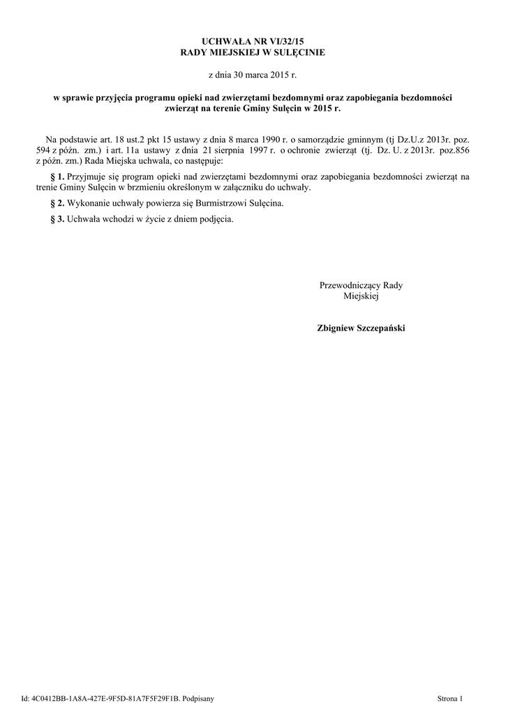 UCHWAŁA NR VI/32/15 RADY MIEJSKIEJ W SULĘCINIE z dnia 30 marca 2015 r. w sprawie przyjęcia programu opieki nad zwierzętami bezdomnymi oraz zapobiegania bezdomności zwierząt na terenie Gminy Sulęcin w 2015 r. Na podstawie art. 18 ust.2 pkt 15 ustawy z dnia 8 marca 1990 r. o samorządzie gminnym (tj Dz.U.z 2013r. poz. 594 z późn. zm.) i art. 11a ustawy z dnia 21 sierpnia 1997 r. o ochronie zwierząt (tj. Dz. U. z 2013r. poz.856 z późn. zm.) Rada Miejska uchwala, co następuje: § 1. Przyjmuje się program opieki nad zwierzętami bezdomnymi oraz zapobiegania bezdomności zwierząt na trenie Gminy Sulęcin w brzmieniu określonym w załączniku do uchwały. § 2. Wykonanie uchwały powierza się Burmistrzowi Sulęcina. § 3. Uchwała wchodzi w życie z dniem podjęcia. Przewodniczący Rady Miejskiej Zbigniew Szczepański Id: 4C0412BB-1A8A-427E-9F5D-81A7F5F29F1B. Podpisany Strona 1 Załącznik do Uchwały Nr VI/32/15 Rady Miejskiej w Sulęcinie z dnia 30 marca 2015 r. Program opieki nad zwierzętami bezdomnymi oraz zapobiegania bezdomności zwierząt na terenie Gminy Sulęcin w 2015 roku. Rozdział 1. CEL I ZADANIA PROGRAMU § 1. 1. Celem Programu jest zapobieganie bezdomności zwierząt na terenie Gminy Sulęcin oraz opieka nad zwierzętami bezdomnymi. 2. Zadania priorytetowe Programu to: 1) ograniczenie populacji bezdomnych zwierząt poprzez sterylizację, kastrację zwierząt domowych, w szczególności psów i kotów, 2) usypianie ślepych miotów, 3) zapewnienie opieki bezdomnym zwierzętom z terenu Gminy Sulęcin w schronisku, 4) sprawowanie opieki nad wolno żyjącymi kotami, w tym ich dokarmianie, 5) poszukiwanie nowych właścicieli dla bezdomnych zwierząt, 6) odławianie bezdomnych zwierząt, 7) zapewnienie całodobowej opieki weterynaryjnej w przypadkach zdarzeń drogowych z udziałem zwierząt. Rozdział 2. OPIEKA NAD ZWIERZĘTAMI § 2. Zapewnienie opieki bezdomnym zwierzętom realizowane jest poprzez: 1. wyłapywanie bezdomnych zwierząt, w tym zagubionych, wałęsających się pozostających bez właściciela, w celu zapewnienia im bezterminowej opieki do czasu adopcji, lub do czasu odnalezienia właściciela. 2. zapewnienie opieki lekarsko-weterynaryjnej, schronienia i wyżywienia bezdomnym zwierzętom wyłapanym z terenu gminy oraz zwierzętom, które utraciły właściciela, 3. poszukiwanie nowych właścicieli dla zwierząt bezdomnych przebywających w schronisku z którymi Gmina ma podpisaną umowę, zapewnienie bezterminowej opieki do czasu adopcji, wyłapanym i przekazanym do schroniska zwierzętom. § 3. Zmniejszenie populacji zwierząt bezdomnych realizowane jest poprzez: 1. wykonywanie na koszt Gminy sterylizacji i kastracji zwierząt przebywających w schronisku, przed przekazaniem ich nowym właścicielom, 2. współpracę ze społecznymi opiekunami kotów wolno żyjących w zakresie ograniczania ich rozrodczości poprzez wyłapywanie w celu poddania ich zabiegowi sterylizacji i kastracji wykonywanych przez podmiot z którym Gmina ma zawartą umowę i wypuszczenie ich na wolność w miejscu złapania. § 4. Realizację działań dotyczących przeciwdziałania bezdomności zwierząt prowadzić będzie: 1. Wydział Gospodarki Komunalnej, Mieszkaniowej i Ochrony Środowiska poprzez wskazanie gospodarstwa rolnego, zapewniającego miejsce dla zwierząt gospodarskich, 2. Schronisko poprzez przyjmowanie zwierząt bezdomnych dostarczanych do schroniska na podstawie umowy zawartej z Gminą, 3. Firma adopcyjna, która prowadzi adopcję bezdomnych zwierząt na podstawie umowy zawartej z Gminą. Rozdział 3. OPIEKA NAD WOLNO ŻYJĄCYMI KOTAMI Id: 4C0412BB-1A8A-427E-9F5D-81A7F5F29F1B. Podpisany Strona 1 § 5. 1. Sprawowanie opieki nad kotami wolno żyjącymi, w tym ich dokarmianie realizują: pracownicy Wydziału Gospodarki Komunalnej, Mieszkaniowej i Ochrony Środowiska poprzez: 1) zakup i wydawanie karmy społecznym opiekunom kotów wolno żyjących, którzy zarejestrowani są w Wydziale Gospodarki Komunalnej, Mieszkaniowej i Ochrony Środowiska, 2) wydawanie skierowań na leczenie zwierząt, w ramach zawartych umów z zakładami leczniczymi dla zwierząt, 3) wydawanie opiekunom kotów wolno żyjących (karmicielom) skierowań na zabiegi sterylizacji, kastracji i usypiania ślepych miotów w zakładach leczniczych dla zwierząt, z którymi Gmina Sulęcin podpisała umowę, 4) podejmowanie interwencji w sprawach kotów wolno żyjących przy udziale przedstawiciela Wydziału Gospodarki Komunalnej, Mieszkaniowej i Ochrony Środowiska. Rozdział 4. ODŁAWIANIE BEZDOMNYCH ZWIERZĄT § 6. 1. Odławianie ma charakter stały i podlegać mu będą zwierzęta, które uciekły, zabłąkały się lub zostały porzucone przez człowieka, a nie istnieje możliwość ustalenia ich właściciela lub innej osoby, pod której opieką trwale dotąd pozostawały. 2. Pracownicy Urzędu podejmują decyzję o odłowieniu zwierzęcia. 3. Odławianie i opiekę nad bezdomnymi zwierzętami do czasu ich przewiezienia do schroniska, realizować będzie Urząd za pośrednictwem firmy „RACKER” Hotel dla Zwierząt Ewelina Kaczmarek, Brzozowiec ul. Polna 26a,66-446 Deszczno. 4. Mieszkańcy gminy zostaną poinformowani o odławianych zwierzętach bezpańskich obwieszczeniem Burmistrza na tablicach ogłoszeń na terenie miasta i gminy oraz na stronie internetowej urzędu www.sulecin.pl Rozdział 5. OGRANICZENIE POPULACJI BEZDOMNYCH ZWIERZĄT POPRZEZ OBLIGATORYJNĄ STERYLIZACJĘ ALBO KASTRACJĘ ZWIERZĄT W SCHRONISKU DLA ZWIERZĄT § 7. 1. Ograniczanie populacji bezdomnych zwierząt poprzez sterylizację i kastrację realizują: 1) Schronisko Vet-Agro Serwis ul. M.Konopnickiej 62, 64-980 Trzcianka poprzez obligatoryjne przeprowadzanie zabiegów sterylizacji i kastracji zwierząt przyjętych do schroniska, z wyjątkiem zwierząt u których istnieją przeciwwskazania do wykonania tych zabiegów, z uwagi na stan ich zdrowia lub wiek; 2) Pracownicy Wydziału Gospodarki Komunalnej, Mieszkaniowej i Ochr
