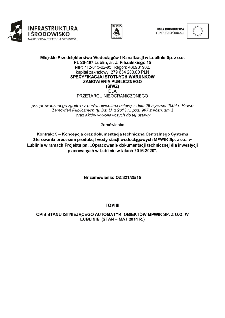Miejskie Przedsiębiorstwo Wodociągów i Kanalizacji w Lublinie Sp. z o.o. PL 20-407 Lublin, al. J. Piłsudskiego 15 NIP: 712-015-02-95, Regon: 430981982, kapitał zakładowy: 279 634 200,00 PLN SPECYFIKACJA ISTOTNYCH WARUNKÓW ZAMÓWIENIA PUBLICZNEGO (SIWZ) DLA PRZETARGU NIEOGRANICZONEGO przeprowadzanego zgodnie z postanowieniami ustawy z dnia 29 stycznia 2004 r. Prawo Zamówień Publicznych (tj. Dz. U. z 2013 r., poz. 907 z późn. zm..) oraz aktów wykonawczych do tej ustawy Zamówienie: Kontrakt 5 – Koncepcja oraz dokumentacja techniczna Centralnego Systemu Sterowania procesem produkcji wody stacji wodociągowych MPWiK Sp. z o.o. w Lublinie w ramach Projektu pn. „Opracowanie dokumentacji technicznej dla inwestycji planowanych w Lublinie w latach 2016-2020". Nr zamówienia: OZ/321/25/15 TOM III OPIS STANU ISTNIEJĄCEGO AUTOMATYKI OBIEKTÓW MPWIK SP. Z O.O. W LUBLINIE (STAN – MAJ 2014 R.) I. 1. Opis stanu istniejącego automatyki obiektów MPWiK (stan - maj 2014) Stacja Pomp Zemborzycka : Stacja wyposażona jest w 9 zespołów pompowych ( o numeracji 1, 2, 3, 5, 7, 8, 9, 10, 11), zainstalowanych na hali pomp w tym 3 regulowane (7, 8, 9) zasilane poprzez kaskady tyrystorowe. Wszystkie zespoły pompowe ( z wyjątkiem 3 regulowanych) do rozruchu wymagają obecnie ręcznego rozruchu z rozrusznika. W Stacji Pomp Zemborzycka funkcjonuje kilka niezależnych systemów sterowania i zbierania danych: • Oparty o sterownik typu Festo FPC 405 system umożliwiający zadawanie i stabilizację ciśnienia na wyjściach do miasta (2 wyjścia ponieważ stacja pracuje w 2 kierunkach ). Sterownik jest połączony poprzez port RS232 z komputerem PC na którym jest zainstalowana aplikacja Axeda Supervisor umożliwiająca nastawę ciśnienia, załączanie i wyłączanie 3 zespołów pompowych (nr 7, 8, 9). Zespoły te napędzane są poprzez kaskady tyrystorowe zasilające silniki pierścieniowe. System ten sygnalizuje również przekroczenie temperatyry łożysk w zespołach pompowych. • Oparty o aplikację Telwin Scada system sterowania ujęciami wody Prawiedniki , Wilczopole i śledzenia procesów technologicznych na Stacji Pomp Zemborzycka. System ten składa się ze stanowiska komputerowego z zainstalowanym systemem operacyjnym Windows 8 Professional i aplikacją Telwin Scada. Poprzez wewnętrzną sieć MPWiK oraz serwer portów ( NPort MOXA 5400) system łączy się (bezprzewodowo z wykorzystaniem radiomodemów SATELINE) ze sterownikami typu Siemens S7-300 zainstalowanymi w studni nr 8 na ujęciu Wilczopole oraz w rozdzielni R1 na ujęciu Prawiedniki. Sterowniki te obsługują odpowiednio 8 studni głębinowych na ujęciu Wilczopole i 17 studni na ujęciu Prawiedniki. System umożliwia zdalne załączanie i wyłączanie studni, sygnalizację stanu pracy i stanów awaryjnych oraz zliczanie czasu pracy studni. Z każdej studni docierają również pomiary chwilowe prądu pompy i przepływu (w studni nr 19 ujęcia Prawiedniki także pomiar ciśnienia). Komputer z aplikacją Telwin Scada połączony jest również poprzez drugi port RS232 (Nportu MOXA) ze sterownikiem typu Siemens S7-300 zainstalowanym w pomieszczeniu obok dyżurki, którego zadaniem jest obsługa wszystkich sygnałów lokalnych – ze Stacji Pomp Zemborzycka. Sterownik ten zbiera wszystkie dane o pracy zespołów pompowych na hali (pomiary prądu pomp, stany pracy itp.), pomiary i sygnalizacje z chlorowni, zbiorników wody (z komorami zasuw) i rozdzielni elektrycznych. • Stanowisko komputerowe z aplikacją Telwin Scada umożliwiające obsłudze podgląd na pomiary wszystkich stacji wodociągowych. Komputer ten jest połączony poprzez port RS232 z lokalnym sterownikiem typu SAIA PCD1 (umieszczonym w szafie w dyspozytorni) do którego doprowadzone są niektóre Zemborzycka (ciśnienia, ważniejsze przepływy, pomiary pomiary ze Stacji poziomu Pomp wody w zbiornikach, pomiar ilości chloru pozostałego w wodzie). Ze stanowiska tego sterowane są również studnie osiedlowe (Koncertowa, Przyjaźni, Skrzatów, Felin, Narcyzowa). Na hali pomp zainstalowane są zasuwy i przepustnice z napędem elektrycznym – po 2 na każdym zespole pompowym (rurociąg ssawny i tłoczny) oraz 15 szt. w różnych punktach na rurociągach. Wszystkie zasuwy i przepustnice sterowane są lokalnie z przycisków. Obiekt jest wyposażony w system SSW oparty na centrali alarmowej Integra firmy SATEL. 2. Stacja Pomp i ujęcie „Sławinek” W Stacji pomp „Sławinek” wykonano cyfrowy system sterowania i wizualizacji procesu technologicznego, opartego na sterowniku PCD4 firmy SAIA oraz na oprogramowaniu AXEDA Supervisor 1.0. Sterownik PCD4 składa się z modułów: • zasilacza PCD4.N210; • procesora PCD4.M170; • wejść cyfrowych PCD4.E600 (szt.8 x 16 wej.= 128 : wykorzystane 121 wejścia); • wyjść cyfrowych PCD4.A410 (szt.7 x 16 wyj.=112 ; wykorzystane 96 wyjść); • wejść analogowych PCD4.W500 (szt.3 x 8 wej.=24; wykorzystane 24 wejścia); • wyjść analogowych PCD4.W600 (szt.2 x 8 wyj.=16; wykorzystane 12 wyjść); Komputerowe stanowisko sterowania i wizualizacji umożliwia śledzenie procesu technologicznego oraz umożliwia : • sterowanie pracą pomp głębinowych I-go stopnia ( 8 studni głębinowych z możliwością załącz/wyłącz zdalnie z systemu i lokalnie z szaf energetycznych w rozdzielni); • sterowanie pracą pomp II-go stopnia ( 2 zespoły pompowe współpracujące z przemiennikami częstotliwości Danfoss każdy z osobnym oraz 2 zespoły pompowe współpracujące z Softstartami firmy Danfoss z możliwością załącz/wyłącz zdalnie z systemu i lokalnie z szafki sterowania lokalnego); • sterowanie pracą przepustnic ( 4 przepustnice z możliwością załącz/wyłącz zdalnie z systemu i lokalnie z szafki sterowania lokalnego); • podgląd parametrów energetycznych na zasilaniu obiektu; • podgląd stanów pracy poszczególnych procesów, stanów alarmowych oraz sygnalizacji i pomiarów istotnych parametrów techno