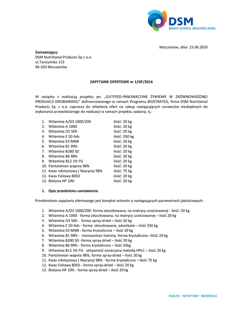 Mszczonów, dnia 15.06.2016 Zamawiaj cy: DSM Nutritional Products Sp z o.o. ul.Tarczy ska 113 96-320 Mszczonów ZAPYTANIE OFERTOWE nr 1/GF/2016 W zwi zku z realizacj projektu pn. „GUTFEED-INNOWACYJNE YWIENIE W ZRÓWNOWA ONEJ PRODUKCJI DROBIARSKIEJ” dofinansowanego w ramach Programu BIOSTRATEG, firma DSM Nutritional Products Sp. z o.o. zaprasza do sk adania ofert na zakup nast puj cych surowców niezb dnych do wykonania przewidzianego do realizacji w ramach projektu zadania, tj.: 1. 2. 3. 4. 5. 6. 7. 8. 9. 10. 11. 12. 13. Witamina A/D3 1000/200 Witamina A 1000 Witamina D3 500 Witamina E 50 Ads Witamina K3 MNB Witamina B1 99% Witamina B280 SD Witamina B6 98% Witamina B12 1% FG Pantotenian wapnia 98% Kwas nikotynowy ( Niacyna) 98% Kwas Foliowy 80SD Biotyna HP 10% ilo ilo ilo ilo ilo ilo ilo ilo ilo ilo ilo ilo ilo : 20 kg : 20 kg : 20 kg : 350 kg : 20 kg : 20 kg : 20 kg : 20 kg : 20 kg : 20 kg : 75 kg : 20 kg : 20 kg 1. Opis przedmiotu zamówienia: Przedmiotem zapytania ofertowego jest komplet witamin o nast puj cych parametrach jako ciowych: 1. 2. 3. 4. 5. 6. 7. 8. 9. 10. 11. 12. 13. Witamina A/D3 1000/200- forma otoczkowana, na matrycy usieciowanej - ilo : 20 kg Witamina A 1000 - forma otoczkowana, na matrycy usieciowanej – ilo 20 kg Witamina D3 500 - forma spray-dried – ilo 20 kg Witamina E 50 Ads - forma otoczkowana, adsorbate – ilo 350 kg Witamina K3 MNB - forma krystaliczna – ilo 20 kg Witamina B1 98% - monoazotan tiaminy, forma krystaliczna –ilo 20 kg Witamina B280 SD -forma spray-dried – ilo 20 kg Witamina B6 99% - forma krystaliczna – ilo 20kg Witamina B12 1% FG- aktywno oznaczana metod HPLC – ilo 20 kg Pantotenian wapnia 98%, forma spray-dried – ilo 20 kg Kwas nikotynowy ( Niacyna) 98% - forma krystaliczna – Ilo 75 kg Kwas Foliowy 80SD - forma spray-dried – ilo 20 kg Biotyna HP 10% - forma spray-dried – ilo 20 kg Oferty nie spe niaj ce ww. opisu przedmiotu zamówienia nie b brane pod uwag . 2. Planowany termin realizacji: max. do 30.09.2016 3. Kryteria oceny ofert: Kryteria obligatoryjne: • Termin wa no ci oferty (minimum 60 dni od daty wystawienia). • Oferta musi zawiera nast puj ce elementy: dat wystawienia, dane adresowe oferenta, dane pozwalaj ce oceni ofert , by skierowana do Zamawiaj cego, tj. do DSM Nutritional Products Sp z o.o. 4. Kryteria punktowe: Kryteria wyboru Znaczenie Cena netto Okres przydatno ci do u ycia 74 % 26 % Maksymalna punktów 74 26 liczba 5. Sposób oceny oferty w poszczególnych kryteriach punktowych: a) Punkty w ramach kryterium ceny b przyznawane wg nast puj cej formu y: C min A n = ----------------- x 100 x 74% Cr C min – cena minimalna w zbiorze C r – cena oferty rozpatrywanej A n – ilo punktów przyznana ofercie Wszystkie oferty z one w walucie innej ni PLN zostan przeliczone na z otówki po kursie rednim NBP z dnia poprzedzaj cego dzie wyboru ofert. Cena powinna obejmowa wszystkie koszty jakie poniesienie oferent z zwi zku z ewentualn realizacj umowy zawartej w wyniku wyboru oferty(DDP Mszczonów- INCOTERMS 2010) b) Punkty w ramach kryterium „Okres przydatno ci do u ycia ” b nast puj cych przedzia ów: • • przyznawane wg Okres przydatno ci do u ycia do 10 miesi cy w cznie (dla ka dej witaminy odpowiednio)- 0 pkt. Okres przydatno ci do u ycia od 10 miesi cy do 12 miesi cy w cznie (dla ka dej witaminy odpowiednio) – 2 pkt 6. Zamawiaj cy nie dopuszcza mo liwo ci sk adania ofert cz ciowych. 7. Sposób i miejsce sk adania ofert: 1. Na adres mailowy: [email protected] lub 2. Przesy pocztow lub kuriersk na adres firmy: DSM Nutritional Products Sp z o.o. ul. Tarczy ska 113,96-320 Mszczonów 8. Termin dostarczania ofert up ywa w dniu: 23-06-2016 9. Osoba kontaktowa upowa niona ze strony Zamawiaj cego do kontaktów z Oferentami: Marzena Baliszewska, email: [email protected], tel. 46 857 31 04 lub tel.kom.+48 601 980 377, tel. 10. Zastrze enia: Niniejsze zapytanie ofertowe nie zobowi zuje firmy DSM Nutritional Products Sp z o.o. do adnego okre lonego dzia ania. Wydanie niniejszego zapytania ofertowego nie zobowi zuje DSM Nutritional Products Sp z o.o. do akceptacji oferty, w ca ci lub cz ci i nie zobowi zuje firmy DSM Nutritional Products Sp z o.o. do sk adania wyja nie czy powodów akceptacji lub odrzucenia oferty. DSM Nutritional Products Sp z o.o. nie mo e by poci gana do odpowiedzialno ci za jakiekolwiek koszty czy wydatki poniesione przez oferentów w zwi zku z przygotowaniem i dostarczeniem oferty. DSM Nutritional Products Sp z o.o. zastrzega sobie prawo w ka dej chwili do zmian ca ci lub cz ci zapytania ofertowego. Z powa aniem Marzena Baliszewska Kierownik Zaopatrzenia DSM Nutritional Products Sp zo.o.