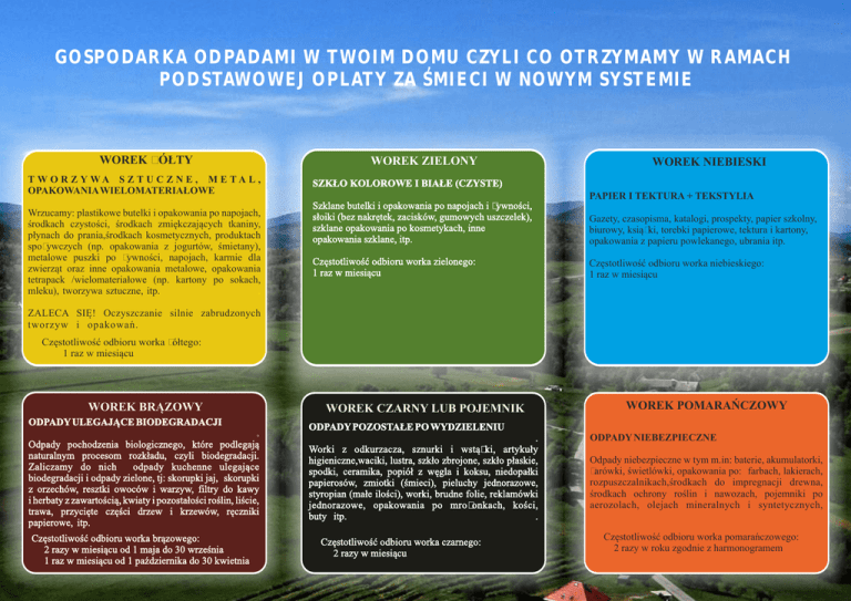 GOSPODARKA ODPADAMI W TWOIM DOMU CZYLI CO OTRZYMAMY W RAMACH , PODSTAWOWEJ OPLATY ZA SMIECI W NOWYM SYSTEMIE WOREK ŻÓŁTY T W O R Z Y WA S Z T U C Z N E , M E TA L , OPAKOWANIA WIELOMATERIAŁOWE . Wrzucamy: plastikowe butelki i opakowania po napojach, środkach czystości, środkach zmiękczających tkaniny, płynach do prania,środkach kosmetycznych, produktach spożywczych (np. opakowania z jogurtów, śmietany), metalowe puszki po żywności, napojach, karmie dla zwierząt oraz inne opakowania metalowe, opakowania tetrapack /wielomateriałowe (np. kartony po sokach, mleku), tworzywa sztuczne, itp. . WOREK ZIELONY WOREK NIEBIESKI SZKŁO KOLOROWE I BIAŁE (CZYSTE) PAPIER I TEKTURA + TEKSTYLIA Szklane butelki i opakowania po napojach i żywności, słoiki (bez nakrętek, zacisków, gumowych uszczelek), szklane opakowania po kosmetykach, inne opakowania szklane, itp. Gazety, czasopisma, katalogi, prospekty, papier szkolny, biurowy, książki, torebki papierowe, tektura i kartony, opakowania z papieru powlekanego, ubrania itp. Częstotliwość odbioru worka zielonego: 1 raz w miesiącu Częstotliwość odbioru worka niebieskiego: 1 raz w miesiącu ZALECA SIĘ! Oczyszczanie silnie zabrudzonych tworzyw i opakowań. . Częstotliwość odbioru worka żółtego: 1 raz w miesiącu WOREK BRĄZOWY ODPADY ULEGAJĄCE BIODEGRADACJI . Odpady pochodzenia biologicznego, które podlegają naturalnym procesom rozkładu, czyli biodegradacji. Zaliczamy do nich odpady kuchenne ulegające biodegradacji i odpady zielone, tj: skorupki jaj, skorupki z orzechów, resztki owoców i warzyw, filtry do kawy i herbaty z zawartością, kwiaty i pozostałości roślin, liście, trawa, przycięte części drzew i krzewów, ręczniki papierowe, itp. Częstotliwość odbioru worka brązowego: 2 razy w miesiącu od 1 maja do 30 września 1 raz w miesiącu od 1 października do 30 kwietnia WOREK CZARNY LUB POJEMNIK WOREK POMARAŃCZOWY ODPADY POZOSTAŁE PO WYDZIELENIU . Worki z odkurzacza, sznurki i wstążki, artykuły higieniczne,waciki, lustra, szkło zbrojone, szkło płaskie, spodki, ceramika, popiół z węgla i koksu, niedopałki papierosów, zmiotki (śmieci), pieluchy jednorazowe, styropian (małe ilości), worki, brudne folie, reklamówki jednorazowe, opakowania po mrożonkach, kości, buty itp. . Częstotliwość odbioru worka czarnego: 2 razy w miesiącu ODPADY NIEBEZPIECZNE . Odpady niebezpieczne w tym m.in: baterie, akumulatorki, żarówki, świetlówki, opakowania po: farbach, lakierach, rozpuszczalnikach,środkach do impregnacji drewna, środkach ochrony roślin i nawozach, pojemniki po aerozolach, olejach mineralnych i syntetycznych, Częstotliwość odbioru worka pomarańczowego: 2 razy w roku zgodnie z harmonogramem NOWY SYSTEM GOSPODARKI ODPADAMI NA TERENIE GMINY Opłatę uiszcza się przelewem na rachunek bankowy urzędu gminy lub u inkasentów (sołtysów). W przypadku nieterminowych wpłat za gospodarowanie odpadami będą one ściągane w myśl przepisów ustawy „Ordynacja podatkowa”. Właściciel nieruchomości będzie wpłacał opłatę za gospodarowanie odpadami komunalnymi na konto gminy raz na kwartał bez wezwania w terminach: 1) za I kwartał do 15 marca każdego kalendarzowego, 2) za II kwartał do 15 maja każdego kalendarzowego, 3) za III kwartał do15 września każdego kalendarzowego, 4) za IV kwartał do 15 listopada każdego kalendarzowego. Szanowni Mieszkańcy! roku roku roku roku Termin wniesienia pierwszej opłaty upływa w dniu 15 września 2013 r. i obejmuje okres od 1 lipca 2013 r. do 30 września 2013 r. Odpady zmieszane i selektywnie zebrane z poszczególnych nieruchomości odbierane będą przez przedsiębiorcę wyłonionego w drodze przetargu. Opłata za odpady posegregowane będzie niższa, opłaca się więc segregować. Nowym systemem zbiórki odpadów objęte zostaną wszystkie nieruchomości zamieszkałe na terenie gminy. Właściciel nieruchomości nie zamieszkałej (szkoły, sklepy, firmy itp.) zobowiązany jest do posiadania umowy z przedsiębiorcą posiadającym wpis do rejestru działalności regulowanej na terenie gminy. W przypadku prowadzenia działalności gospodarczej w budynku mieszkalnym (np. sklep itp.) właściciel nieruchomości zgodnie z ustawą zobowiązany jest dodatkowo (oprócz złożenia deklaracji do urzędu gminy) do posiadania umowy na wywóz odpadów komunalnych z tej działalności. Dodatkowe informacje dostępne będą w urzędzie gminy oraz na stronie internetowej gminy. GOSPODARKA ODPADAMI W TWOIM DOMU Właściciele nieruchomości zostaną zaopatrzeni przez firmę wybraną w drodze przetargu w odpowiednie worki oraz naklejki identyfikacyjne. O D PA D Y W I E L K O G A B A R Y T O W E , MEBLE, OPONY ORAZ ZUŻYTY SPRZĘT ELEKTRYCZNY I ELEKTRONICZNY Odpady te będą odbierane od mieszkańców podczas ustalonych zbiórek dwa razy w roku zgodnie z harmonogramem. . ODPADY BUDOWLANE I ROZBIÓRKOWE Odpady budowlane i rozbiórkowe, które powstały w wyniku prowadzenia drobnych robót nie wymagających pozwolenia na budowę oraz zgłoszenia zamiaru prowadzenia robót do starosty, właściciele nieruchomości mogą we własnym zakresie je zagospodarować. . . PRZETERMINOWANE LEKI Należy przekazywać samodzielnie do pojemników znajdujących się w aptekach/ punktach aptecznych w godzinach ich otwarcia. ZUŻYTE BATERIE I AKUMULATORKI Można przekazywać samodzielnie do punktów zbiórki znajdujących się w Urzędzie Gminy, szkołach i świetlicach wiejskich do specjalistycznych pojemników w godzinach pracy. . Zgodnie z ustawą o utrzymaniu czystości i porządku w gminach, od 1 lipca 2013 r. gmina będzie odpowiedzialna za zorganizowanie odbioru i zagospodarowania odpadów komunalnych od właścicieli nieruchomości. Nowelizacja ustawy nakłada na właścicieli nieruchomości, w których zamieszkują mieszkańcy obowiązek uiszczania opłat za odbiór i zagospodarowanie odpadów komunalnych. Uiszczanie opłat jest zatem obowiązkiem wynikającym z