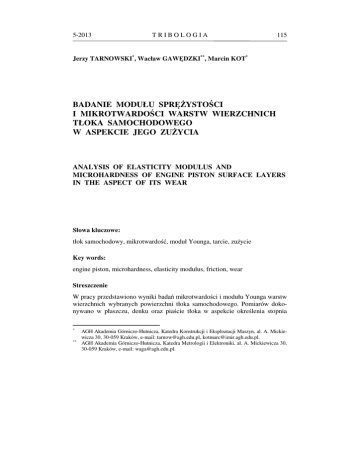 5-2013 TRIBOLOGIA 115 Jerzy TARNOWSKI*, Wacław GAWĘDZKI**, Marcin KOT* BADANIE MODUŁU SPRĘŻYSTOŚCI I MIKROTWARDOŚCI WARSTW WIERZCHNICH TŁOKA SAMOCHODOWEGO W ASPEKCIE JEGO ZUŻYCIA ANALYSIS OF ELASTICITY MODULUS AND MICROHARDNESS OF ENGINE PISTON SURFACE LAYERS IN THE ASPECT OF ITS WEAR Słowa kluczowe: tłok samochodowy, mikrotwardość, moduł Younga, tarcie, zużycie Key words: engine piston, microhardness, elasticity modulus, friction, wear Streszczenie W pracy przedstawiono wyniki badań mikrotwardości i modułu Younga warstw wierzchnich wybranych powierzchni tłoka samochodowego. Pomiarów dokonywano w płaszczu, denku oraz piaście tłoka w aspekcie określenia stopnia * ** AGH Akademia Górniczo-Hutnicza, Katedra Konstrukcji i Eksploatacji Maszyn, al. A. Mickiewicza 30, 30-059 Kraków, e-mail: [email protected], [email protected]. AGH Akademia Górniczo-Hutnicza, Katedra Metrologii i Elektroniki, al. A. Mickiewicza 30, 30-059 Kraków, e-mail: [email protected]. 116 TRIBOLOGIA 5-2013 zużycia. Przedstawiono metodykę przeprowadzonych badań oraz scharakteryzowano obiekt badawczy w postaci tłoka Φ 80,0 mm, wykonanego ze stopu aluminiowego. Przedstawiono przebiegi czasowe zadawanego obciążenia P oraz wartości zagłębienia h wgłębnika w powierzchnię próbki piasty, płaszcza oraz denka tłoka. Zamieszczono charakterystyki wartości średnich oraz odchyleń standardowych modułu Younga E w funkcji siły obciążającej Pmax dla wybranych warstw wierzchnich. Dokonano analizy uzyskanych wyników badań oraz sformułowano wnioski końcowe. WPROWADZENIE Pośród wielu skojarzeń tribologicznych w budowie maszyn i urządzeń jednym z najpowszechniej występujących jest para trąca tłok–cylinder. Bardzo trudne warunki pracy tych skojarzeń, na które składają się wysokie zmienne wartości cyklicznego ciśnienia i temperatury powodują znaczące zmiany w zużywaniu się tych elementów. W warstwach wierzchnich tłoka można wyróżnić wiele rodzajów zużycia (ścierne, adhezyjne, cieplne, zatarcie), które ze względu na złożony mechanizm ich powstawania powodują trudności w ocenie całkowitej jego trwałości [L. 6, 9]. Z uwagi na zmienność rodzajów zużycia tłok musi charakteryzować się wysoką odpornością na ścieranie w wysokich temperaturach i podwyższonych ciśnieniach, a zarazem wykazywać wysoką sztywność konstrukcji płaszcza. Gwarancją bezawaryjnej i długotrwałej pracy tłoka są optymalne wartości luzów założone we współpracy z cylindrem. Dla minimalizacji zużycia mechanicznego, w budowie tłoka przewidziano miejsca o zwielokrotnionej grubości jego denka i piasty. Mając na uwadze występujące w tłoku zużycie cieplne, wprowadza się różne systemy chłodzenia i smarowania. Ze względu na występujące różne postacie zużycia warstw wierzchnich miarą do określania jego wartości mogą być następujące parametry: mikrotwardość i moduł Younga [L. 3, 4, 10]. Precyzyjny pomiar tych parametrów może pozwolić na określenie stopnia zużycia części składowych tłoka: denka, płaszcza i piasty. Określenie tych parametrów względem ich wartości początkowej może dawać pogląd o stanie resursu eksploatacyjnego ukonstytuowanych wcześniej warstw wierzchnich tłoka. Określenie stanu zużywania następuje zazwyczaj przez pomiar utraty masy w jednostce czasu, jednak parametry µHV oraz E mogą określać zmiany w strukturze składników strukturalnych warstw wierzchnich, występujące podczas procesów tarcia [L. 6, 9]. Pozwala to na prognozowanie okresu eksploatacji i ocenę trwałości skojarzeń tribologicznych. W artykule [L. 10] przeprowadzono podobne badania dotyczące zmian mikrotwardości warstwy wierzchniej tulei cylindrowej w okresie od rozpoczęcia procesu tarcia do wystąpienia zatarcia. 5-2013 TRIBOLOGIA 117 CEL PRACY Głównym celem pracy było określenie stopnia zużycia warstw wierzchnich tłoka samochodowego podczas jego eksploatacji. Jako wskaźniki zużycia wzięto pod uwagę wartości zmieniającej się mikrotwardości i modułu Younga w badanych wycinkach powierzchni tłoka. Pomiarów dokonywano w strefie prowadzącej płaszcza tłoka narażonej głównie na zużycie ścierne, a także na denku obciążonym głównie dynamicznymi uderzeniami cieplnymi oraz porównawczo w okolicach piasty narażonej na impulsy mechaniczne. CHARAKTERYSTYKA OBIEKTU BADAŃ Obiekt badań stanowił tłok silnika samochodowego, o średnicy nominalnej 80,0 mm, wykonany w technologii kucia matrycowego. Jako materiału do jego produkcji użyto stopu aluminium, którego składniki objęte są patentem 4032T6. Tłoki wykonane w technologii kucia charakteryzują się zwiększoną wytrzymałością oraz są trwalsze od tłoków odlewanych. Badania parametrów µHV oraz E przeprowadzono dla najbardziej reprezentatywnych wycinków powierzchni tłoka: denka, płaszcza i piasty. OPIS STANOWISKA POMIAROWEGO Właściwości mikromechaniczne analizowano z użyciem urządzenia MicroCombi-Tester produkowanego przez CSM Instruments ze Szwajcarii. Przeprowadzono testy indentacyjne z wykorzystaniem wgłębnika o geometrii Vickersa. Pomiar mikrotwardości i modułu sprężystości możliwy jest przy zapewnieniu ciągłego pomiaru siły i głębokości penetracji. Dokładność pomiarowa wynosiła odpowiednio 0,15 mN i 0,3 nm. Precyzyjny wybór miejsca pomiarowego zapewnia sprzężony z układem obciążania wgłębnika układ mikroskopu świetlnego, a dzięki precyzyjnemu układowi przemieszczania próbki z użyciem silników krokowych dokładność pozycjonowania wynosi 1 µm. POMIARY MIKROTWARDOŚCI I MODUŁU SPRĘŻYSTOŚCI W przeprowadzonych badaniach laboratoryjnych wyznaczone zostały wartości mikrotwardości µHV oraz współczynnika sprężystości Younga E wierzchniej warstwy tłoka w obszarach: płaszcza, piasty oraz denka, w aspekcie określania zużycia oraz możliwości zastosowania mierzonych wartości w procesie diagnostyki pr