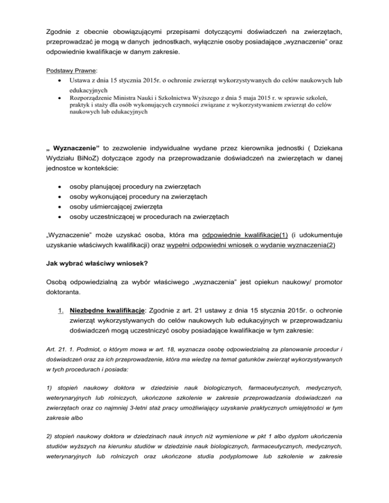 Zgodnie z obecnie obowiązującymi przepisami dotyczącymi doświadczeń na zwierzętach, przeprowadzać je mogą w danych jednostkach, wyłącznie osoby posiadające „wyznaczenie” oraz odpowiednie kwalifikacje w danym zakresie. Podstawy Prawne: Ustawa z dnia 15 stycznia 2015r. o ochronie zwierząt wykorzystywanych do celów naukowych lub edukacyjnych Rozporządzenie Ministra Nauki i Szkolnictwa Wyższego z dnia 5 maja 2015 r. w sprawie szkoleń, praktyk i staży dla osób wykonujących czynności związane z wykorzystywaniem zwierząt do celów naukowych lub edukacyjnych „ Wyznaczenie” to zezwolenie indywidualne wydane przez kierownika jednostki ( Dziekana Wydziału BiNoZ) dotyczące zgody na przeprowadzanie doświadczeń na zwierzętach w danej jednostce w kontekście: osoby planującej procedury na zwierzętach osoby wykonującej procedury na zwierzętach osoby uśmiercającej zwierzęta osoby uczestniczącej w procedurach na zwierzętach „Wyznaczenie” może uzyskać osoba, która ma odpowiednie kwalifikacje(1) (i udokumentuje uzyskanie właściwych kwalifikacji) oraz wypełni odpowiedni wniosek o wydanie wyznaczenia(2) Jak wybrać właściwy wniosek? Osobą odpowiedzialną za wybór właściwego „wyznaczenia” jest opiekun naukowy/ promotor doktoranta. 1. Niezbędne kwalifikacje: Zgodnie z art. 21 ustawy z dnia 15 stycznia 2015r. o ochronie zwierząt wykorzystywanych do celów naukowych lub edukacyjnych w przeprowadzaniu doświadczeń mogą uczestniczyć osoby posiadające kwalifikacje w tym zakresie: Art. 21. 1. Podmiot, o którym mowa w art. 18, wyznacza osobę odpowiedzialną za planowanie procedur i doświadczeń oraz za ich przeprowadzenie, która ma wiedzę na temat gatunków zwierząt wykorzystywanych w tych procedurach i posiada: 1) stopień naukowy doktora w dziedzinie nauk biologicznych, farmaceutycznych, medycznych, weterynaryjnych lub rolniczych, ukończone szkolenie w zakresie przeprowadzania doświadczeń na zwierzętach oraz co najmniej 3-letni staż pracy umożliwiający uzyskanie praktycznych umiejętności w tym zakresie albo 2) stopień naukowy doktora w dziedzinach nauk innych niż wymienione w pkt 1 albo dyplom ukończenia studiów wyższych na kierunku studiów w dziedzinie nauk biologicznych, farmaceutycznych, medycznych, weterynaryjnych lub rolniczych oraz ukończone studia podyplomowe lub szkolenie w zakresie przeprowadzania doświadczeń na zwierzętach, a także co najmniej 4-letni staż pracy umożliwiający uzyskanie praktycznych umiejętności w tym zakresie. 2. Podmiot, o którym mowa w art. 18, wyznacza do wykonywania procedur osobę, która posiada: 1) dyplom ukończenia studiów wyższych na kierunku studiów w dziedzinie nauk biologicznych, farmaceutycznych, medycznych, weterynaryjnych lub rolniczych i ukończone szkolenie w zakresie przeprowadzania doświadczeń na zwierzętach oraz która co najmniej przez rok uczestniczyła w wykonywaniu procedur pod nadzorem osoby wyznaczonej przez użytkownika i uzyskała praktyczne umiejętności w tym zakresie albo 2) dyplom ukończenia studiów wyższych na kierunku studiów innym niż wymieniony w pkt 1 i ukończone studia podyplomowe lub szkolenie w zakresie przeprowadzania doświadczeń na zwierzętach oraz która co najmniej przez 2 lata uczestniczyła w wykonywaniu procedur pod nadzorem osoby wyznaczonej przez użytkownika i uzyskała praktyczne umiejętności w tym zakresie, albo 3) wykształcenie średnie i przygotowanie zawodowe zgodne z zakresem wykonywanych procedur oraz która co najmniej przez 2 lata uczestniczyła w wykonywaniu procedur pod nadzorem osoby wyznaczonej przez użytkownika i uzyskała praktyczne umiejętności w tym zakresie. 3. Podmiot, o którym mowa w art. 18, wyznacza do: 1) uczestniczenia w wykonywaniu procedur osobę, która: a) jest studentem lub b) wykonuje czynności techniczne związane z obsługą zwierząt – i odbyła szkolenie w zakresie postępowania ze zwierzętami przeznaczonymi do wykorzystania lub wykorzystywanymi w procedurach; 2) uśmiercania zwierząt wykorzystywanych w procedurze osobę, która: a) ma wykształcenie co najmniej zasadnicze zawodowe lub średnie, b) odbyła szkolenie w zakresie metod uśmiercania zwierząt wykorzystywanych w procedurach, c) odbyła 3-miesięczną praktykę w zakresie wykonywania czynności związanych z uśmiercaniem zwierząt wykorzystywanych w procedurach, pod nadzorem lekarza weterynarii lub osoby, która przeprowadza uśmiercanie w ośrodku użytkownika. 2. Wnioski o wydanie wyznaczenia dostępne są na stronie Wydziału BiNoZ: http://www.binoz.uj.edu.pl/doswiadczenia-na-zwierzetach Szkolenia zgodne z wymogami ministerialnymi przeprowadza firma PolLASA (http://pollasa.pl/kursy/kursy-pollasa/ ) Preferowany kontakt mailowy mail: [email protected] Informacja o terminach szkoleń przeprowadzanych w Krakowie będzie w miarę możliwości umieszczana na stronie Wydziału Biologii i Nauk o Ziemi w zakładce „Nauka”. Koszty związane ze szkoleniami ponoszą Instytuty. Dane kontaktowe osoby udzielającej szczegółowych informacji na Wydz. BiNoZ UJ: mgr Małgorzata Plucińska-Pająk Dziekanat Wydz. BiNoZ UJ [email protected] tel. 012 664 67 55