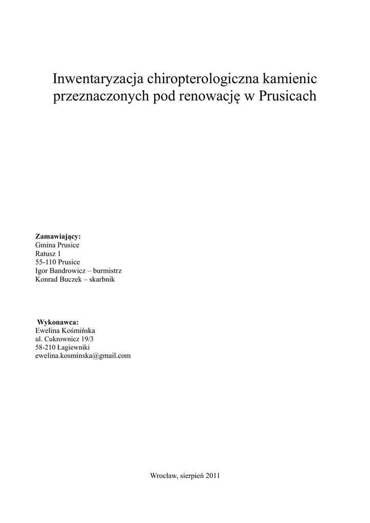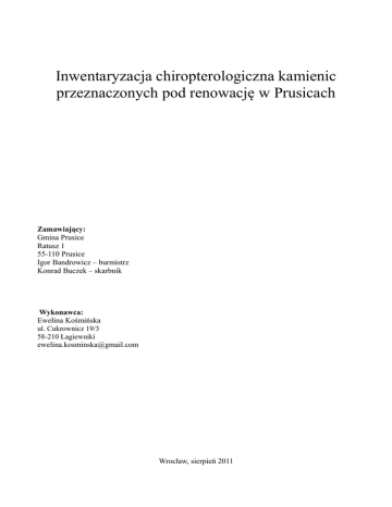 Inwentaryzacja chiropterologiczna kamienic przeznaczonych pod renowację w Prusicach Zamawiający: Gmina Prusice Ratusz 1 55-110 Prusice Igor Bandrowicz – burmistrz Konrad Buczek – skarbnik Wykonawca: Ewelina Kośmińska ul. Cukrownicz 19/3 58-210 Łagiewniki [email protected] Wrocław, sierpień 2011 Niniejsze opracowanie zawiera inwentaryzację chiropterologiczną i ocenę oddziaływania na nietoperze planowanej renowacji kamienic przy ulicy Wrocławskiej 5, Rynek 27, Rynek 29, Rynek 32, Rynek 34, Powstańców Śląskich 1. Przedmiotem oceny jest plan renowacji, który wiąże się ze zmianą dostępności kryjówek nietoperzy. W celu ograniczenia wpływu inwestycji na nietoperze zaproponowano działania minimalizujące. Opracowanie sporządzono na podstawie wizji terenowej. Wstęp W Polsce występuje 25 gatunków nietoperzy. Wszystkie podlegają ochronie ścisłej na podstawie Rozporządzenia Ministra Środowiska w sprawie gatunków dziko występujących zwierząt objętych ochroną z dnia 28 września 2004 r. (Dziennik Ustaw Nr 220, Poz. 2237), zapisu do w Ustawy o Ochronie Przyrody z dnia 16 kwietnia 2004 r. (Dziennik Ustaw 04.92.880 z późniejszymi zmianami). Oznacza to zakaz zabijania, chwytania i płoszenia nietoperzy oraz niszczenia ich schronień. Osiem gatunków nietoperzy wpisanych jest do „Polskiej czerwonej księgi zwierząt” podkowiec duży Rhinolophus ferrumequinum , podkowiec mały Rhinolophus hipposideros , nocek Bechsteina Myotis bechsteinii, nocek łydkowłosy Myotis dasycneme, nocek orzęsiony Myotis emerginatus, mroczek posrebrzany Vespertilio murinus, mroczek pozłocisty Eptesicus nilssonii, borowiaczek Nyctalus leisleri (Głowaciński 2001). Na „Czerwonej liście zwierząt ginących w Polsce” (Głowaciński 2002) poza wymienionymi powyżej znajduje się jeszcze mopek Barbasella barbastellus. Nietoperze znajdują się pod ochroną także na podstawie prawa międzynarodowego (z udziałem Polski) - Konwencja Berneńska, Konwencja Bońska, Porozumienie o Ochronie Europejskich Populacji Nietoperzy EUROBATS, Dyrektywa Siedliskowa Unii Europejskiej. Gatunki wymagające wyznaczenia specjalnych obszarów ochrony zostały wymienione w Załączniku II Dyrektywy Siedliskowej Unii Europejskiej - podkowiec duży, podkowiec mały, nocek duży, nocek Bechsteina, nocek orzęsiony, nocek łydkowłosy i mopek. Wg klasyfikacji IUCN posiadają one status najbardziej narażonych na wyginięcie (VU) nietoperzy w Europie. Pozostałe wymienione są w Załączniku IV Dyrektywy Siedliskowej, jako wymagające ścisłej ochrony prawnej. Ochrona nietoperzy opiera się głównie na ochronie miejsc ich występowania – żerowisk, kryjówek, korytarzy migracyjnych. Wszelkie przedsięwzięcia ingerujące w środowisko mogą mieć negatywny w pływ na nietoperze, np. poprzez fragmentację środowiska, zaburzenie tras migracji dobowych i sezonowych, płoszenie (hałas i światła, penetracja schronień), pozbawianie żerowisk, kryjówek, lub bezpośrednie zagrożenie w kontakcie z ludźmi. Nietoperze w zależności od fazy cyklu rocznego wykorzystują różne typy siedlisk i kryjówek. Zimą, nietoperze zapadają w sen zimowy, zwany hibernacją. Schronienia wybierane na czas zimowania charakteryzują się utrzymywaniem stałej, niskiej, ale dodatniej temperatury oraz wysokiej wilgotności. Zwykle są to podziemia, ale także szczeliny w budynkach i dziuple w grubych drzewach (Ransome 1990, Altringham 1996). Okres hibernacji trwa, zależnie od gatunku, około 4-5 miesięcy od października/listopada do marca/kwietnia. W tym czasie nietoperze korzystają z zapasów energetycznych zgromadzonych jedynie w postaci tkanki tłuszczowej. Wybudzenia z hibernacji pochłaniają duże ilości energii, odpowiadające nawet dwu tygodniom zimowego odrętwienia. Zbyt częste wybudzenia (np. z powodu obecności ludzi w zimowisku), prowadzą do wcześniejszego zużycia tkanki tłuszczowej i do bardzo złej kondycji lub nawet śmierci osobnika. Z tego też względu istotne znaczenie ma odpowiedni mikroklimat panujący w zimowisku i spokój. Wiosną samice grupują się w kolonie rozrodcze, w których przechodzą ciążę, rodzą i wychowują młode. Młode rodzą się na przełomie czerwca i lipca, a po okresie 2-6 tygodni są zdolne do lotu, nieco później usamodzielniają się. Kolonie rozrodcze mogą liczyć od kilku do kilku tysięcy osobników. Kryjówki wybierane na czas rozrodu muszą zapewnić zwierzętom szczególnie bezpieczeństwo i odpowiednie warunki termiczne. Krajowe gatunki nietoperzy zajmują różnorodne kryjówki, jak dziuple drzew, szczeliny i strychy budynków, szczeliny mostów, rzadziej podziemia. W okresie godów i migracji nietoperze najczęściej korzystają z drobnych kryjówek jak dziuple, budki, szczeliny budynków, ale również strychy. Potencjalne zagrożenia inwestycją: Nietoperze szczególnie narażone są w czasie kiedy ich mobilność jest ograniczona – w okresie rozrodu, kiedy młode nie potrafią jeszcze latać oraz w okresie hibernacji. – Uszczelnienie dachu w okresie przebywania kolonii rozrodczej na strychu budynku może nie tylko uniemożliwić dostęp do kryjówki, ale także uwięzić nietoperze, a szczególnie nielotne jeszcze młode. – Wykorzystanie toksycznych środków konserwujących drewna może spowodować zatrucie całej kolonii oraz niemożność zasiedlenia kryjówki przez wiele lat. – Prowadzenie prac remontowych w czasie hibernacji, może prowadzić do wybudzenia zwierząt, co stanowi zagrożenie z punktu widzenia kurczenia ich zasobów energetycznych. Konieczność zmiany kryjówki w czasie zimy również wiąże się z ryzykiem. – Uszczelnianie miejsc hibernacji nietoperzy wiąże się z uszczuplaniem stanowisk tych rzadkich zwierząt, a prace prowadzone w czasie przebywania w nich nietoperzy mogą prowadzić do bezpośredniego zagrożenia ich życia przez ich uwięzienie, lub mechaniczne uszkodzenie ukrytych w szczelinach zwierząt. W