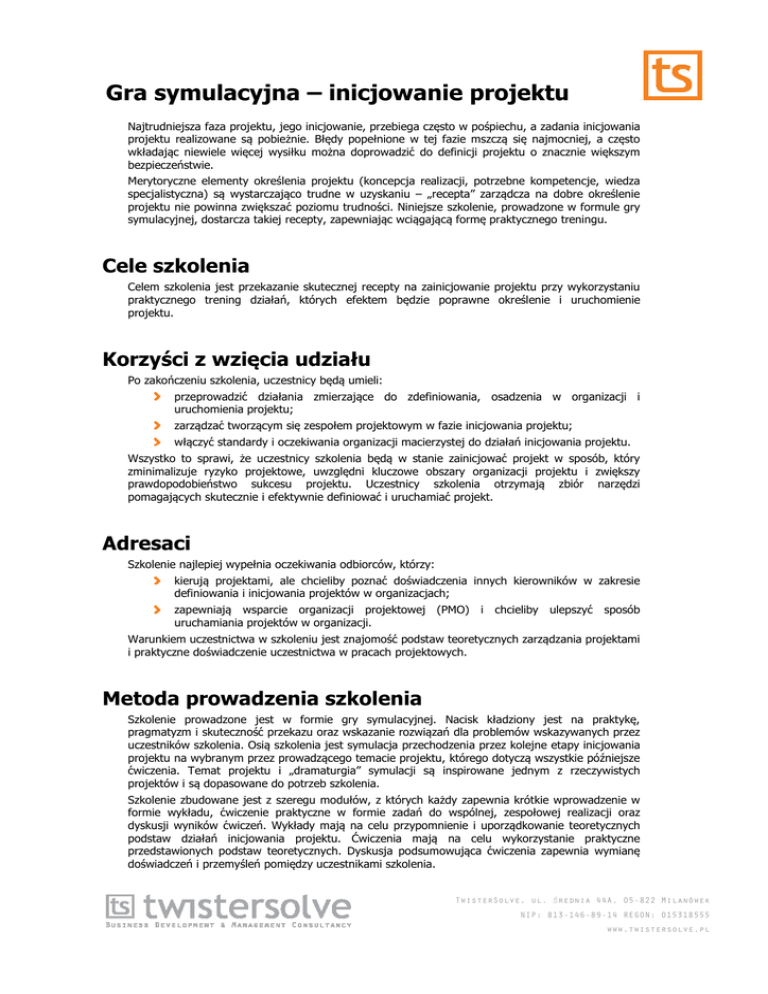 Gra symulacyjna – inicjowanie projektu Najtrudniejsza faza projektu, jego inicjowanie, przebiega często w pośpiechu, a zadania inicjowania projektu realizowane są pobieżnie. Błędy popełnione w tej fazie mszczą się najmocniej, a często wkładając niewiele więcej wysiłku można doprowadzić do definicji projektu o znacznie większym bezpieczeństwie. Merytoryczne elementy określenia projektu (koncepcja realizacji, potrzebne kompetencje, wiedza specjalistyczna) są wystarczająco trudne w uzyskaniu – „recepta” zarządcza na dobre określenie projektu nie powinna zwiększać poziomu trudności. Niniejsze szkolenie, prowadzone w formule gry symulacyjnej, dostarcza takiej recepty, zapewniając wciągającą formę praktycznego treningu. Cele szkolenia Celem szkolenia jest przekazanie skutecznej recepty na zainicjowanie projektu przy wykorzystaniu praktycznego trening działań, których efektem będzie poprawne określenie i uruchomienie projektu. Korzyści z wzięcia udziału Po zakończeniu szkolenia, uczestnicy będą umieli: przeprowadzić działania zmierzające do zdefiniowania, osadzenia w organizacji i uruchomienia projektu; zarządzać tworzącym się zespołem projektowym w fazie inicjowania projektu; włączyć standardy i oczekiwania organizacji macierzystej do działań inicjowania projektu. Wszystko to sprawi, że uczestnicy szkolenia będą w stanie zainicjować projekt w sposób, który zminimalizuje ryzyko projektowe, uwzględni kluczowe obszary organizacji projektu i zwiększy prawdopodobieństwo sukcesu projektu. Uczestnicy szkolenia otrzymają zbiór narzędzi pomagających skutecznie i efektywnie definiować i uruchamiać projekt. Adresaci Szkolenie najlepiej wypełnia oczekiwania odbiorców, którzy: kierują projektami, ale chcieliby poznać doświadczenia innych kierowników w zakresie definiowania i inicjowania projektów w organizacjach; zapewniają wsparcie organizacji projektowej (PMO) i chcieliby ulepszyć sposób uruchamiania projektów w organizacji. Warunkiem uczestnictwa w szkoleniu jest znajomość podstaw teoretycznych zarządzania projektami i praktyczne doświadczenie uczestnictwa w pracach projektowych. Metoda prowadzenia szkolenia Szkolenie prowadzone jest w formie gry symulacyjnej. Nacisk kładziony jest na praktykę, pragmatyzm i skuteczność przekazu oraz wskazanie rozwiązań dla problemów wskazywanych przez uczestników szkolenia. Osią szkolenia jest symulacja przechodzenia przez kolejne etapy inicjowania projektu na wybranym przez prowadzącego temacie projektu, którego dotyczą wszystkie późniejsze ćwiczenia. Temat projektu i „dramaturgia” symulacji są inspirowane jednym z rzeczywistych projektów i są dopasowane do potrzeb szkolenia. Szkolenie zbudowane jest z szeregu modułów, z których każdy zapewnia krótkie wprowadzenie w formie wykładu, ćwiczenie praktyczne w formie zadań do wspólnej, zespołowej realizacji oraz dyskusji wyników ćwiczeń. Wykłady mają na celu przypomnienie i uporządkowanie teoretycznych podstaw działań inicjowania projektu. Ćwiczenia mają na celu wykorzystanie praktyczne przedstawionych podstaw teoretycznych. Dyskusja podsumowująca ćwiczenia zapewnia wymianę doświadczeń i przemyśleń pomiędzy uczestnikami szkolenia. TwisterSolve, ul. Średnia 44A, 05-822 Milanówek NIP: 813-146-89-14 REGON: 015318555 www.twistersolve.pl Tytuł szkolenia: Gra symulacyjna – inicjowanie projektu Autor: Sebastian Konkol, TwisterSolve 2/2 Zakres szkolenia Tematyka szkolenia: Praktyczna ścieżka „definiowania” projektu. Sekwencja dochodzenie do określenia projektu i uruchomienia go. działań optymalizująca Zadania do wykonania i efekty do uzyskania we wszystkich obszarach określenia projektu, wraz z praktycznymi receptami i narzędziami ich opracowania. Wskazówki w jaki sposób i do jakich zadań angażować tworzący się zespół projektowy, sponsora projektu i komitet sterujący oraz kierownictwo organizacji macierzystej. Rzeczy bardziej i mniej ważne. Co musi być wiadomo, co można założyć, a co może pozostać w stanie kontrolowanej nieokreśloności. Techniki podstawowe wykorzystywane w fazie inicjowania projektu. Techniki zaawansowane (np. Monte Carlo, analiza wrażliwości na założenia, bufory ryzyka). Rola standardów. Obowiązkowa dokumentacja projektowa, proces zatwierdzenia projektu, zapewnienie ludzi i zasobów dla projektu. Płynna integracja organizacji projektu z możliwościami, uwarunkowaniami i ograniczeniami organizacji macierzystej. Warsztat komunikacyjny kierownika projektu konieczny na etapie inicjowania projektu. Negocjacje, wywieranie wpływu, uzgodnienia. Czas trwania: 3 dni Liczba uczestników: 8-12 osób Przebieg szkolenia: Dzień pierwszy: repetytorium działań podejmowanych w fazie inicjowania projektu, przedstawienie reguł gry symulacyjnej oraz studium przypadku symulacyjnego; gra symulacyjna dla opracowania koncepcji realizacji projektu; Dzień drugi: podsumowanie wyników poprzedniego dnia, dyskusja i ustalenie wspólnego stanowiska dla dalszej części prac; gra symulacyjna dotycząca opracowania koncepcji zarządzania realizacją projektu; Dzień trzeci: podsumowanie wyników poprzedniego dnia, dyskusja i ustalenie wspólnego stanowiska dla dalszej części prac; gra symulacyjna dotycząca uzgadniania, zatwierdzania i uruchomienia realizacji projektu. Formułą gry symulacyjnej zapewnia realistyczne podejście do stawianych zadań, a dyskusje prowadzone pomiędzy uczestnikami zapewniają najskuteczniejszą formę wymiany wniosków i doświadczeń. Uczestnicy nie raz zostaną zaskoczeni przebiegiem zdarzeń. Trener: Sebastian Konkol Absolwent Instytutu Telekomunikacji Politechniki Warszawskiej oraz zarządzania projektami w George Washington University. Prowadził studia doktoranckie na SWPS (psychologia społeczna, analiza sieci społecznych) i Instytucie Badań Systemowych PAN (kontrola przeciążeń w sieci). Jest wieloletnim praktyki