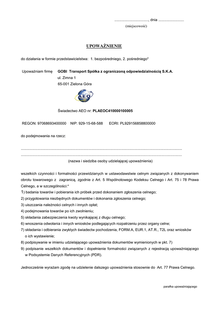 ................................., dnia ......................... (miejscowość) UPOWAŻNIENIE do działania w formie przedstawicielstwa: 1. bezpośredniego, 2. pośredniego* Upoważniam firmę GOBI Transport Spółka z ograniczoną odpowiedzialnością S.K.A. ul. Zimna 1 65-001 Zielona Góra Świadectwo AEO nr: PLAEOC410000100005 REGON: 97068693400000 NIP: 929-15-68-588 EORI: PL929156858800000 do podejmowania na rzecz: ............................................................................................................................................................. ............................................................................................................................................................. (nazwa i siedziba osoby udzielającej upoważnienia) wszelkich czynności i formalności przewidzianych w ustawodawstwie celnym związanych z dokonywaniem obrotu towarowego z zagranicą, zgodnie z Art. 5 Wspólnotowego Kodeksu Celnego i Art. 75 i 78 Prawa Celnego, a w szczególności:* 1) badania towarów i pobierania ich próbek przed dokonaniem zgłoszenia celnego; 2) przygotowania niezbędnych dokumentów i dokonania zgłoszenia celnego; 3) uiszczania należności celnych i innych opłat; 4) podejmowania towarów po ich zwolnieniu; 5) składania zabezpieczenia kwoty wynikającej z długu celnego; 6) wnoszenia odwołania i innych wniosków podlegających rozpatrzeniu przez organy celne; 7) składania i odbierania zwykłych świadectw pochodzenia, FORM.A, EUR.1, AT.R., T2L oraz wniosków o ich wystawienie; 8) podpisywanie w imieniu udzielającego upoważnienia dokumentów wymienionych w pkt. 7) 9) podpisanie wszelkich dokumentów i dopełnienie formalności związanych z rejestracją upoważniającego w Podsystemie Danych Referencyjnych (PDR). Jednocześnie wyrażam zgodę na udzielenie dalszego upoważnienia stosownie do Art. 77 Prawa Celnego. parafka upoważniającego Niniejsze upoważnienie ma charakter: * - stały - terminowy do dnia ........................... - jednorazowy Prawo do wykonywania działań objętych upoważnieniem przynależy do wszystkich agentów celnych zatrudnionych w GOBI Spółka z o.o. S.K.A. bez względu na zmiany kadrowe. W razie jakichkolwiek wątpliwości niniejsze upoważnienie należy interpretować rozszerzająco. ...................................................... Potwierdzenie przyjęcia upoważnienia : (stempel i podpis upoważniającego) ...................................................................................... (data i podpis agenta celnego działającego w imieniu upoważnionego) _______________ *Niepotrzebne skreślić Uwaga: Przy składaniu niniejszego upoważnienia należy uiścić stosowną opłatę skarbową. Dane osoby udzielającej upoważnienia : nr KRS / zaświadczenie o wpisie do ewidencji działalności gospodarczej : ................................ nr REGON .................................... nr NIP ........................................... nr EORI ……………………………. nazwa banku i nr konta ................................................................................................................. ....................................................................................................................................................... imię i nazwisko osoby do kontaktu z agencją celną…………………………………………………… numer telefonu osoby kontaktowej……………………………………………………………………… adres e-mail……………………………………………………………………………………………….. PROSZĘ O PRZESŁANIE NA PONIŻSZY ADRES ORYGINALNIE PODPISANEGO UPOWAŻNIENIA ORAZ DOŁĄCZENIE KOPII W/W DOKUMENTÓW ZAŁOŻYCIELSKICH FIRMY. GOBI Transport Sp. z o.o. S.K.A. ul. Zimna 1 65-001 Zielona Góra Oświadczam, iż dane dołączone do niniejszego upoważnienia są prawdziwe i zupełne. W razie zaistnienia jakiejkolwiek zmiany w tym zakresie zobowiązuję się do powiadomienia niezwłocznie o tym fakcie firmę GOBI Transport Spółka z o.o. S.K.A. .................................................... (podpis upoważniającego)