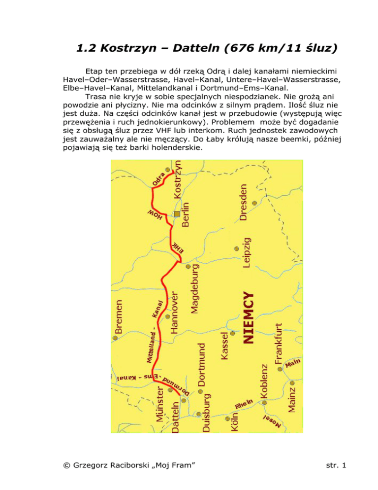 1.2 Kostrzyn – Datteln (676 km/11 śluz) Etap ten przebiega w dół rzeką Odrą i dalej kanałami niemieckimi Havel–Oder–Wasserstrasse, Havel–Kanal, Untere–Havel–Wasserstrasse, Elbe–Havel–Kanal, Mittelandkanal i Dortmund–Ems–Kanal. Trasa nie kryje w sobie specjalnych niespodzianek. Nie grożą ani powodzie ani płycizny. Nie ma odcinków z silnym prądem. Ilość śluz nie jest duża. Na części odcinków kanał jest w przebudowie (występują więc przewężenia i ruch jednokierunkowy). Problemem może być dogadanie się z obsługą śluz przez VHF lub interkom. Ruch jednostek zawodowych jest zauważalny ale nie męczący. Do Łaby królują nasze beemki, później pojawiają się też barki holenderskie. © Grzegorz Raciborski „Moj Fram” str. 1 1.2 Kostrzyn - Datteln 004,0 002,5 001,5 617,6 618 619 620 621 622 623 624 625 626 627 628 629 630 631 632,8 633 634 635,8 636 637 638 639 640 641 642 643 644 645 646 647 648 649 650 651,2 652 653 654 655 656 Warta, Cafe Canape, początek etapu PB – Kostrzyń, keja miejska, LB – klub wodny (płytko) PB – port handlowy PB – skręt w Odrę (km 617,6) Niemcy – obowiązujące przepisy Patenty i dokumenty rejestracyjne: obowiązują przepisy kraju bandery. Ubezpieczenie: nie jest wymagane. Opłaty za śluzowanie: brak. Są ona wnoszone ryczałtem przez niemieckie związki żeglarski i motorowodny. Urząd Żeglugi Śródlądowej Szczecin: 091 434 02 79 Reg. Zarz. Gosp. Wodnej Szczecin: 091 441 13 01 NW Słubice (km 584): 095 758 27 22 (VHF 74/10) NW Gzdowice (km 645): 091 414 53 84 (VHF 74/10) Wodowskaz Biała Góra (km 545,6): „0” 345, WWŻ 415 Wodowskaz Słubice (km 584,1): „0” 340, WWŻ 430 Wodowskaz Gozdowice (km 645,3): „0” 390, WWŻ 490 Biuletyn: www.pogodynka.pl/hydrobiuletyn.php LB – port jachtowy Kienitz (wodowskaz) W Niemczech na ogół można znaleźć przy śluzach miejsce na nocleg (ale zawsze należy pytać się obsługi śluzy). LB – port Gross–Neuendorf Niemieckie znaki świetlne regulujące ruch w śluzach (preferowany jest jednak wcześniejszy kontakt przez VHF lub Intercom) LB – przystań jachtowa koło mostu celnego (1 km poniżej mostu kolejowego) Między Odrą a Renem znajdziemy liczne kluby wodne, w których bez problemu możemy przenocować (za ok 1,2 Euro na 1 m dł. jachtu). Na kanałach są bezpłatne miejsca postojowe na 2 –3 jachty, oznaczone jako „SPORT”, „KLEINFAHRZEUGE”, „SPORTBOOTE”, „SPORTFAHRZEUGE”. © Grzegorz Raciborski „Moj Fram” str. 2 1.2 Kostrzyn - Datteln 657 658 659 660 661 662 663 664,8 665 666 667,0 093,6 092,7 091 090 089 088 087,0 086 085 084,6 083 082 081 080 079,0 078,2 077,9 076,5 075 074 073 072 071 70,2 069 068 067,4 066 065 064 063 062 W Niemczech należy zgłaszać radiem lub interkomem zamiar śluzowania. Podać, jaką śluzę się wywołuje, jakiej jednostki pływającej dotyczy zgłoszenie i czy śluzowanie ma odbyć się w górę czy w dół. Przykładowo dla pierwszej na trasie śluzy niemieckiej: „Schleuse Hohensaaten – Ost an Sportboot (bez nazwy)”. Po zgłoszeniu się obsługi podajemy: „Guten Tag. Polnisches Sportboot zu Tal (w górę byłoby „zu Berg”). Wann kann ich bitte schleusen?” LB – przystań jachtowa przy starej śluzie LB – w kanał do śluzy Hohensaaten – Ost, droga wodna Havel–Oder–Wasserstrasse (km 93,6) Havel–Oder–Wasserstrasse Śluza Hohensaaten – Ost, VHF 20, „zu Tal”. Za nią PB – kanał boczny Odry, przez śluzę Hohensaaten – West prowadzi w stronę Szczecina. Śluzy Hohensaaten–Ost oraz następna Lehnitz czynne w godz. 06 (w niedz. 07) do 22. Podnośnik Niederfinow czyny całą dobę. LB – port jachtowy Oderberg LB – odnoga Wriezener – Alte Oder Zagranicą nosimy własną flagę narodową na rufie: – na jej środku, – ew. z prawej strony, – w ostateczności z jej lewej strony. LB – stary kanał Finowkanal (12 śluz, 32 km) LB – miejsce oczekiwania jachtów przed podnośnikiem Podnośnik Niederfinow, VHF 22, „zu Tal”. PB – w basenie przed starą śluzą możliwość cumowania W Niemczech w zakresie zaopatrzenia w gaz propan/butan do kuchenek gazowych możemy liczyć w marketach na: – aluminiowe kartusze z butanem firmy Campingas, – butle metalowe Campingas (rzadko), – butle 11 kG (z gwintem jak polskie butle 11 kG), – butle 5 kG (z gwintem takim samym, jak butle 11 kG). Nie możemy liczyć na napełnienie polskiej butli w stacji rozlewu gazu. PB – nabrzeże do cumowania (LB – port Eberswalde). Cumować na noc na samym początku kei (wieczorem całe nabrzeże zapełnia się barkami – głównie polskimi) © Grzegorz Raciborski „Moj Fram” str. 3 1.2 Kostrzyn - Datteln 061 060 059 058 057 056 055,0 054,9 054,8 053 052 051 050,4 049 048 047 046 045 044 043 042 041 040,5 039 038 037,0 036 035,5 034 033 032 031 029,2 028,6 027 026,2 025 024,9 023 022,5 021,1 020,9 019 Zagranicą nosimy flagę kraju pobytu: – pod prawym salingiem, – ew. z prawej strony konstrukcji na światło masztowe, – ew. na dziobie, – w ostateczności na rufie NAD własną flagą narodową. LB LB PB LB – – – – przystań klubu wodnego nowoczesny port jachtowy Marienwerder ujście Werbellinkanal, LB – skrót do Finowkanal stary kanał Finowkanal (km 57,4) Miejsce postojowe przy kanale PB – droga wodna Obere–Havel–Wasserstrasse (km 43,95) LB – miejsce cumowania dla jachtów LB – miejsce cumowania dla jachtów LB – miejsce cumowania dla jachtów Śluza Lehnitz, VHF 18, „zu Tal”. Miejsca postojowe dla jachtów na dole ( 1,3 m) i górze ( 2,5 m) Na jeziorze Lehnitzsee, PB – przystań jachtowa (do 8 m dł.) PB – Oranienburger Havel, żeglowna na 2,75 km PB – jezioro Pinnower See (zakaz żeglugi motorowej) LB – starorzecze, port jachtowy PB – Oranienburger Kanal (b. Havel–Oder–Wasserstrasse) © Grzegorz Raciborski „Moj Fram” str. 4 1.2 Kostrzyn - Datteln 018,4 017 016,2 015,2 014 013 012,5 011 10,45 000,0 00
