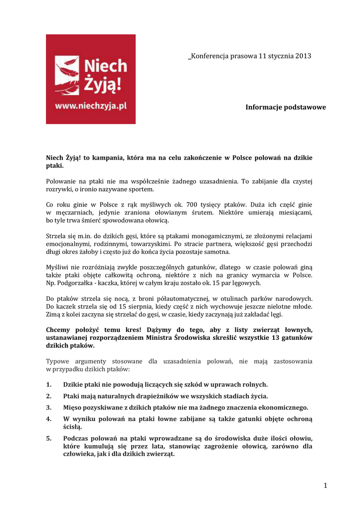 Konferencja prasowa 11 stycznia 2013 Informacje podstawowe Niech Żyją! to kampania, która ma na celu zakończenie w Polsce polowań na dzikie ptaki. Polowanie na ptaki nie ma współcześnie żadnego uzasadnienia. To zabijanie dla czystej rozrywki, o ironio nazywane sportem. Co roku ginie w Polsce z rąk myśliwych ok. 700 tysięcy ptaków. Duża ich część ginie w męczarniach, jedynie zraniona ołowianym śrutem. Niektóre umierają miesiącami, bo tyle trwa śmierć spowodowana ołowicą. Strzela się m.in. do dzikich gęsi, które są ptakami monogamicznymi, ze złożonymi relacjami emocjonalnymi, rodzinnymi, towarzyskimi. Po stracie partnera, większość gęsi przechodzi długi okres żałoby i często już do końca życia pozostaje samotna. Myśliwi nie rozróżniają zwykle poszczególnych gatunków, dlatego w czasie polowań giną także ptaki objęte całkowitą ochroną, niektóre z nich na granicy wymarcia w Polsce. Np. Podgorzałka - kaczka, której w całym kraju zostało ok. 15 par lęgowych. Do ptaków strzela się nocą, z broni półautomatycznej, w otulinach parków narodowych. Do kaczek strzela się od 15 sierpnia, kiedy część z nich wychowuje jeszcze nielotne młode. Zimą z kolei zaczyna się strzelać do gęsi, w czasie, kiedy zaczynają już zakładać lęgi. Chcemy położyć temu kres! Dążymy do tego, aby z listy zwierząt łownych, ustanawianej rozporządzeniem Ministra Środowiska skreślić wszystkie 13 gatunków dzikich ptaków. Typowe argumenty stosowane dla uzasadnienia polowań, nie mają zastosowania w przypadku dzikich ptaków: 1. Dzikie ptaki nie powodują liczących się szkód w uprawach rolnych. 2. Ptaki mają naturalnych drapieżników we wszyskich stadiach życia. 3. Mięso pozyskiwane z dzikich ptaków nie ma żadnego znaczenia ekonomicznego. 4. W wyniku polowań na ptaki łowne zabijane są także gatunki objęte ochroną ścisłą. 5. Podczas polowań na ptaki wprowadzane są do środowiska duże ilości ołowiu, które kumulują się przez lata, stanowiąc zagrożenie ołowicą, zarówno dla człowieka, jak i dla dzikich zwierząt. 1 Wg przybliżonych szacunków co roku w Polsce w wyniku wszystkich polowań wprowadzonych zostaje do środowiska od 300 do 600 ton ołowiu – jednego z najbardziej toksycznych pierwiastków. Dla porównania, cały polski przemysł i transport emitują łącznie ok. 350 ton ołowiu na rok. Ołów wystrzelony w postaci śrutu trafia do wód i gleby. Wg raportów Komisji Europejskiej, w miejscach polowań występuje olbrzymie stężenie ołowiu. Stwierdzano występowanie do 2 mln śrucin ołowianych na hektar oraz do 400 śrucin ołowianych na 1 metr kwadratowy. Skażenie ołowiem powoduje śmierć, problemy neurologiczne i immunologiczne. Wg badań naukowych prowadzonych w innych krajach, udział ptaków postrzelonych przez myśliwych wynosi 20%-30% całej populacji. Dla przykładu, badania europejskie dowodzą, że w wyniku strzałów oddanych przez myśliwych, rannych jest średnio 25% wszystkich gęsi jednorocznych i 36% starszych gęsi. W Polsce na dzikie ptaki poluje się na obszarach Natura2000, wzdłuż granic parków narodowych, w otulinach tych parków i na obszarach zgłoszonych do międzynarodowej konwencji Ramsar jako ostoje ptaków. Z jednej więc strona Polska podejmuje wielkim wysiłkiem działania mające na celu ochronę dzikiej przyrody i powstrzymanie zanikania różnorodności bilogicznej, z drugiej strony, pozwala, aby marginalna statystycznie grupa osób uprawiała ‘hobby’, którego konsekwencje niweczą efekty tych wysiłków. Zgodnie z informacją zawartą w Krajowej Strategii Róźnorodności Biologicznej “w efekcie pośrednich i bezpośrednich oddziaływań na przyrodę w Polsce ustąpiło lub wyginęło 10 gatunków ptaków wg stanu na rok 2001.” Polowania na ptaki przyczyniają się do wzrostu zagrożenia wyginięciem dalszych gatunków podlegających ochronie ścisłej. Na przykład: u większości populacji gatunków ptaków mokradłowych zauważalny jest trend spadkowy. Z szesnastu gatunków, dla których wyniki są istotne, aż u 12 zaznaczone jest obniżenie liczebności. Przykładami takich gatunków jest krakwa – kaczka bardzo podobna do popularnie występującej krzyżówki (gatunku łownego): Populacja krakwy w ciągu zaledwie 5 lat (2007-2011) spadła o połowę. (źródło: GIOŚ) Polowanie na ptaki to zabijanie dla czystej przyjemności i rozrywki. Rozrywka ta dostępna jest w Polsce dla ok. 100 tys. członków Polskiego Związku Łowieckiego. Tymczasem środowisko i dzika przyroda jest dobrem ogólnonarodowym, podlegającym konstytucyjnej ochronie. Z dobra tego ma prawo korzystać w sposób niezakłócony 38,5 mln obywateli naszego kraju. Na wielu obszarach, gdzie prowadzi się polowania na ptaki, takich jak ostoje ptaków, obszary Natura2000, czy otuliny Parków Narodowych, polowania te niweczą skutki działań ochronnych, w tym kosztownych zabiegów ochrony czynnej. Państwo Polskie oraz Komisja Europejska, czyli pośrednio wszyscy Polacy płacący podatki, ponoszą olbrzymie nakłady na ochronę przyrody i utrzymanie różnorodności biologicznej, a jednocześnie wąska grupa myśliwych, stanowiąca zaledwie 0.25% mieszkańców kraju, dziesiątkuje zasoby przyrodnicze, w tym populacje dzikich ptaków, a także wprowadza do środowiska – głównie wód – niekontrolowane ilości toksycznego ołowiu. www.niechzyja.pl Facebook: http://www.facebook.com/niech.zyja YouTube: http://www.youtube.com/channel/UChocDwTHlcFR-dnyBeAX4yQ Vimeo: http://vimeo.com/user14262151 2
