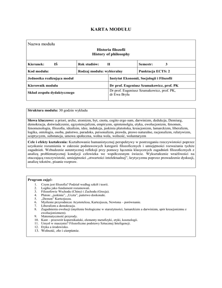KARTA MODUŁU Nazwa modułu Historia filozofii History of philosophy Kierunek: IŚ Kod modułu: Rok studiów: II Rodzaj modułu: wybieralny Semestr: 3 Punktacja ECTS: 2 Jednostka realizująca moduł Instytut Ekonomii, Socjologii i Filozofii Kierownik modułu Dr prof. Eugeniusz Szumakowicz, prof. PK Dr prof. Eugeniusz Szumakowicz, prof. PK, dr Ewa Bryła Skład zespołu dydaktycznego Struktura modułu: 30 godzin wykładu Słowa kluczowe: a priori, arche, atomizm, byt, cnota, cogito ergo sum, darwinizm, dedukcja, Demiurg, demokracja, doświadczenie, egzystencjalizm, empiryzm, epistemolgia, etyka, ewolucjonizm, fenomen, fenomenologia, filozofia, idealizm, idee, indukcja, jaskinia platońska, kreacjonizm, lamarckizm, liberalizm, logika, ontologia, osoba, państwo, paradoks, personalizm, prawda, prawo naturalne, racjonalizm, relatywizm, sceptycyzm, substancja, umowa społeczna, wolna wola, wolność, woluntaryzm Cele i efekty kształcenia: Kształtowanie humanistycznej perspektywy w postrzeganiu rzeczywistości poprzez uzyskanie rozumienia w zakresie podstawowych kategorii filozoficznych i umiejętności rozważania tychże zagadnień. Wzbudzenie autentycznej refleksji przy pomocy łączenia klasycznych zagadnień filozoficznych z analizą problematycznej kondycji człowieka we współczesnym świecie. Wykształcenie wrażliwości na otaczającą rzeczywistość, umiejętności „otwartości intelektualnej”, krytycyzmu poprzez prowadzenie dyskusji, analizę tekstów, pisanie rozpraw. Program zajęć: 1. 2. 3. 4. 5. 6. 7. 8. Czym jest filozofia? Podział według szkół i teorii. Logika jako fundament rozumowań. Filozofowie Wschodu (Chiny) i Zachodu (Grecja). Platon: „jaskinia”, „Uczta”, państwo doskonałe. „Demon” Kartezjusza. Myślenie przyrodnicze Arystotelesa, Kartezjusza, Newtona – porównanie. Liberalizm a demokracja. Zagadnienia ewolucji (myślenie biologiczne w starożytności, lamarckizm a darwinizm, spór kreacjonizmu z ewolucjonizmem). 9. Matematyczność przyrody. 10. Kant – przewrót kopernikański, elementy metafizyki, etyki, kosmologii. 11. Umysł w maszynie? Filozoficzne podstawy Sztucznej Inteligencji. 12. Etyka a środowisko. 13. Wolność, zło i cierpienie. Moduły, których zaliczenie warunkuje podjęcie przedmiotowego kursu: Forma i tryb zaliczenia modułu: rozprawa Podręczniki, skrypty, pomoce dydaktyczne: W. Tatarkiewicz, Historia filozofii, t.1-3,Warszawa 2005 M. Hollis, Filozofia, Znak 1998 M. Heller, Filozofia świata, Znak, 1992 E. Żarnecka-Biały, Mała logika, Wyd.UJ, Kraków 1993 Matematyczność przyrody, Heller, Życiński (red.),OBI, Kraków 1992 Drogi współczesnej filozofii, Siemek (red.) Czytelnik, Warszawa 1978 Platon, Państwo, Uczta, Wyd.Antyk, Kęty 1997 Arystoteles, Dzieła zebrane. PWN, Warszawa 1992 Kartezjusz Medytacje o filozofii pierwszej, Wydawnictwo Antyk, Kęty 2001 Kant, Krytyka rozumu czystego, Krytyka rozumu praktycznego, Antyk, Kęty 2001 Turing, Maszyny liczące a inteligencja, Aletheia, Warszawa 1995
