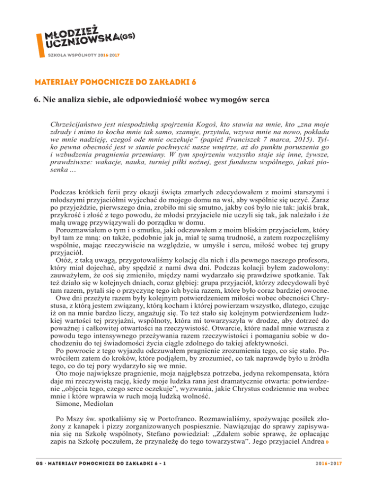 MATERIAŁY POMOCNICZE DO ZAKŁADKI 6 6. Nie analiza siebie, ale odpowiedniość wobec wymogów serca Chrześcijaństwo jest niespodzinką spojrzenia Kogoś, kto stawia na mnie, kto „zna moje zdrady i mimo to kocha mnie tak samo, szanuje, przytula, wzywa mnie na nowo, pokłada we mnie nadzieję, czegoś ode mnie oczekuje” (papież Franciszek 7 marca, 2015). Tylko pewna obecność jest w stanie pochwycić nasze wnętrze, aż do punktu poruszenia go i wzbudzenia pragnienia przemiany. W tym spojrzeniu wszystko staje się inne, żywsze, prawdziwsze: wakacje, nauka, turniej piłki nożnej, gest funduszu wspólnego, jakaś piosenka ... Podczas krótkich ferii przy okazji święta zmarłych zdecydowałem z moimi starszymi i młodszymi przyjaciółmi wyjechać do mojego domu na wsi, aby wspólnie się uczyć. Zaraz po przyjeździe, pierwszego dnia, zrobiło mi się smutno, jakby coś było nie tak: jakiś brak, przykrość i złość z tego powodu, że młodsi przyjaciele nie uczyli się tak, jak należało i że małą uwagę przywiązywali do porządku w domu. Porozmawiałem o tym i o smutku, jaki odczuwałem z moim bliskim przyjacielem, który był tam ze mną: on także, podobnie jak ja, miał tę samą trudność, a zatem rozpoczęliśmy wspólnie, mając rzeczywiście na względzie, w umyśle i sercu, miłość wobec tej grupy przyjaciół. Otóż, z taką uwagą, przygotowaliśmy kolację dla nich i dla pewnego naszego profesora, który miał dojechać, aby spędzić z nami dwa dni. Podczas kolacji byłem zadowolony: zauważyłem, że coś się zmieniło, między nami wydarzało się prawdziwe spotkanie. Tak też działo się w kolejnych dniach, coraz głębiej: grupa przyjaciół, którzy zdecydowali być tam razem, pytali się o przyczynę tego ich bycia razem, które było coraz bardziej owocne. Owe dni przeżyte razem były kolejnym potwierdzeniem miłości wobec obecności Chrystusa, z którą jestem związany, którą kocham i której powierzam wszystko, dlatego, czując iż on na mnie bardzo liczy, angażuję się. To też stało się kolejnym potwierdzeniem ludzkiej wartości tej przyjaźni, wspólnoty, która mi towarzyszyła w drodze, aby dotrzeć do poważnej i całkowitej otwartości na rzeczywistość. Otwarcie, które nadal mnie wzrusza z powodu tego intensywnego przeżywania razem rzeczywistości i pomaganiu sobie w dochodzeniu do tej świadomości życia ciągle zdolnego do takiej afektywności. Po powrocie z tego wyjazdu odczuwałem pragnienie zrozumienia tego, co się stało. Powróciłem zatem do kroków, które podjąłem, by zrozumieć, co tak naprawdę było u źródła tego, co do tej pory wydarzyło się we mnie. Oto moje największe pragnienie, moja najgłębsza potrzeba, jedyna rekompensata, która daje mi rzeczywistą rację, kiedy moje ludzka rana jest dramatycznie otwarta: potwierdzenie „objęcia tego, czego serce oczekuje”, wyzwania, jakie Chrystus codziennie ma wobec mnie i które wprawia w ruch moją ludzką wolność. Simone, Mediolan Po Mszy św. spotkaliśmy się w Portofranco. Rozmawialiśmy, spożywając posiłek złożony z kanapek i pizzy zorganizowanych pospiesznie. Nawiązując do sprawy zapisywania się na Szkołę wspólnoty, Stefano powiedział: „Zdałem sobie sprawę, że opłacając zapis na Szkołę poczułem, że przynależę do tego towarzystwa”. Jego przyjaciel Andrea G S · M AT E R I A ŁY P O M O C N I C Z E D O Z A K Ł A D K I 6 - 1 2 0 1 6 -2 0 1 7 Materiały pomocnicze do zakładkiå 6. Nie analiza siebie, ale odpowiedniość wobec wymogów serca podkreślił, że dla niego ta wspólnota jest wszystkim i zatem warto dać coś z własnych oszczędności. W tym momencie ksiądz Pigi zapytał: „Ale czy ja dzięki pieniądzom, które ofiaruję wspieram ruch, ponieważ jest mi sympatyczny albo dlatego, że oddaję mu życie?”. Guglielmo uciął krótko: „Dzięki temu zapisowi ja w pełni się angażuję. Za tym idzie pragnienie, aby dać wszystko temu, co mi dał wszystko”. Ksiądz Pigi podsumował, nie zamykając problemu: „Niewiele osób czyni nas wolnymi w osądzaniu i patrzeniu na nasze pragnienia. Fundusz wspólny oraz zapisanie się na Szkołę wspólnoty na jakie pragnienie odpowiadają? Często myślimy, że świat jest niesprawiedliwy. Są tacy, którym zawsze wszystko się udaje oraz ci, którzy zawsze muszą ponosić konsekwencje. A zatem: czy kiedykolwiek nastanie sprawiedliwość? Uwaga: można sprawiedliwość zredukować do władzy, czyli do potwierdzania siebie, i w to wchodzi korzystanie z pieniędzy jako narzędzie do niszczenia innych. Fundusz wspólny natomiast przypomina ci, że pieniądze nie są narzędziem do potwierdzania siebie i że sprawiedliwość jest sprawiedliwością tylko wtedy, gdy dobro drugiego jest moim dobrem. Jak wielka i piękna odpowiedzialność jest nam dana! Ten mały gest służy temu, aby nas do tego wychowywać. Uczestnictwo w tym oznacza rozpoczęcie budowania i zbawiania świata”. Tommaso, Mediolan (z: Co robić, aby nie wegetować, Tracce.it) „Bohater Kung Fu Panda potrafił dokonywać niezwykłych rzeczy, ponieważ był wspierany przez fakt, iż mistrz Shifu stawia na niego, pomimo jego wad i niezdarności. Shifu widział w pandzie potencjał zwłaszcza w jego zaangażowaniu w pozornie najmniejsze rzeczy, ale których ona najbardziej pragnęła: ciasteczka. Podobnie Chrystus stawia na nas”. (https://www.youtube.com/watch?v=A7I7Qn2maz8 https://www.youtube.com/watch?v=1Hu-Vc0IG7A) Z takim przykładem zwrócił się do nas ksiądz Pigi podczas spotkania pytań 20 listopada, i z tym przykładem mogłem się utożsamić właśnie w tym tygodniu, kiedy znalazłem się jakby „zawieszony na wysokości trzech metrów”, nie mając czasu, by się nad tym zastanowić . W środę wieczorem oglądałem mecze w ramach Memoriału Cucciolo, turnieju piłki nożnej, który zorganizowałem ku pamięci mojego taty, który kiedyś, tak jak ja teraz, uczestniczył w przyjaźni 