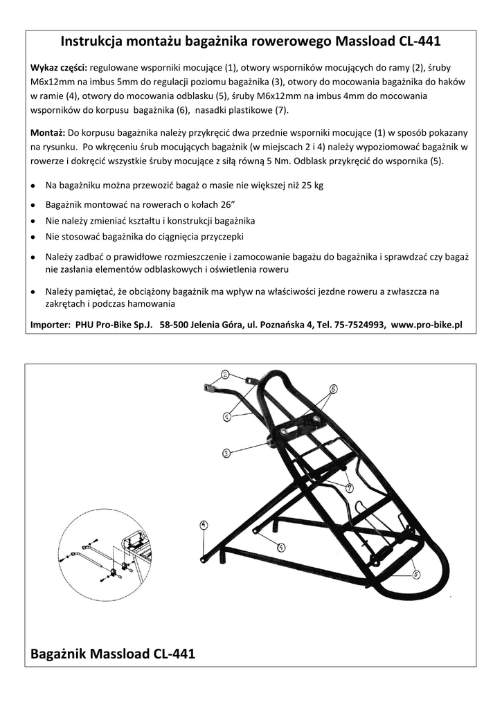 Instrukcja montażu bagażnika rowerowego Massload CL-441 Wykaz części: regulowane wsporniki mocujące (1), otwory wsporników mocujących do ramy (2), śruby M6x12mm na imbus 5mm do regulacji poziomu bagażnika (3), otwory do mocowania bagażnika do haków w ramie (4), otwory do mocowania odblasku (5), śruby M6x12mm na imbus 4mm do mocowania wsporników do korpusu bagażnika (6), nasadki plastikowe (7). Montaż: Do korpusu bagażnika należy przykręcić dwa przednie wsporniki mocujące (1) w sposób pokazany na rysunku. Po wkręceniu śrub mocujących bagażnik (w miejscach 2 i 4) należy wypoziomować bagażnik w rowerze i dokręcić wszystkie śruby mocujące z siłą równą 5 Nm. Odblask przykręcić do wspornika (5). Na bagażniku można przewozić bagaż o masie nie większej niż 25 kg Bagażnik montować na rowerach o kołach 26” Nie należy zmieniać kształtu i konstrukcji bagażnika Nie stosować bagażnika do ciągnięcia przyczepki Należy zadbać o prawidłowe rozmieszczenie i zamocowanie bagażu do bagażnika i sprawdzać czy bagaż nie zasłania elementów odblaskowych i oświetlenia roweru Należy pamiętać, że obciążony bagażnik ma wpływ na właściwości jezdne roweru a zwłaszcza na zakrętach i podczas hamowania Importer: PHU Pro-Bike Sp.J. 58-500 Jelenia Góra, ul. Poznańska 4, Tel. 75-7524993, www.pro-bike.pl Bagażnik Massload CL-441