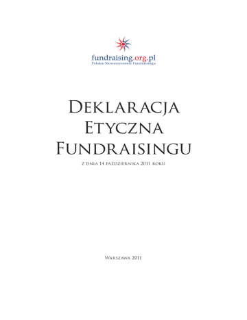 Deklar acja Etyczna Fundr aisingu z dnia 14 październik a 2011 roku Warszawa 2011 M otywowani pragnieniem służby ideałom filantropii, poświęceniu na rzecz obrony godno- ści ludzkiej i dbania o dobro wspólne przy zachowaniu różnorodności kulturalnej i pluralizmu oraz świadomi spoczywającej na nas moralnej odpowiedzialności wynikającej z pozyskiwania środków na działalność społeczną, pragnąc zdefiniować wartości, pomagające pogłębić transparentność, chronić prywatność i godność podopiecznych, a także zdobyć zaufanie społeczne i sprostać oczekiwaniom darczyńców, szanując ich prywatność, niezależność i interesy my, niżej podpisani, niniejszym przyjmujemy Deklarację Etyczną Fundraisingu i zobowiązujemy się do przestrzegania jej zasad. Rozdział 1 Zasady ogólne Art. 1. Niniejsza Deklaracja reguluje postępowanie organizacji pozarządowych, w tym ich członków, pracowników i wolontariuszy, a także zawodowych fundraiserów wykonujących czynności na ich rzecz, w zakresie pozyskiwania środków i wydatkowania ich na rzecz beneficjentów. Art. 2. Organizacje i fundraiserzy realizując cele i misje organizacji postępują zgodnie z dobrem darczyńców i beneficjentów, szanując ich godność i prywatność. Art. 3. Organizacje i fundraiserzy są moralnie odpowiedzialni za praktykę trzeciego sektora i społeczeństwa obywatelskiego oraz powinni uwzględniać ich dobro w swoim postępowaniu. Art. 4. Organizacje i fundraiserzy dbają o zaufanie do trzeciego sektora i społeczeństwa obywatelskiego oraz nie powinni postępować w sposób, który podważałby to zaufanie. Art. 5. Organizacje i fundraiserzy powinni dążyć do inspirowania innych własną postawą, w tym do postępowania innych organizacji i fundraiserów zgodnie z zasadami etyki zawartymi w niniejszej Deklaracji. Art. 6. Organizacje i fundraiserzy postępują zgodnie z zasadami prawdomówności i uczciwości. Art. 7. Organizacje i fundraiserzy postępują bezinteresownie i z poświęceniem, przedkładając cele organizacji ponad interes własny. Ich wynagrodzenia powinny być rozsądne i kształtowane zgodnie z postanowieniami niniejszej Deklaracji. Art. 8. Organizacje i fundraiserzy w sposób ciągły pogłębiają swoją wiedzę i doskonalą umiejętności praktyczne. Art. 9. Organizacje i fundraiserzy postępują zgodnie z prawem regulującym działalność organizacji pozarządowych i fundraisingu oraz działają na rzecz regulacji prawnych sprzyjających przestrzeganiu zasad etyki zawartych w niniejszej Deklaracji. Rozdział 2 Organizacje Art. 10. Organizacje, w tym ich członkowie, pracownicy i wolontariusze w zakresie pozyskiwania środków i wydatkowania ich na rzecz beneficjentów kierują się zasadami ogólnymi zawartymi w rozdziale poprzedzającym oraz zasadami zawartymi w niniejszym rozdziale. Art. 11. 1.Organizacja ma jasno sformułowaną misję i cele oraz dba, aby były one znane członkom, pracownikom, wolontariuszom i darczyńcom organizacji. Misja i cele organizacji prezentowane są w sposób łatwo dostępny w Internecie oraz w innych materiałach informacyjnych organizacji. 2 .Organizacja rzetelnie wywiązuje się ze swoich obowiązków w zakresie sprawozdawczości, w szczególności publikuje w sposób określony w ustępie poprzedzającym pełne sprawozdania merytoryczne i finansowe oraz podaje do publicznej wiadomości skład osobowy organów zarządzających i nadzorczych. Art. 12. 1.Organizacja szanuje autonomię darczyńcy, w szczególności przeznacza i wydatkuje środki zgodnie z jego wolą. 2 .Organizacja informuje darczyńców o przeznaczeniu i sposobie wydatkowania pozyskanych od niego środków oraz dokłada starań, aby wyjaśnić skutki podatkowe związane ze wsparciem organizacji. 3.Organizacja dokłada starań, aby wsparcie organizacji realizowało interes darczyńcy w zakresie, w jakim nie jest to sprzeczne z dobrem beneficjentów organizacji oraz z zastrzeżeniem art. 13 niniejszej Deklaracji. Art. 13. 1.Organizacja wydatkuje pozyskane środki w sposób oszczędny i efektywny. 2.Organizacja wybiera dostawców produktów i usług w sposób jawny i pisemnie udokumentowany, dokonując odpowiedniej archiwizacji dokumentów oraz udostępniając je do wglądu osobom do tego uprawnionym. 3.Organizacja dba, aby członkowie, pracownicy i wolontariusze organizacji nie czerpali korzyści osobistych związanych z wyborem dostawców produktów lub usług. Art. 14. Konkurencja między organizacjami odbywa się w sposób uczciwy, z zachowaniem wzajemnej życzliwości oraz gotowości do współpracy dla dobra beneficjentów. Art. 15. Organizacja dba, aby członkowie, pracownicy i wolontariusze organizacji badali na każdym etapie wykonywania czynności na rzecz organizacji, czy nie występuje konflikt interesów w jakiejkolwiek postaci. Art. 17 stosuje się odpowiednio. Rozdział 3 Fundr aiserzy Art. 16. Fundraiser jest pośrednikiem między organizacjami i darczyńcami zobowiązanym do: 1)lojalnego działania na rzecz organizacji, mającego na celu pozyskanie przez nią środków od darczyńców, 2)uwzględniania w swoim działaniu interesu darczyńców w zakresie, w jakim jest to możliwe w działaniach organizacji, w szczególności, w jakim nie jest to sprzeczne z dobrem jej beneficjentów, 3)doradzania organizacjom i darczyńcom w kwestiach zakresu i sposobów współpracy między nimi optymalnych dla dobra beneficjentów organizacji. Art. 17. 1.Fundraiser na każdym etapie wykonywania czynności na rzecz organizacji bada, czy nie występuje konflikt interesów w jakiejkolwiek postaci. 2.W przypadku stwierdzenia istnienia konfliktu interesów fundraiser informuje o tym niezwłocznie wszystkie zainteresowane podmioty oraz zaprzestaje wykonywania czynności na rzecz organizacji. 3.Konflikt interesów występuje w szczególności, gdy fundraiser lub bliska mu osoba: 1) jest osobiście lub majątkowo zainteresowany w wyniku czynności wykonywanych na rze