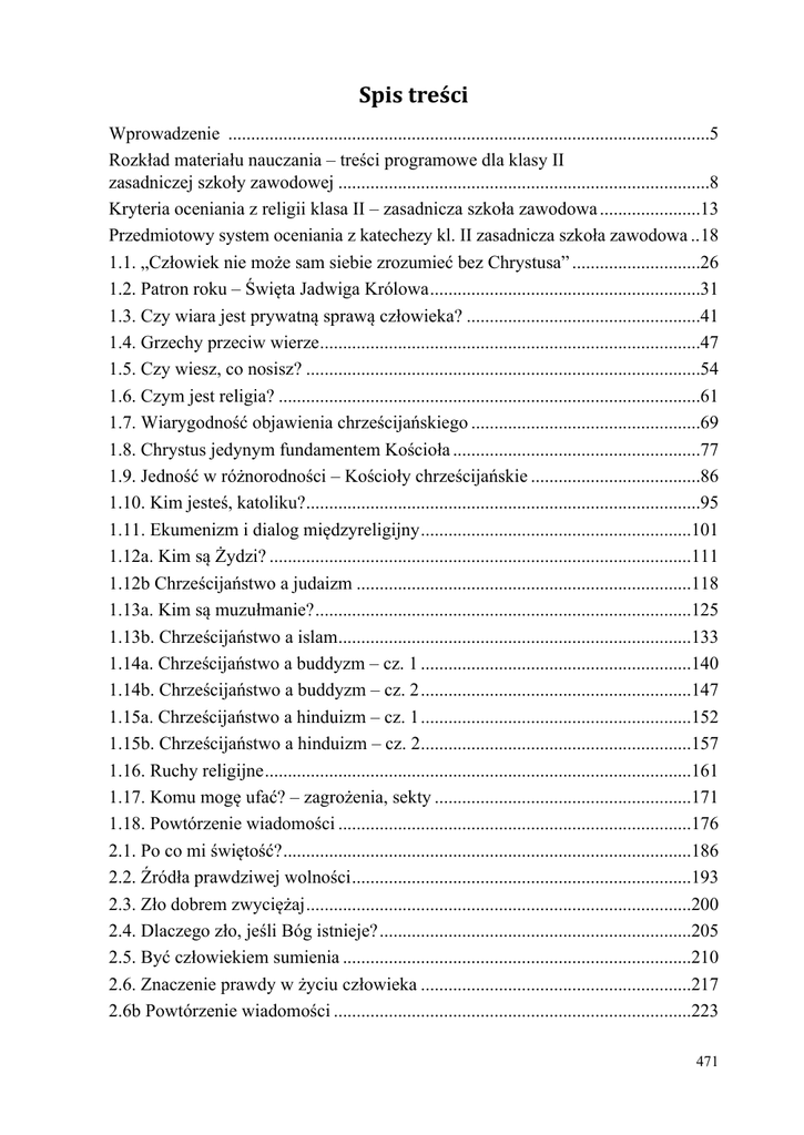 Spis treści Wprowadzenie ..........................................................................................................5 Rozkład materiału nauczania – treści programowe dla klasy II zasadniczej szkoły zawodowej..................................................................................8 Kryteria oceniania z religii klasa II – zasadnicza szkoła zawodowa.......................13 Przedmiotowy system oceniania z katechezy kl. II zasadnicza szkoła zawodowa...18 1.1. „Człowiek nie może sam siebie zrozumieć bez Chrystusa”.............................26 1.2. Patron roku – Święta Jadwiga Królowa............................................................31 1.3. Czy wiara jest prywatną sprawą człowieka?....................................................41 1.4. Grzechy przeciw wierze....................................................................................47 1.5. Czy wiesz, co nosisz?.......................................................................................54 1.6. Czym jest religia?.............................................................................................61 1.7. Wiarygodność objawienia chrześcijańskiego...................................................69 1.8. Chrystus jedynym fundamentem Kościoła.......................................................77 1.9. Jedność w różnorodności – Kościoły chrześcijańskie......................................86 1.10. Kim jesteś, katoliku?.......................................................................................95 1.11. Ekumenizm i dialog międzyreligijny............................................................101 1.12a. Kim są Żydzi?.............................................................................................111 1.12b Chrześcijaństwo a judaizm..........................................................................118 1.13a. Kim są muzułmanie?...................................................................................125 1.13b. Chrześcijaństwo a islam..............................................................................133 1.14a. Chrześcijaństwo a buddyzm – cz. 1............................................................140 1.14b. Chrześcijaństwo a buddyzm – cz. 2............................................................147 1.15a. Chrześcijaństwo a hinduizm – cz. 1............................................................152 1.15b. Chrześcijaństwo a hinduizm – cz. 2............................................................157 1.16. Ruchy religijne..............................................................................................161 1.17. Komu mogę ufać? – zagrożenia, sekty.........................................................171 1.18. Powtórzenie wiadomości..............................................................................176 2.1. Po co mi świętość?..........................................................................................186 2.2. Źródła prawdziwej wolności...........................................................................193 2.3. Zło dobrem zwyciężaj.....................................................................................200 2.4. Dlaczego zło, jeśli Bóg istnieje?.....................................................................205 2.5. Być człowiekiem sumienia.............................................................................210 2.6. Znaczenie prawdy w życiu człowieka............................................................217 2.6b Powtórzenie wiadomości...............................................................................223 471 2.7. Kultura bycia i słowa......................................................................................229 2.8. Między sztuką, profanacją a kiczem...............................................................236 2.9. Wartość pracy.................................................................................................248 2.10. Kultura bycia na drodze................................................................................254 2.11. Czas odpoczynku..........................................................................................259 2.12. Czy Kościół ma prawo „mieszać się” do polityki?.......................................266 2.13. Zasady życia społecznego.............................................................................274 2.14. Kościół wobec wojny i terroryzmu...............................................................282 2.15. Powtórzenie wiadomości..............................................................................290 3.1. Wyprawy krzyżowe........................................................................................295 3.2. Inkwizycja.......................................................................................................303 3.3. Historia Galileusza..........................................................................................309 3.4. Reformacja i Sobór Trydencki........................................................................315 3.5. Jan Paweł II o grzechach Kościoła.................................................................320 3.6. Nauczanie społeczne papieży.........................................................................328 3.7. Wiosna Kościoła. Sobór Watykański II..........................................................341 3.8. Co Polska i świat zawdzięczają chrześcijaństwu?..........................................349 3.9. Być patriotą dzisiaj.........................................................................................354 3.9b. Powtórzenie wiadomości..............................................................................362 4.1. Śmierć narodzinami dla nieba.........................................................................370 4.2. Dla kogo niebo?.............